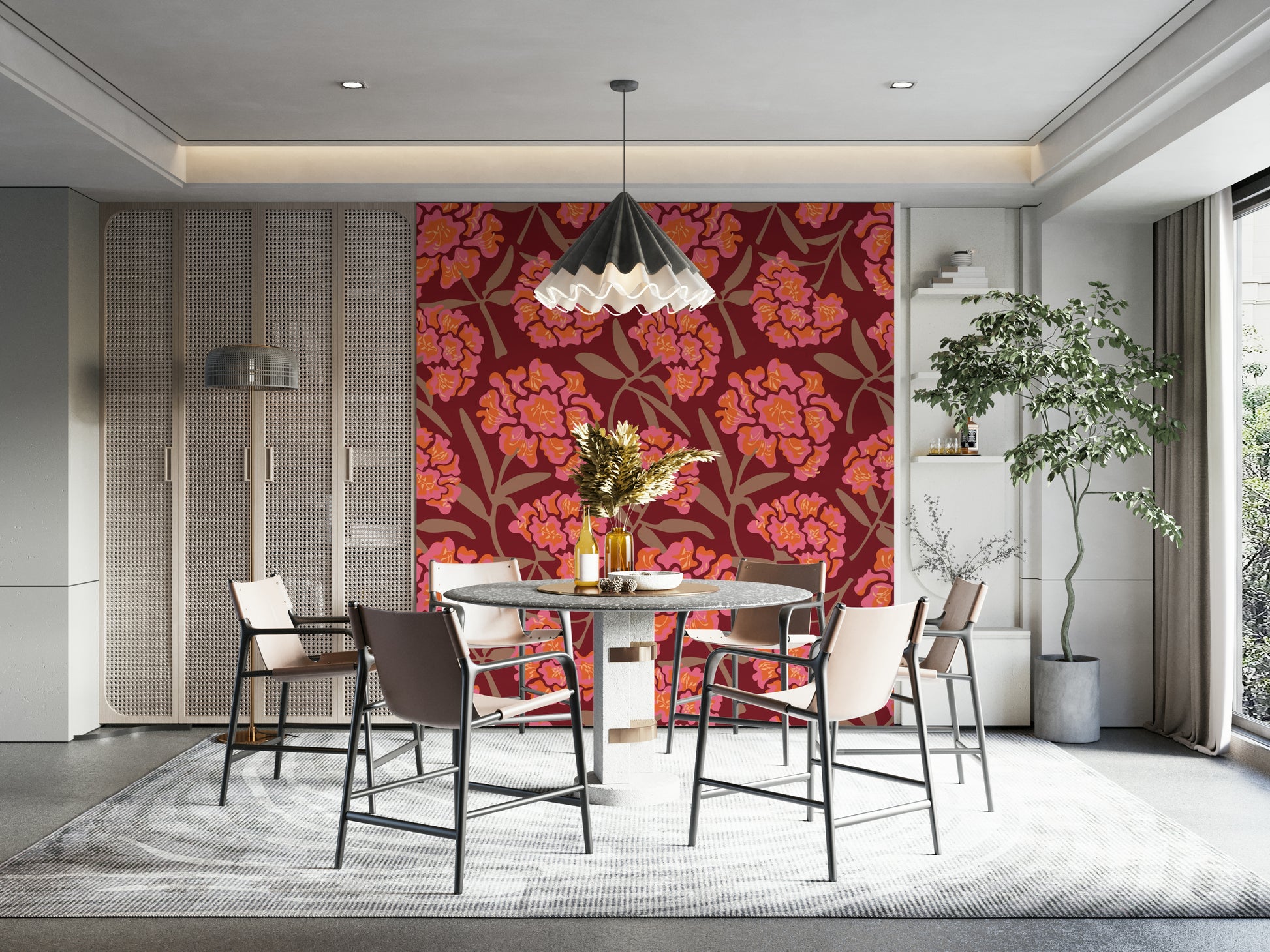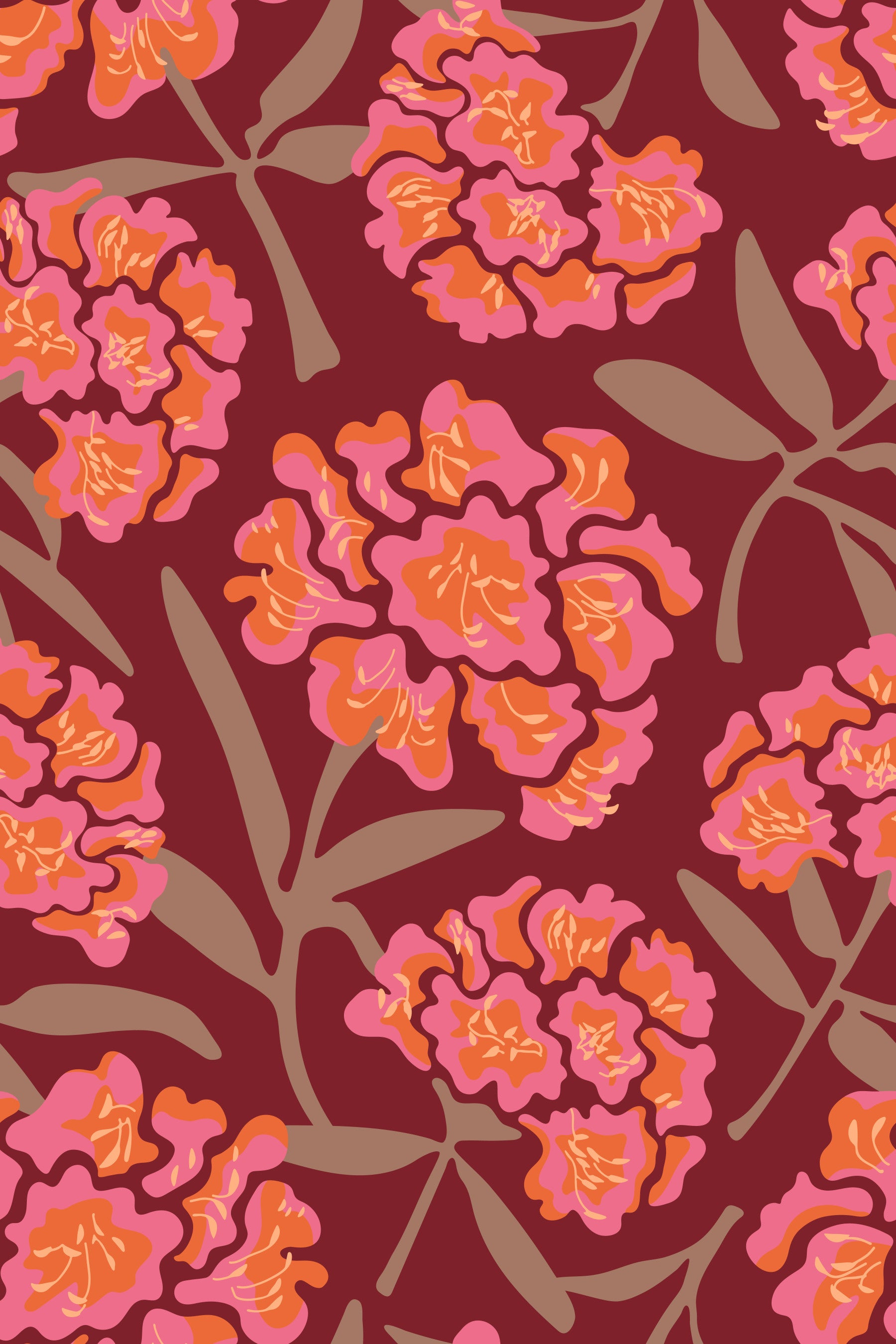 Indulge in the rich, velvety texture of "Rhododendrons Floral Mocha Mousse Red." This captivating wallpaper design features stylized rhododendron blooms in vibrant shades of Pink, Orange and Mocha Mousse Brown on a deep burgundy Wine Red background. The blossoms, rendered in a bold, almost abstract style, create a luxurious and sophisticated atmosphere, perfect for adding a touch of elegance and warmth to any space. This pattern design is also available in Other Colourways too! Original wallpaper pattern design by Jackie Tahara of UnBlink Studio.