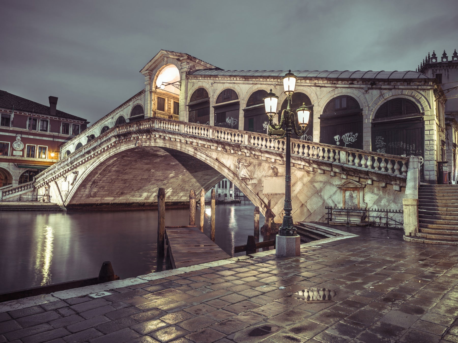 Rialto Bridge at night, Venice, Italy. Immerse yourself in the timeless beauty of Venice with this stunning wallpaper featuring the iconic Rialto Bridge. Captured under a serene twilight sky, the bridge's majestic arches and intricate details are accentuated by the soft, warm glow of the street lamps. The tranquil waters of the Grand Canal reflect the bridge's silhouette, creating a mesmerizing visual symphony. The image evokes a sense of history and romance, inviting you to wander through the cobblestone streets and experience the magic of Venice from the comfort of your screen. The play of light and shadow adds depth and dimension, making this wallpaper a captivating addition to any device. Perfect for those who dream of gondola rides and exploring the hidden gems of this enchanting city. Let the Rialto Bridge transport you to a world of timeless elegance and Venetian charm.
