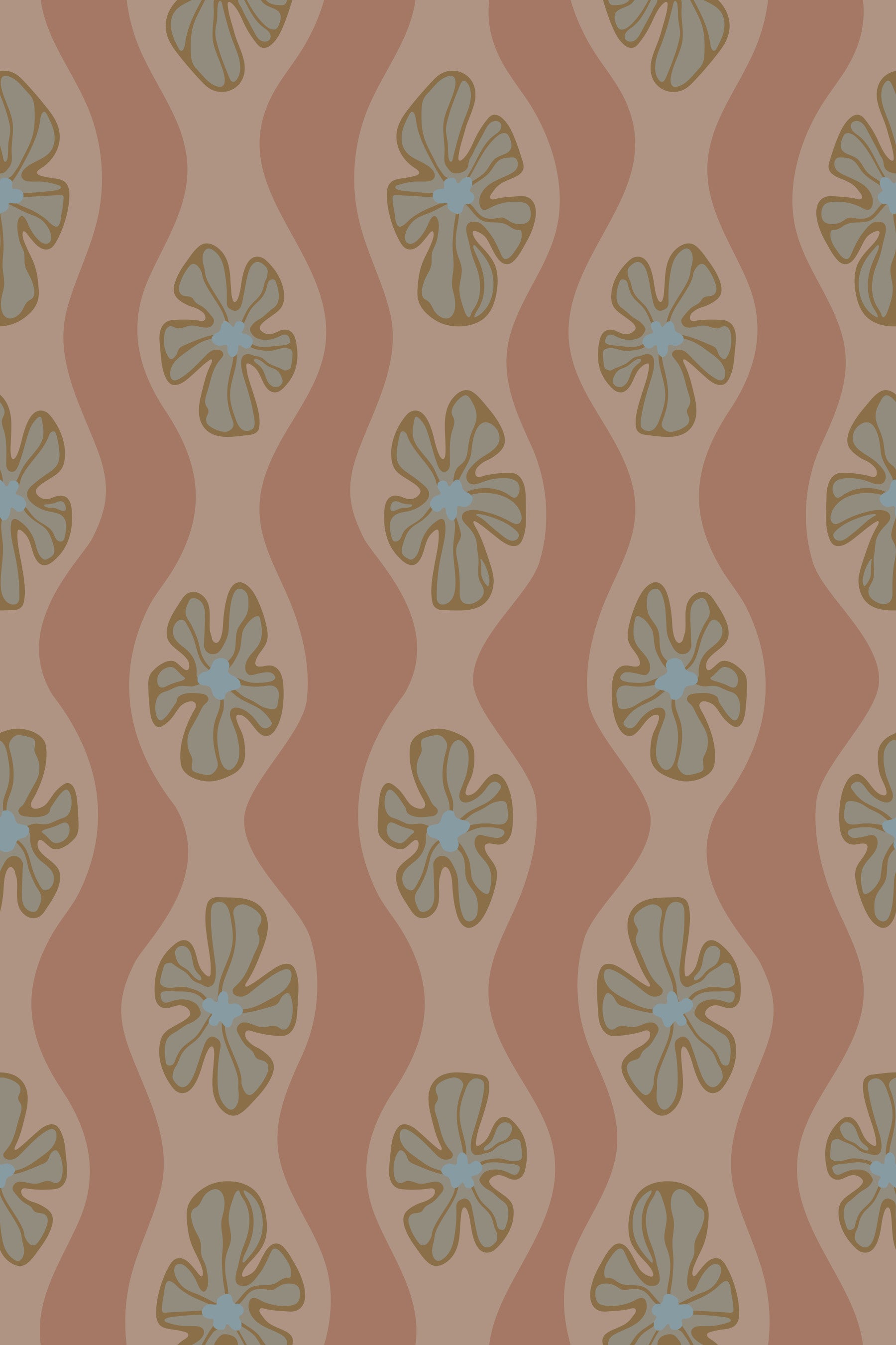 Dive into the warm embrace of this retro floral with wavy stripes wallpaper. This wallpaper marries Mid Century Modern style with a Mocha Mousse earth tone palette, creating a soothing yet stylish backdrop. Wavy stripes elegantly ripple through the design, interspersed with stylized retro floral motifs in neutral tones, each flower boasting a delicate hint of sky blue. The overall effect is reminiscent of vintage textiles, bringing a touch of nostalgic charm and understated sophistication to any space. Perfect for those seeking a retro-inspired, calming and warming wallpaper. This pattern design is also available in Other Colourways too! Original wallpaper pattern design by Jackie Tahara of UnBlink Studio.