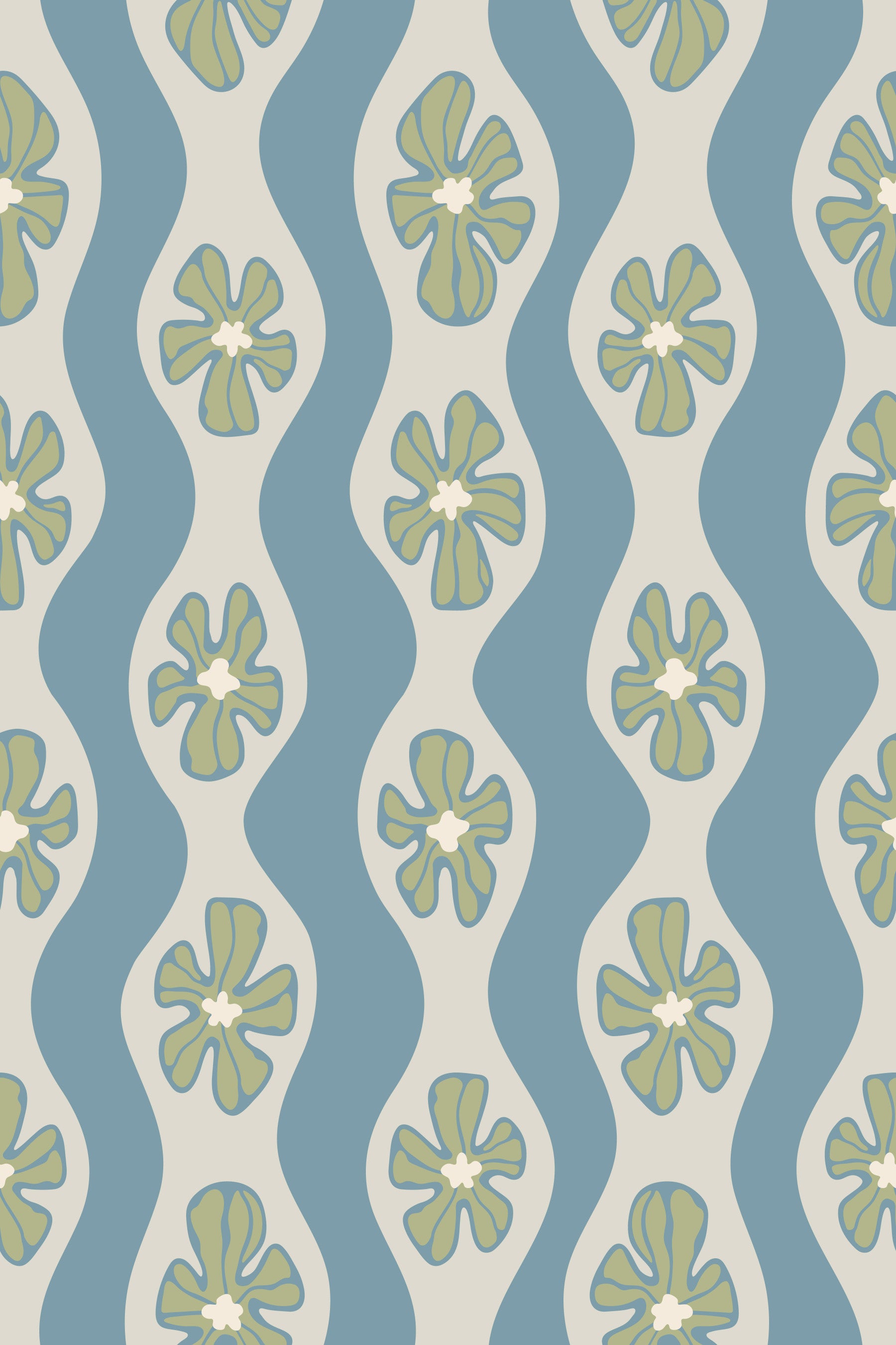 Transport yourself to a breezy cottage with this retro floral and wavy striped wallpaper. The Mid Century Modern influence is evident in the playful, abstract floral motifs rendered in soft, muted sage green and light gray, on a soft light blue background. Wavy stripes create a subtle sense of movement, lending a touch of whimsy to the design. This wallpaper evokes a feeling of calm and serenity, perfect for creating a relaxing and inviting atmosphere in any room. The cottagecore palette and flowing lines make it a charming addition to a vintage-inspired or contemporary space. This pattern design is also available in Other Colourways too! Original wallpaper pattern design by Jackie Tahara of UnBlink Studio.