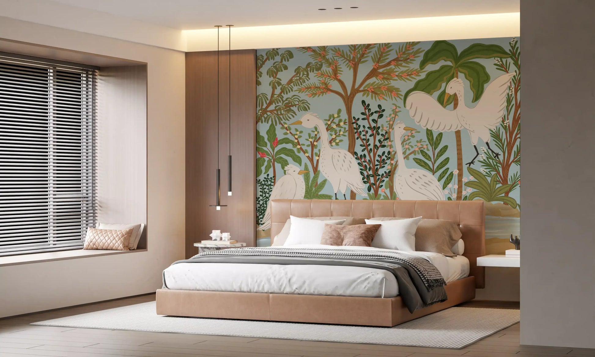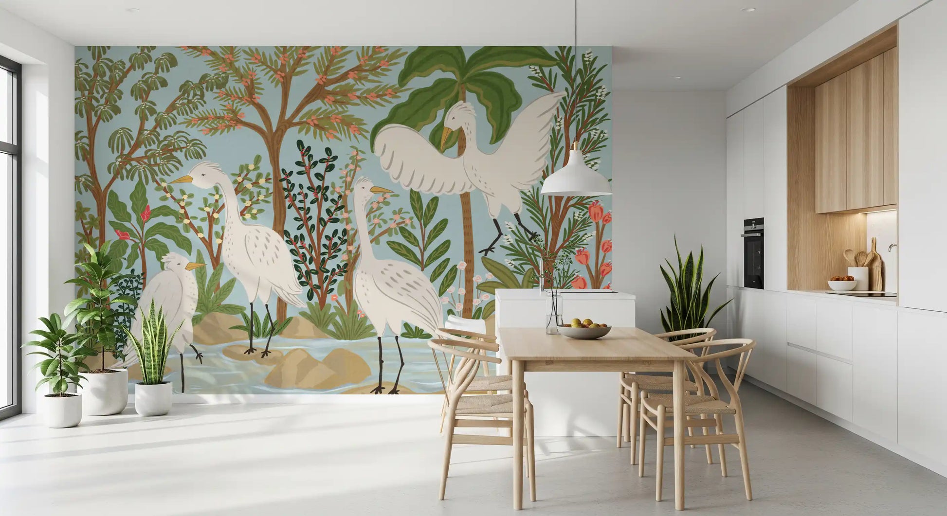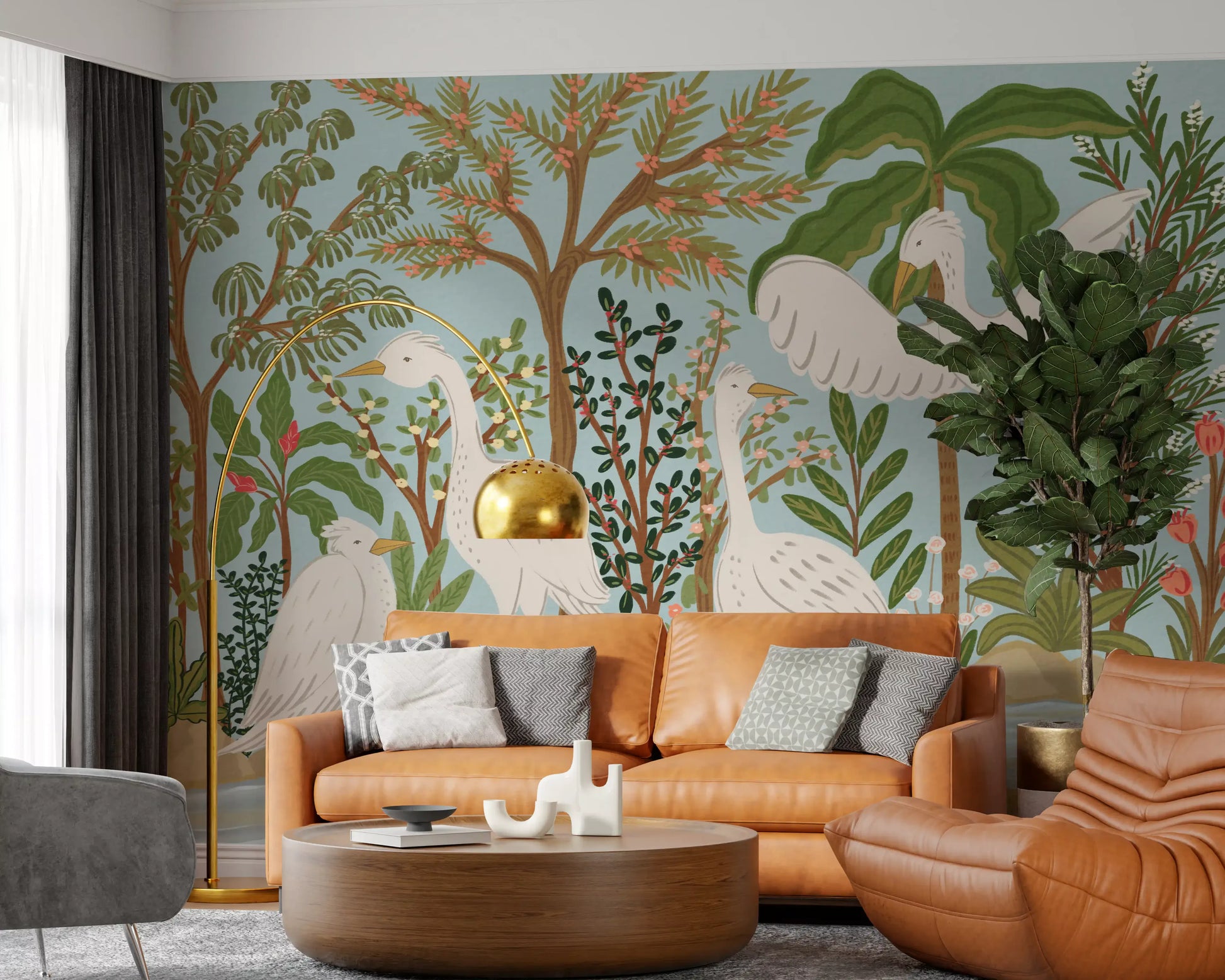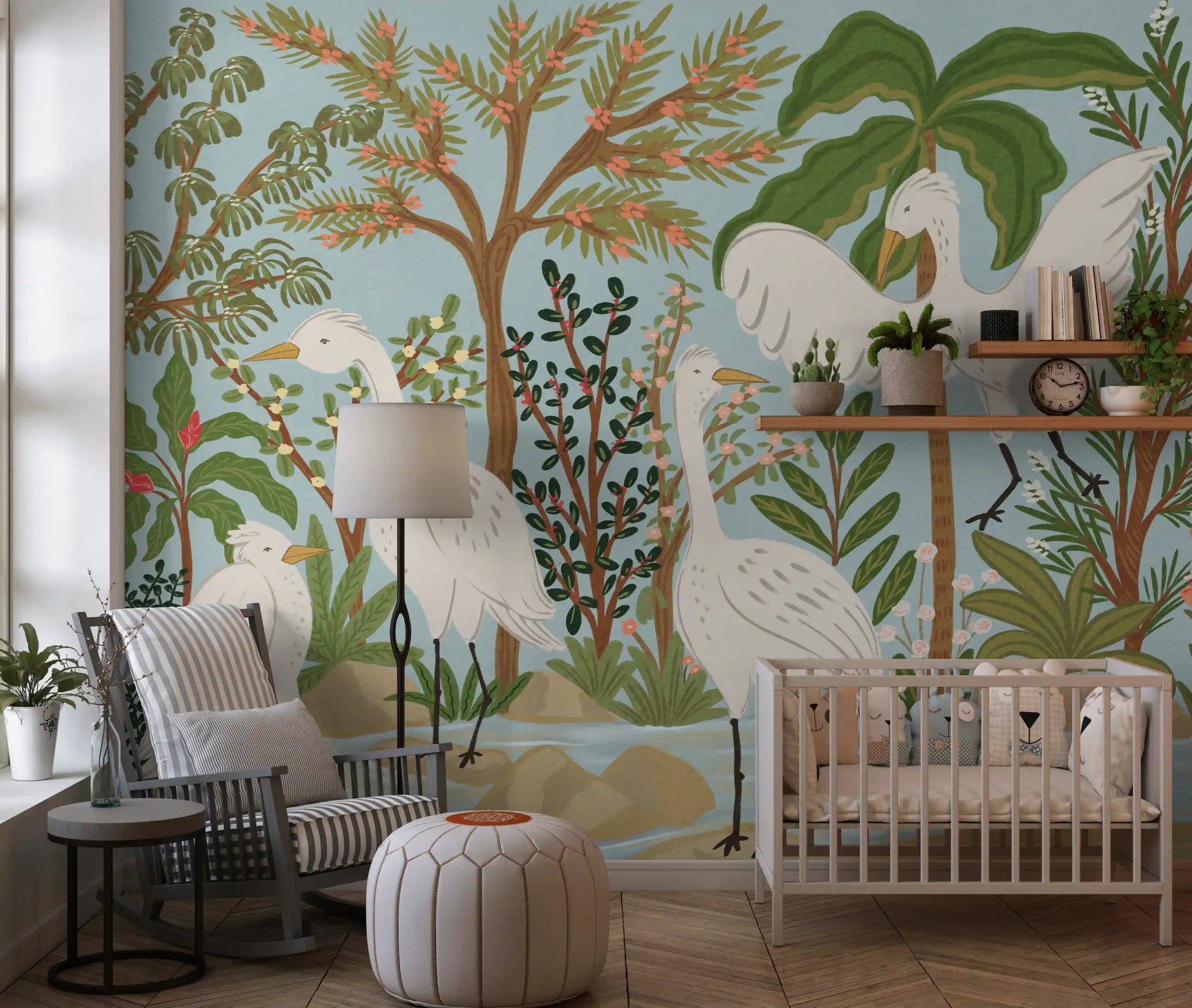 This enchanting wallpaper for walls transforms any room into a tranquil oasis. Elegant white egrets gracefully wade and soar amidst a lush, stylized jungle landscape. Vibrant green foliage, adorned with delicate pink and cream blossoms, frames the scene against a calming sky blue and gentle river. Earthy brown tree trunks and smooth river stones ground the serene composition. The hand-drawn illustration style adds a charming, artistic touch. This design infuses living rooms, bedrooms, or nurseries with a sense of calm and natural beauty. It creates a serene backdrop, inviting relaxation and peaceful contemplation, perfectly complementing a light and airy interior style. This charming print enhances spaces with its gentle movement and harmonious natural elements.