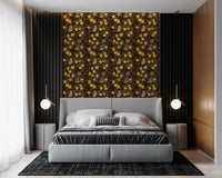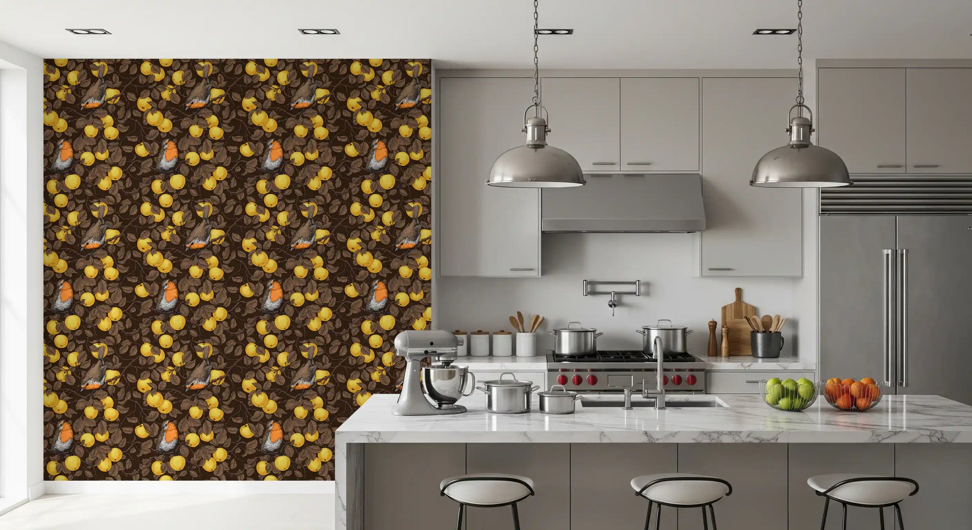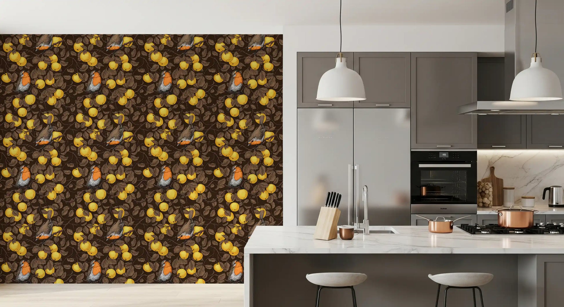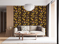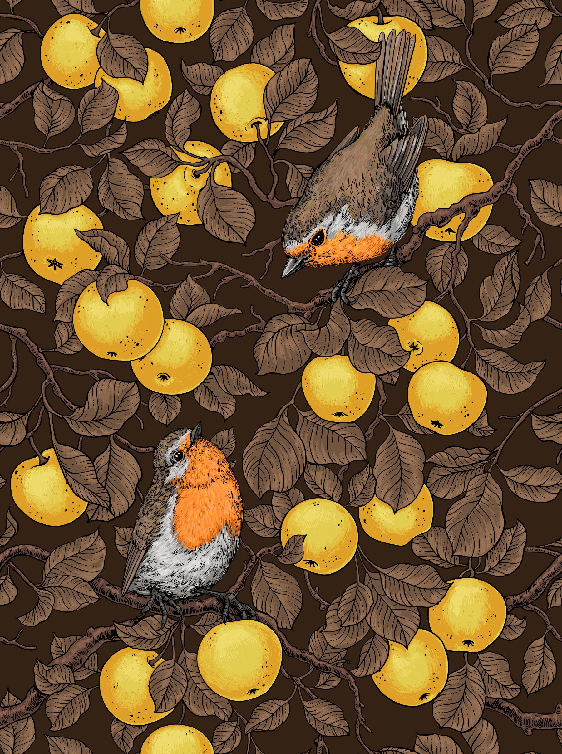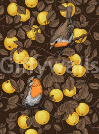 Robins in the apple tree/yellow and dark brown Wallpaper⁠