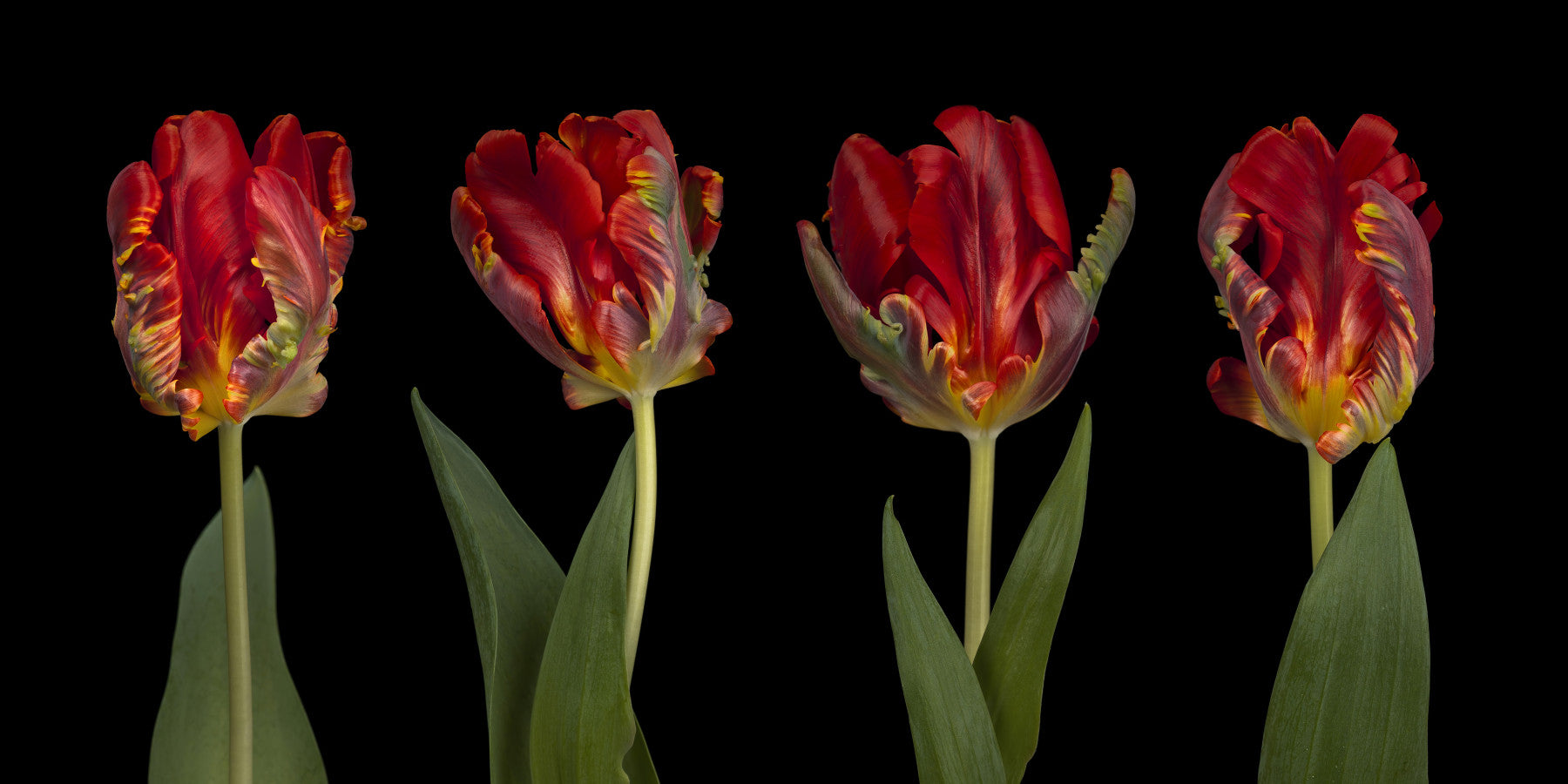 The Rococo Tulips Wall Mural gives your home a dramatic, floral look. This mural wallpaper showcases a series of unique, ruffled tulips in rich shades of red and yellow against a dark background. The detailed petals and vibrant colors create a feeling of sophisticated beauty and artistic style. It's a simple way to give your space a powerful and elegant focal point. This high-quality wallpaper for walls is ideal for a living room, dining area, or bedroom.