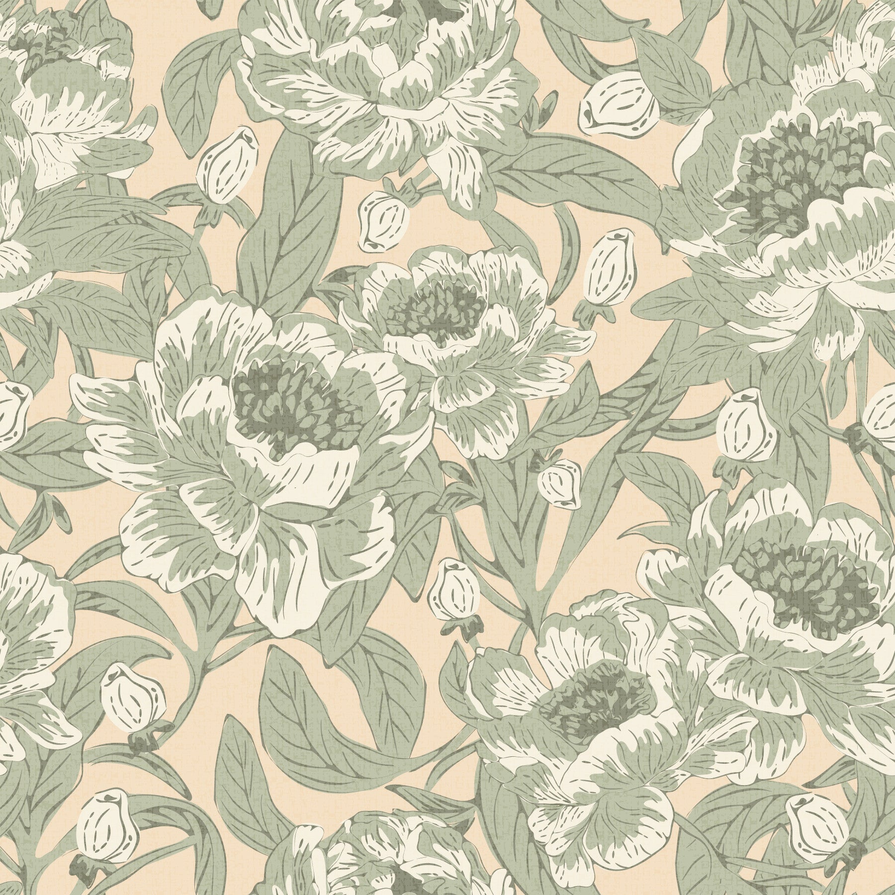Indulge in the serene beauty of 'Romantic Peonies Sage Green,' a wallpaper design that evokes a sense of tranquil elegance. Delicate sage green peonies, rendered with a soft, textured touch, bloom across a warm, neutral background. The design features a charming blend of fully opened peonies and tightly closed buds, creating a dynamic yet harmonious floral pattern. Subtle variations in shading add depth and realism to the blooms, while the textured background contributes a sense of vintage charm. Perfect for creating a romantic and calming atmosphere in any space.