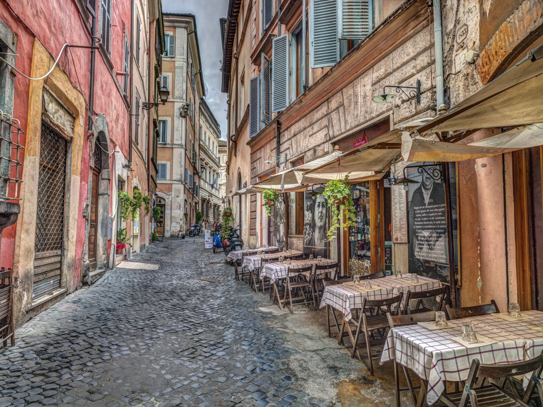Coffee shop on narrow street of Rome, Italy. Bring the charm of an Italian cafe to your space with this captivating image. The wallpaper for walls showcases a quaint cobblestone street lined with inviting outdoor tables. The rustic buildings, painted in soft pinks and peaches, create a warm and welcoming ambiance. This design brings a relaxed and inviting feel to dining rooms, kitchens, or hallways. The detailed architecture and cozy setting will transport you to the heart of Rome.