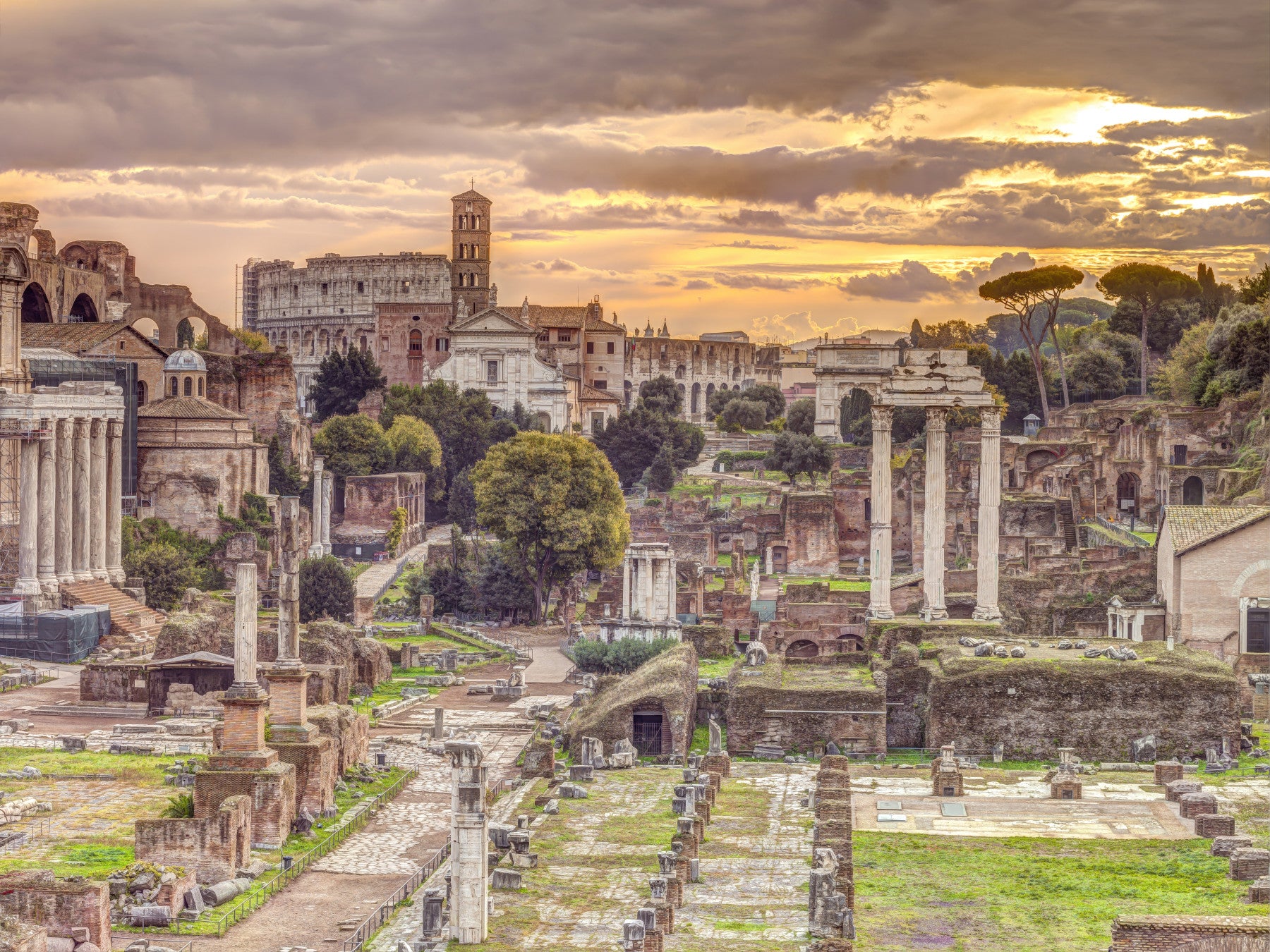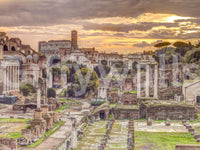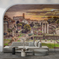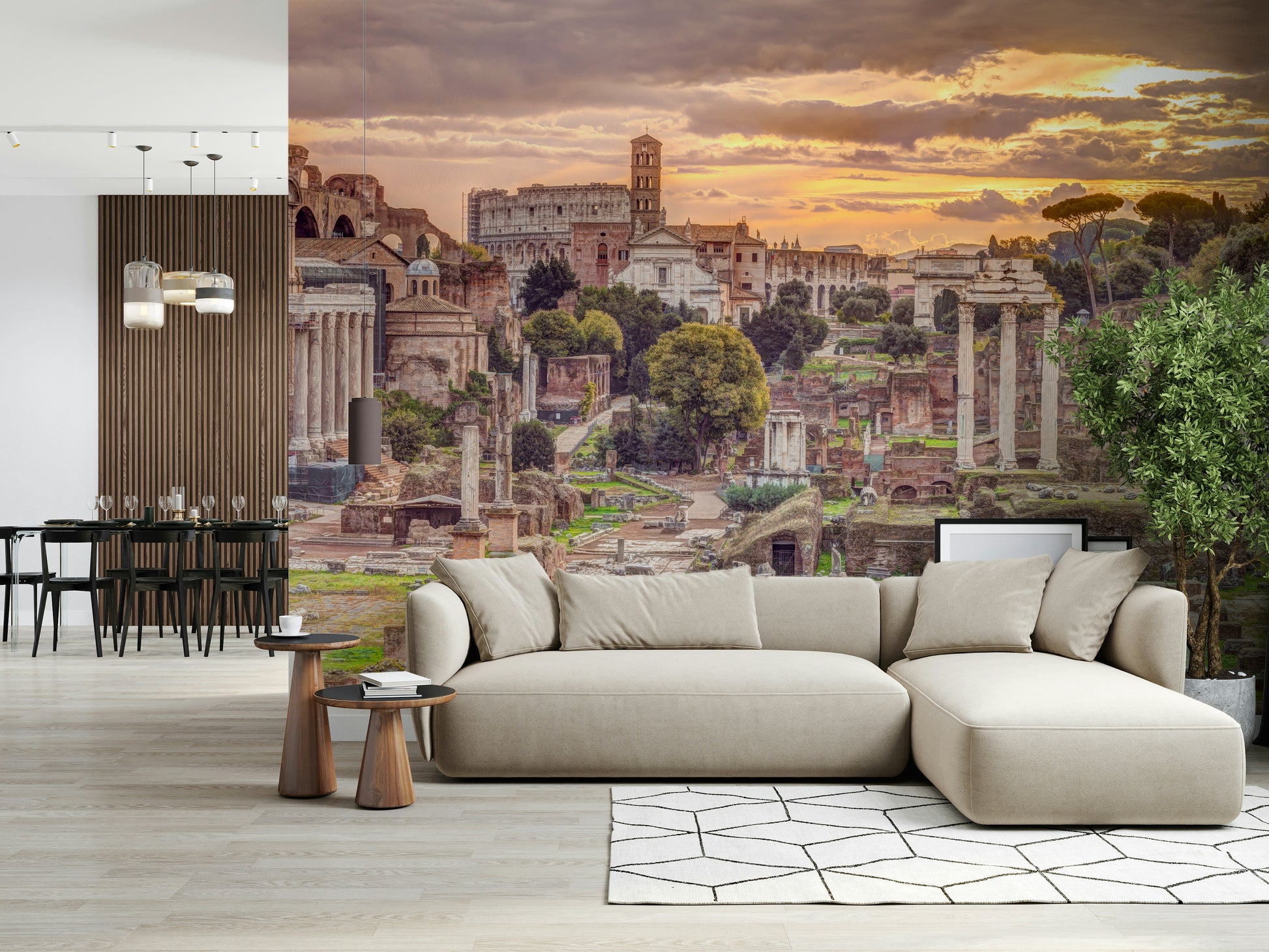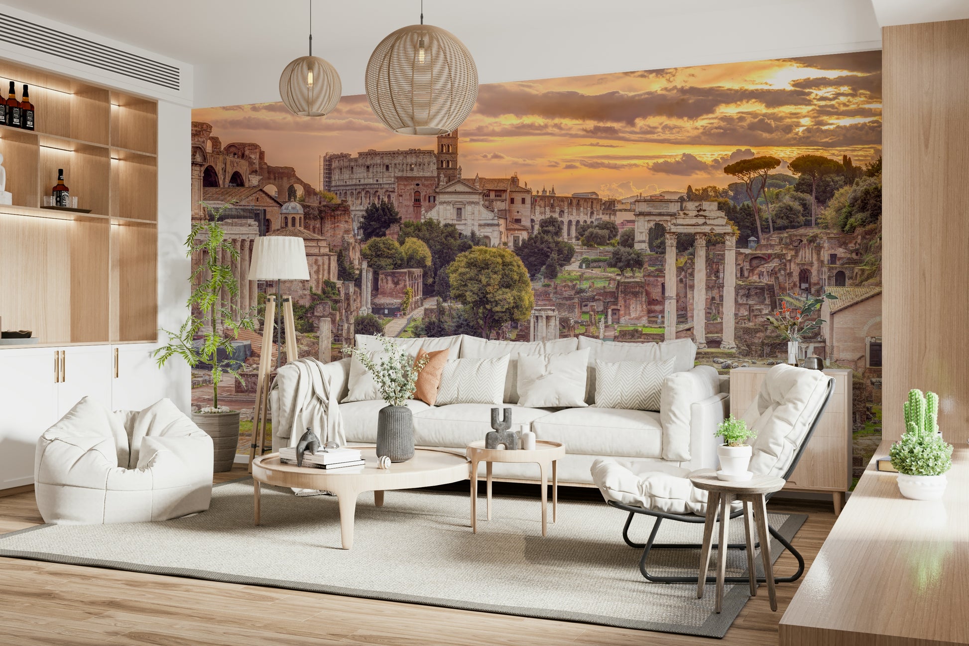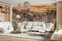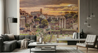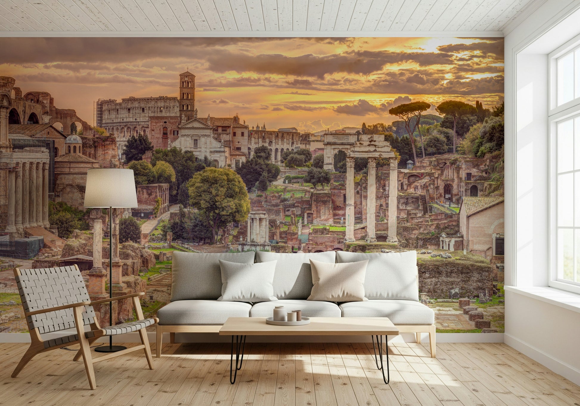 Ruins of the Roman Forum, Rome, Italy. Step back in time with this enchanting view of Rome. The sunset casts a warm glow on historic ruins like the Colosseum. This wallpaper for walls offers a timeless charm, perfect for a living room or study. The neutral tones blend seamlessly with various design schemes. Imagine the historical elegance this design will bring into your interior. Add depth and character by showcasing history's artistry.