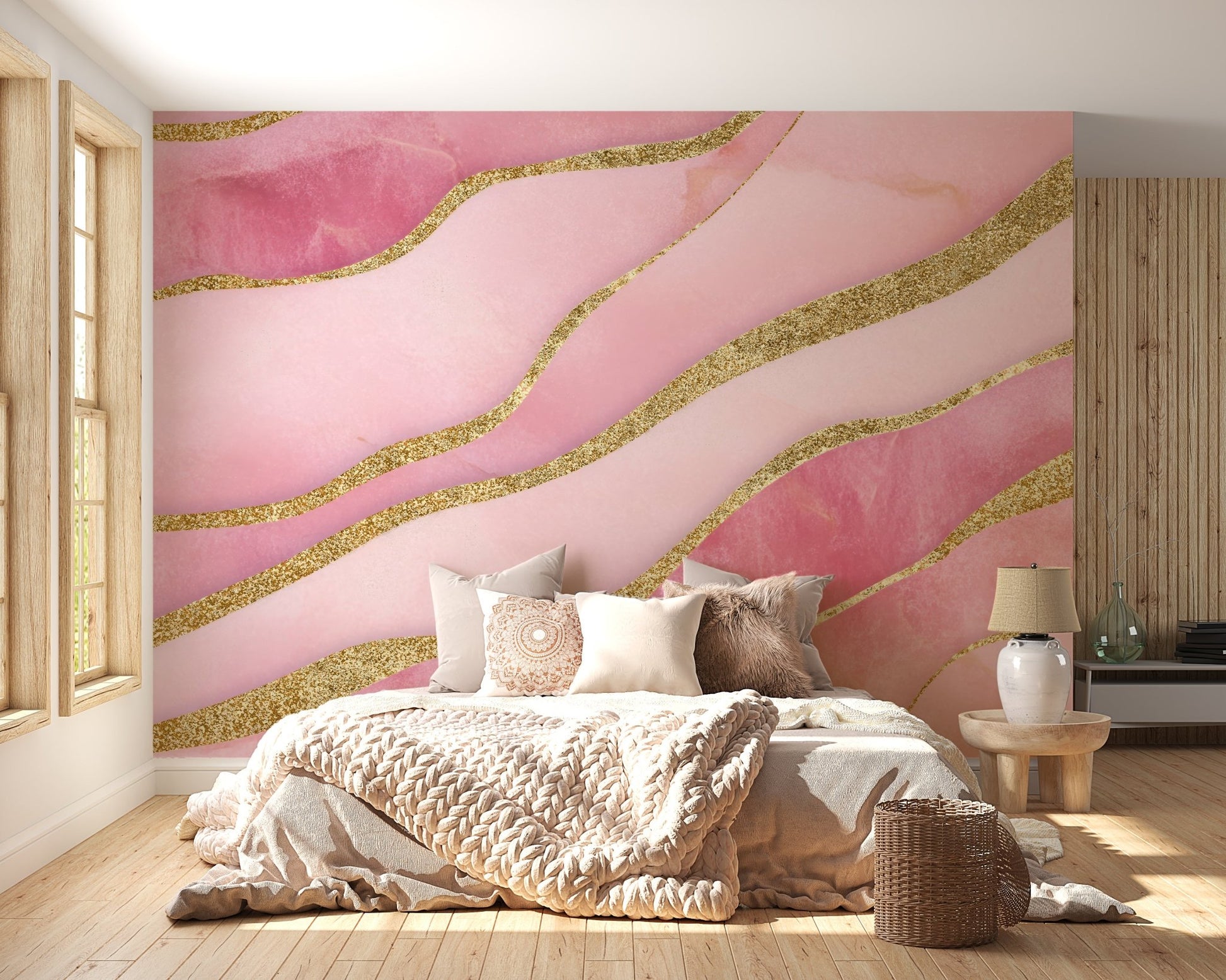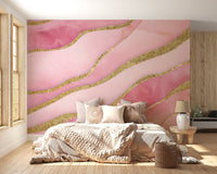 Indulge in the ethereal beauty of this abstract wallpaper. Gentle rivers of rose and blush pink flow serenely, edged by sparkling gold contours. The effect mimics the natural patterns of rose quartz, lending an air of understated luxury and feminine charm. This design brings warmth and soothing vibes to any room, creating a calming backdrop perfect for bedrooms, living rooms, or even a glamorous bathroom. Let the soft hues and subtle shimmer elevate your space with a touch of refined elegance.
