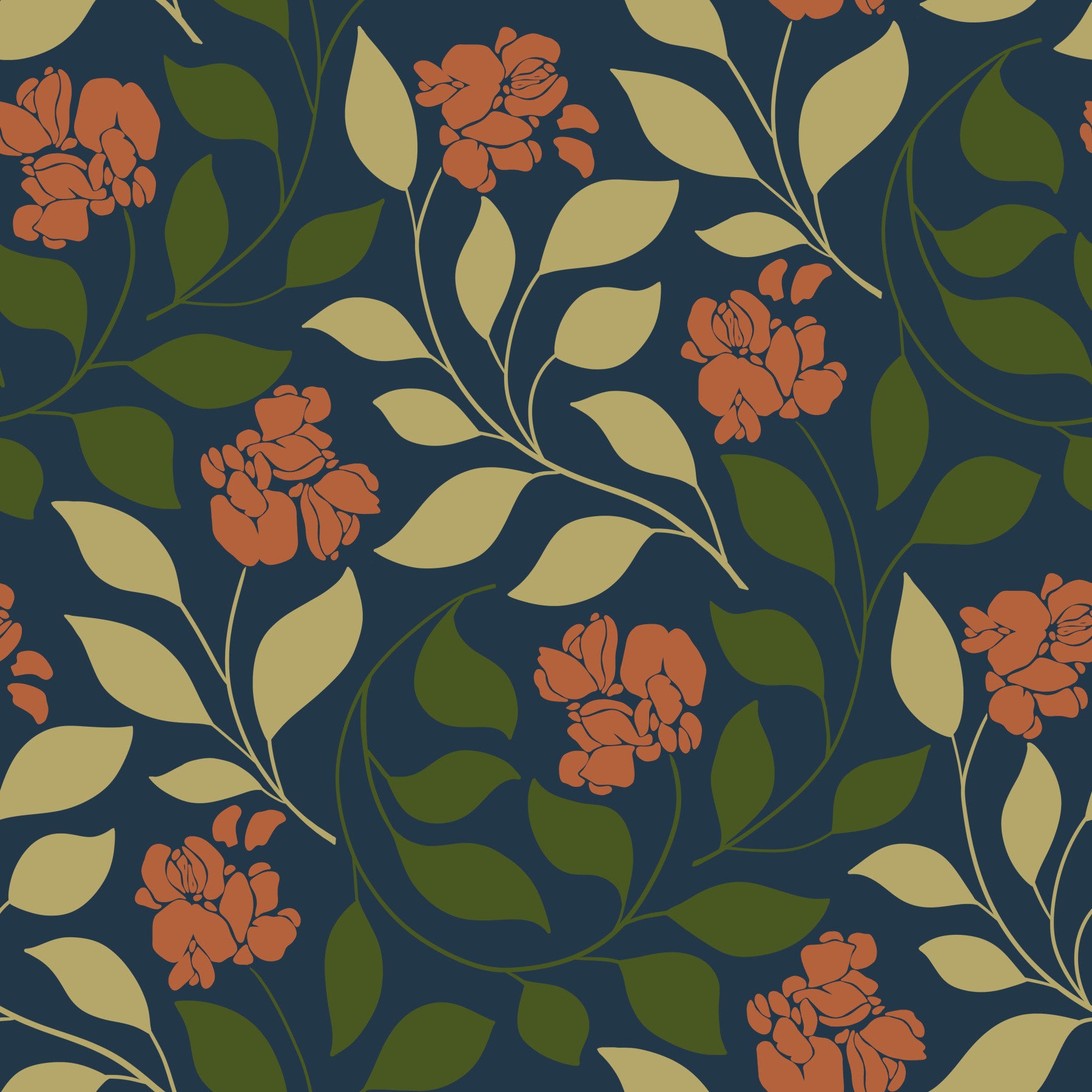 Bring a touch of timeless elegance to your home with this Vintage Bloom wallpaper for walls. The design showcases a captivating floral pattern with gentle curves and muted tones. Orange flowers, beige and green foliage elegantly intertwine against a deep blue background, creating an ambiance of calm sophistication. Perfect for bedrooms, living rooms, or dining areas, this pattern establishes a cozy, inviting feel. Elevate your interiors effortlessly with this statement piece.