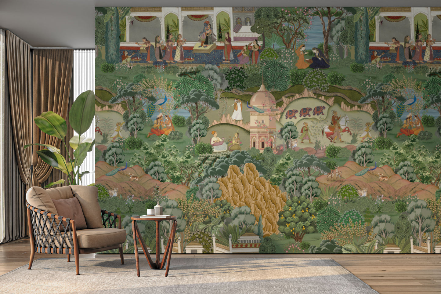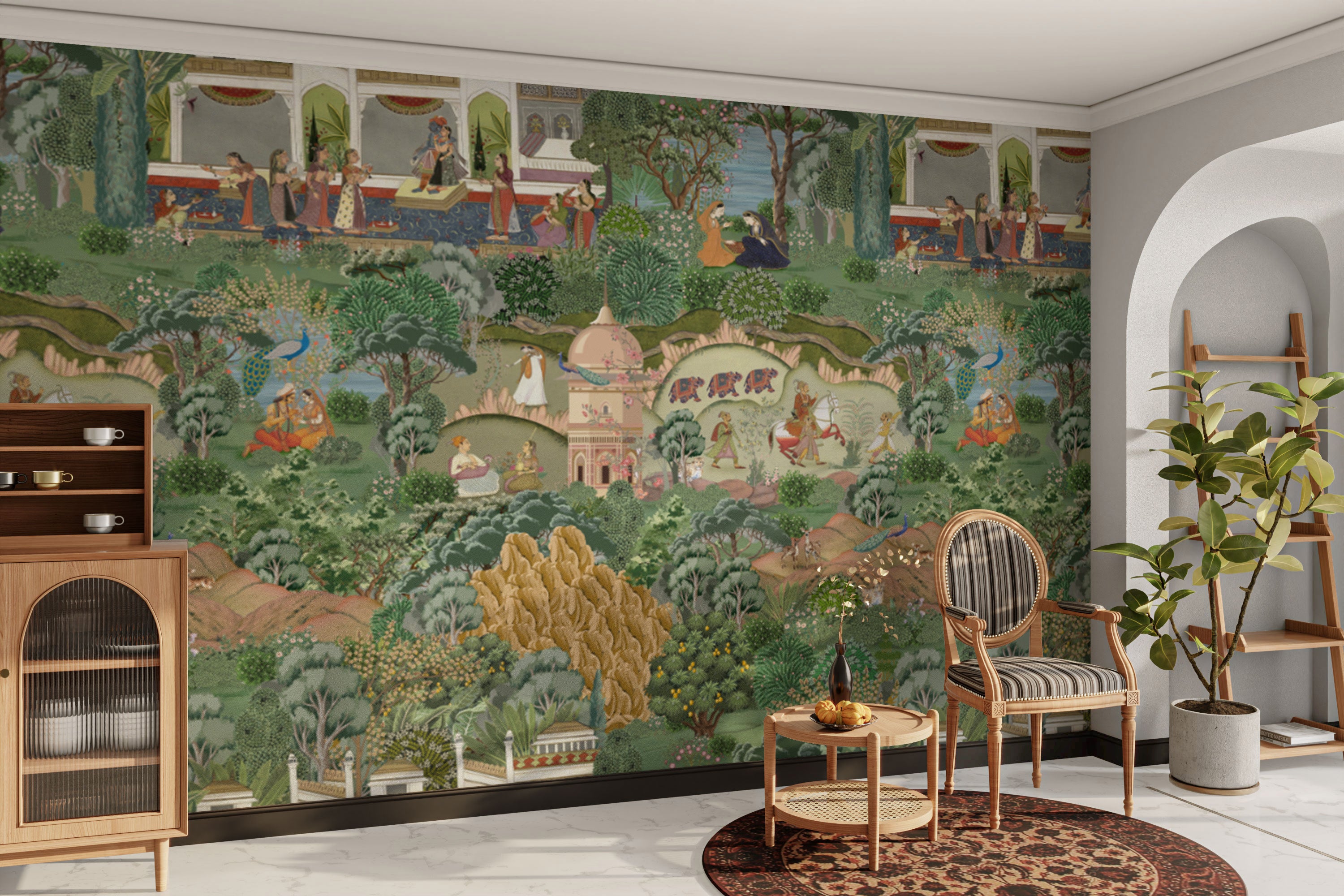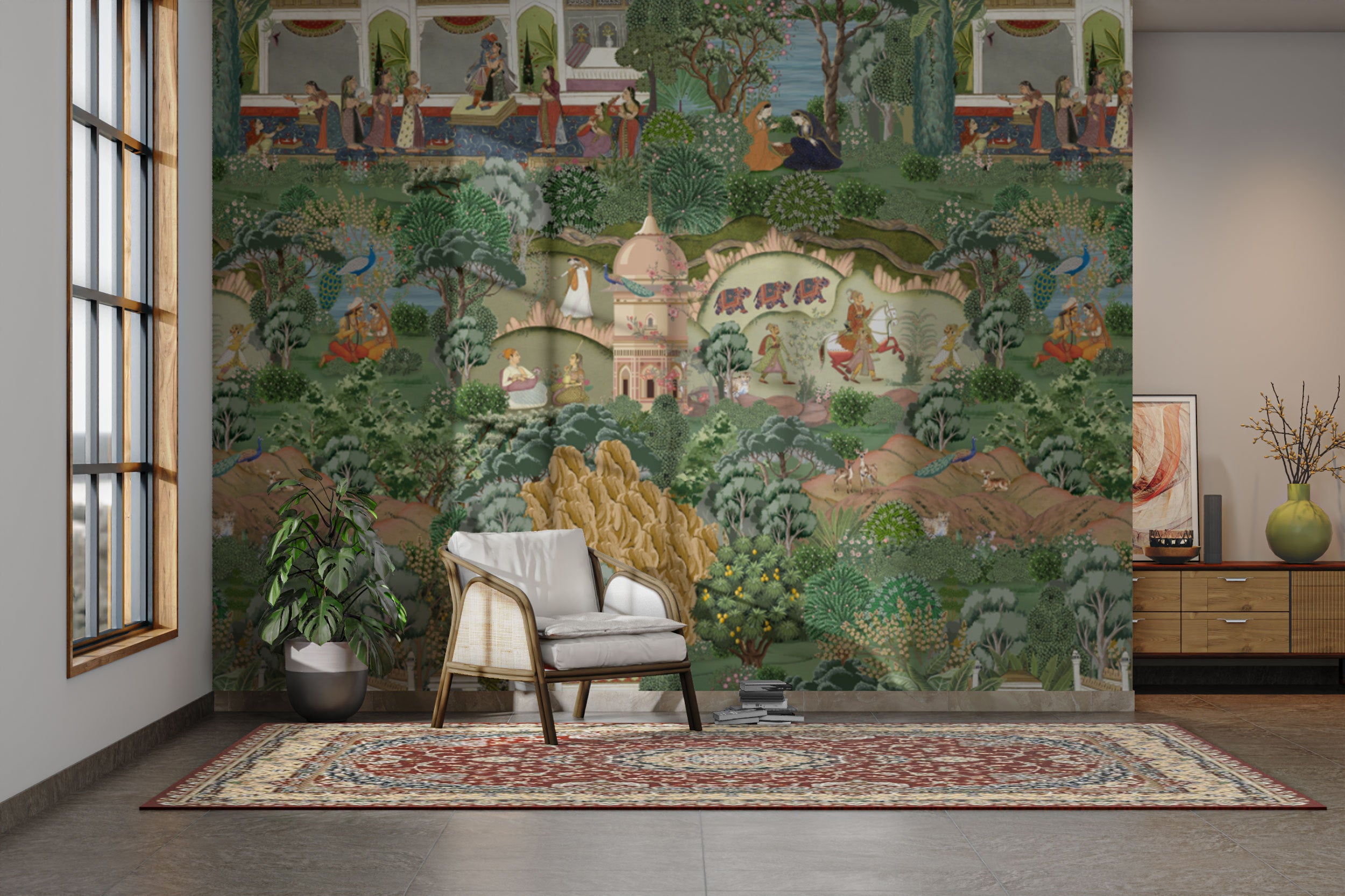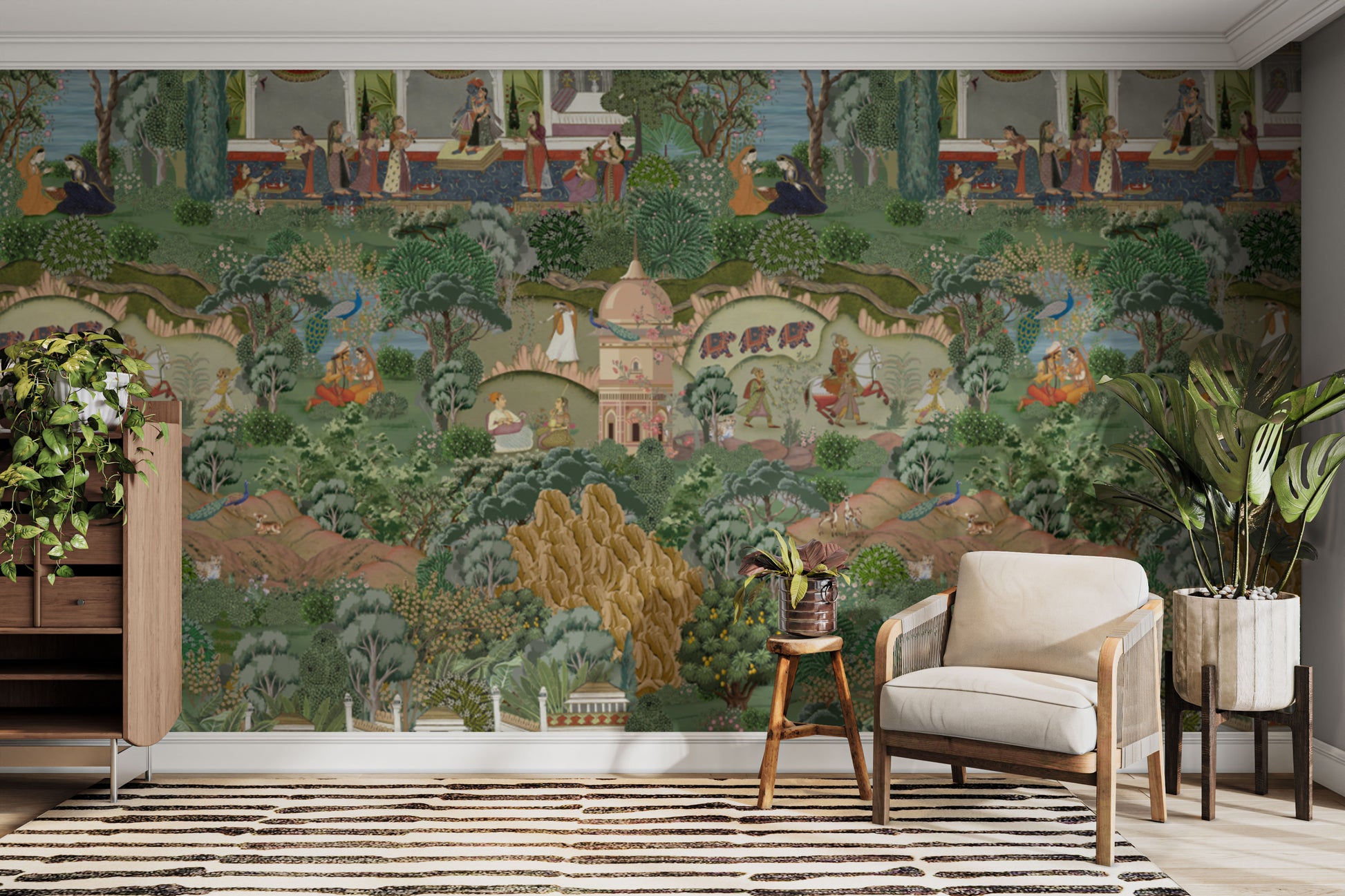 Celebrate the spirit of Indian heritage with this Royal Baraat Tales Wallpaper. Showcasing a grand procession through lush landscapes, this mural features royal figures, traditional musicians, dancers, and elephants painted in intricate detail. The rich storytelling reflects scenes from a regal wedding celebration, making it ideal for cultural spaces, pooja rooms, or feature walls. Earthy tones and fine patterns add warmth and visual interest without overwhelming the space. Printed on premium-quality material with non-toxic inks, this heritage wallpaper design brings a timeless Indian charm to your interiors while preserving the essence of age-old traditions and celebrations.