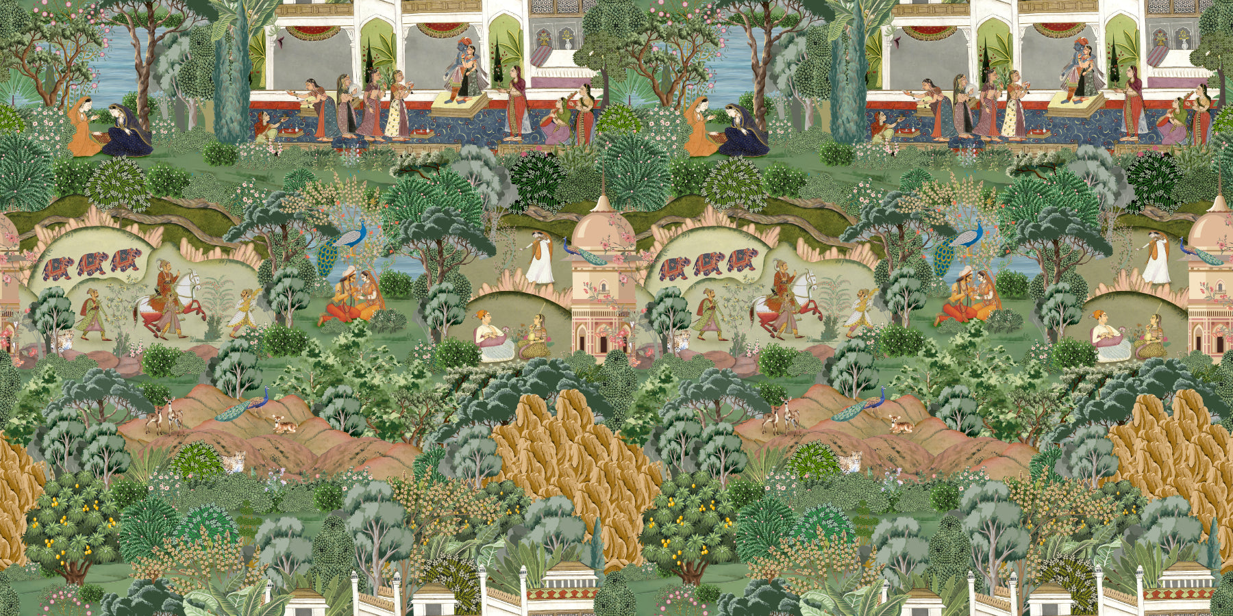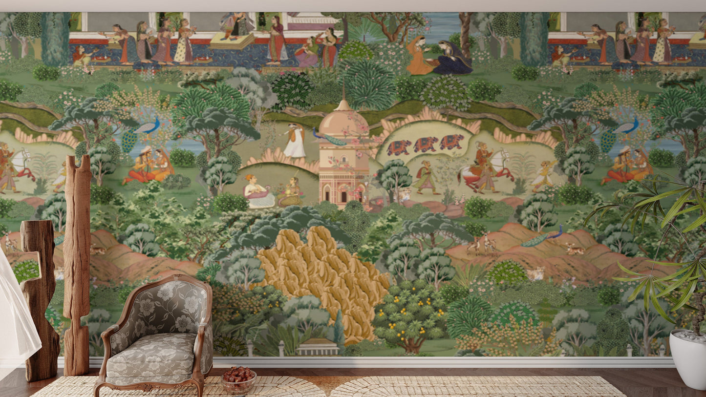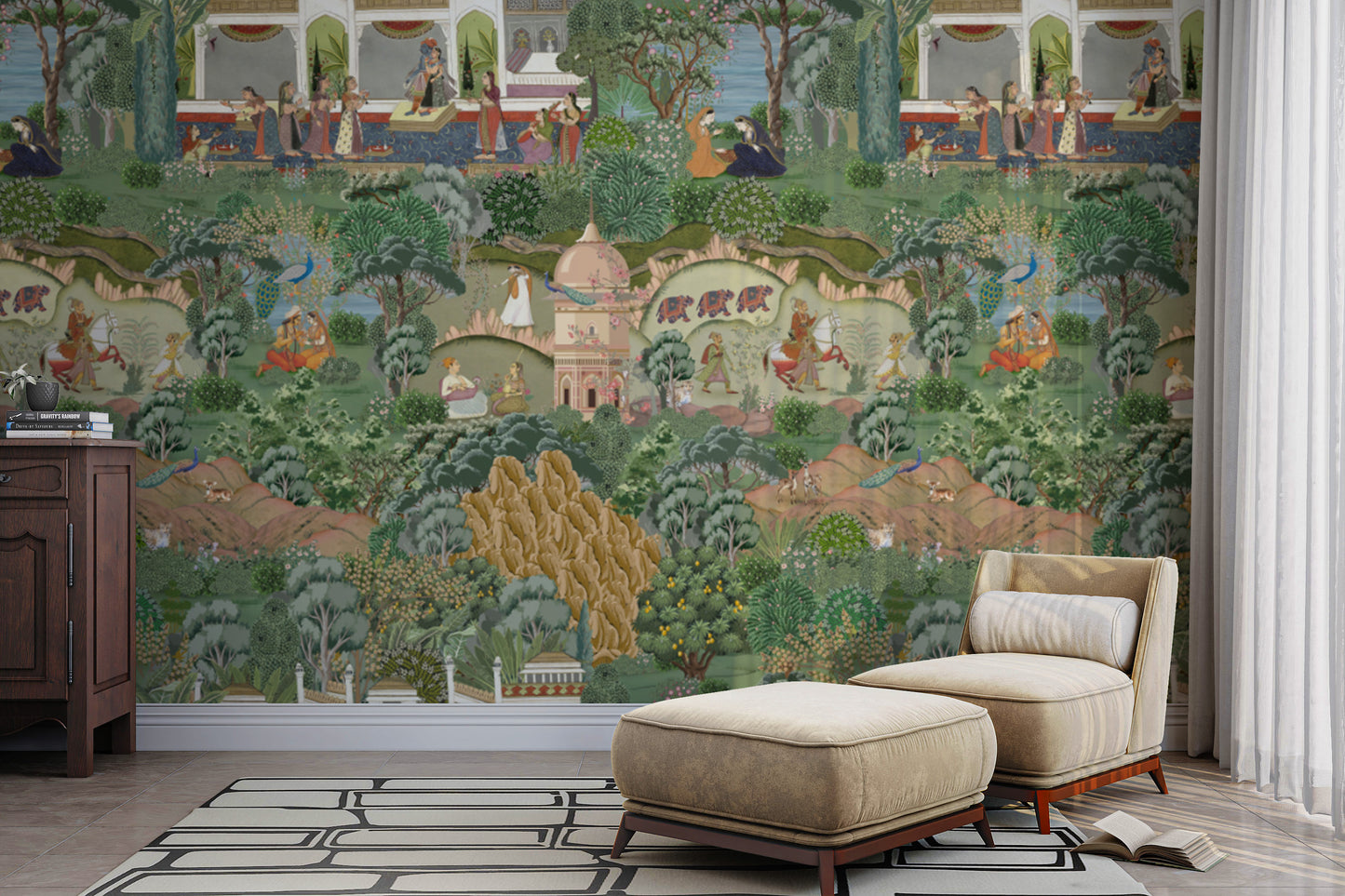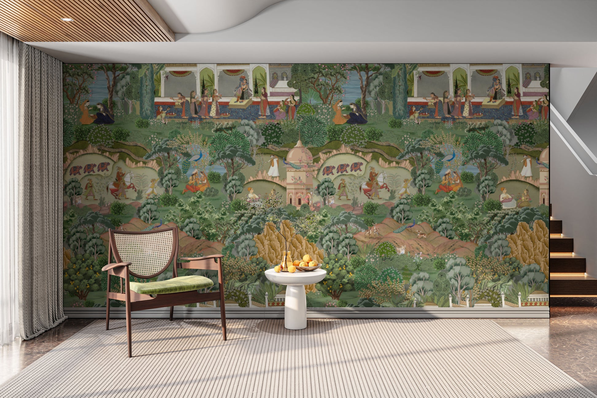 Celebrate the spirit of Indian heritage with this Royal Baraat Tales Wallpaper. Showcasing a grand procession through lush landscapes, this mural features royal figures, traditional musicians, dancers, and elephants painted in intricate detail. The rich storytelling reflects scenes from a regal wedding celebration, making it ideal for cultural spaces, pooja rooms, or feature walls. Earthy tones and fine patterns add warmth and visual interest without overwhelming the space. Printed on premium-quality material with non-toxic inks, this heritage wallpaper design brings a timeless Indian charm to your interiors while preserving the essence of age-old traditions and celebrations.
