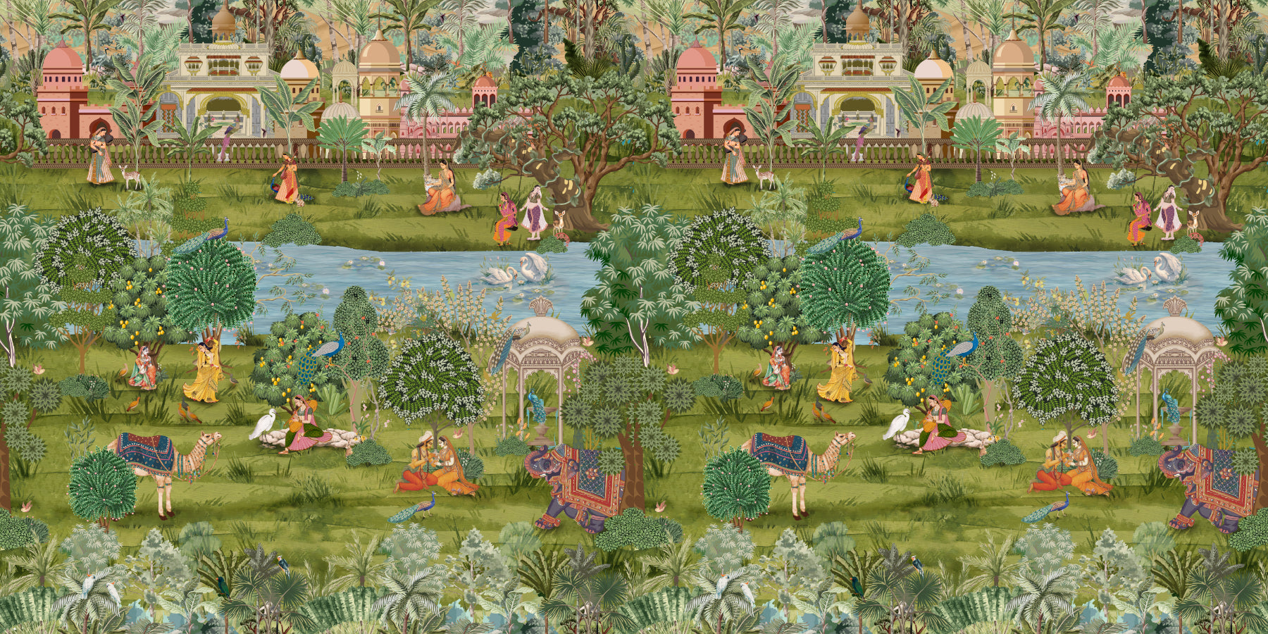 Royal Courtyard Bliss Wallpaper Mural brings to life the charm of royal gardens and cultural elegance. The scene features detailed palace architecture, blooming trees, swans, camels, elephants, and peacocks each element drawn with care. Inspired by classic miniature paintings, this Indian wallpaper showcases storytelling through nature, tradition, and design. It fits beautifully in living rooms, bedrooms, or boutique spaces where heritage stands out. The soft green tones and fine detailing add depth without overwhelming the space. For those seeking a traditional mural that reflects Indian culture and royal themes, this wallpaper offers a timeless and artistic choice.