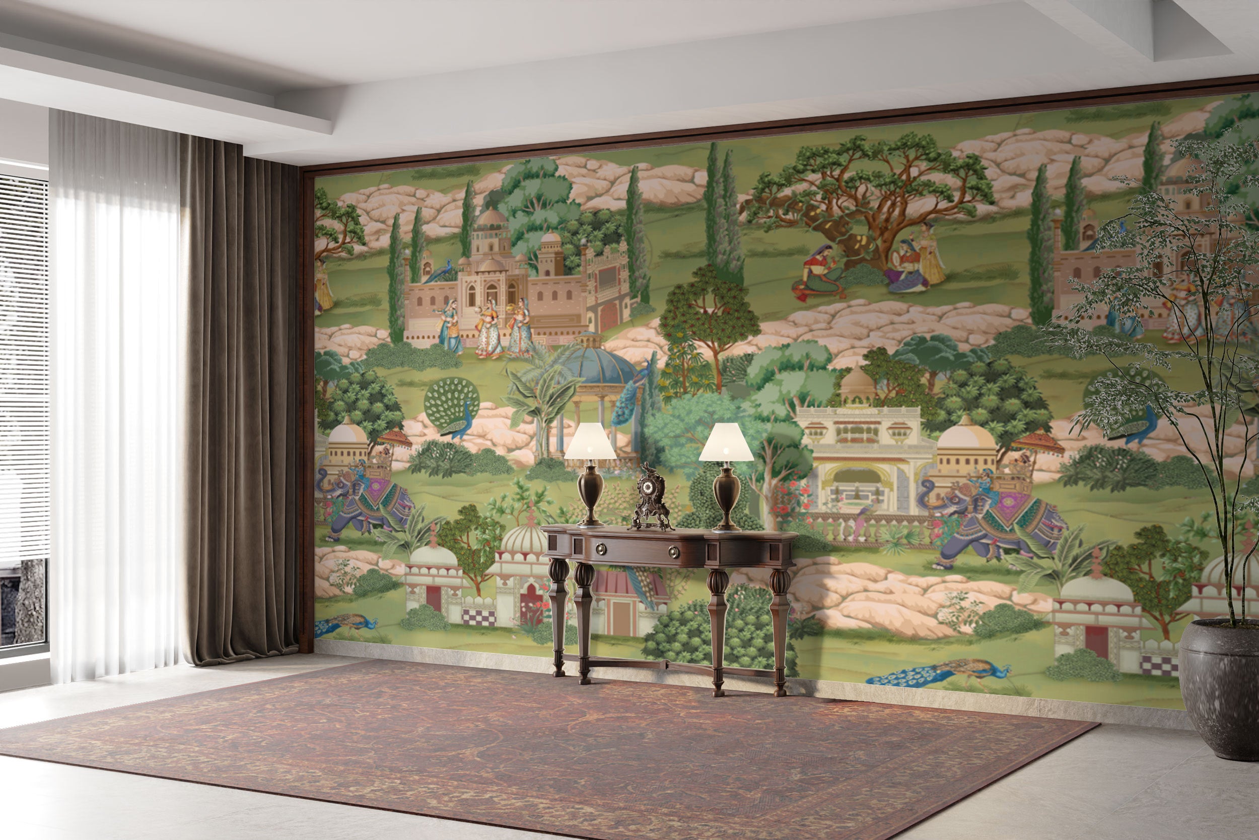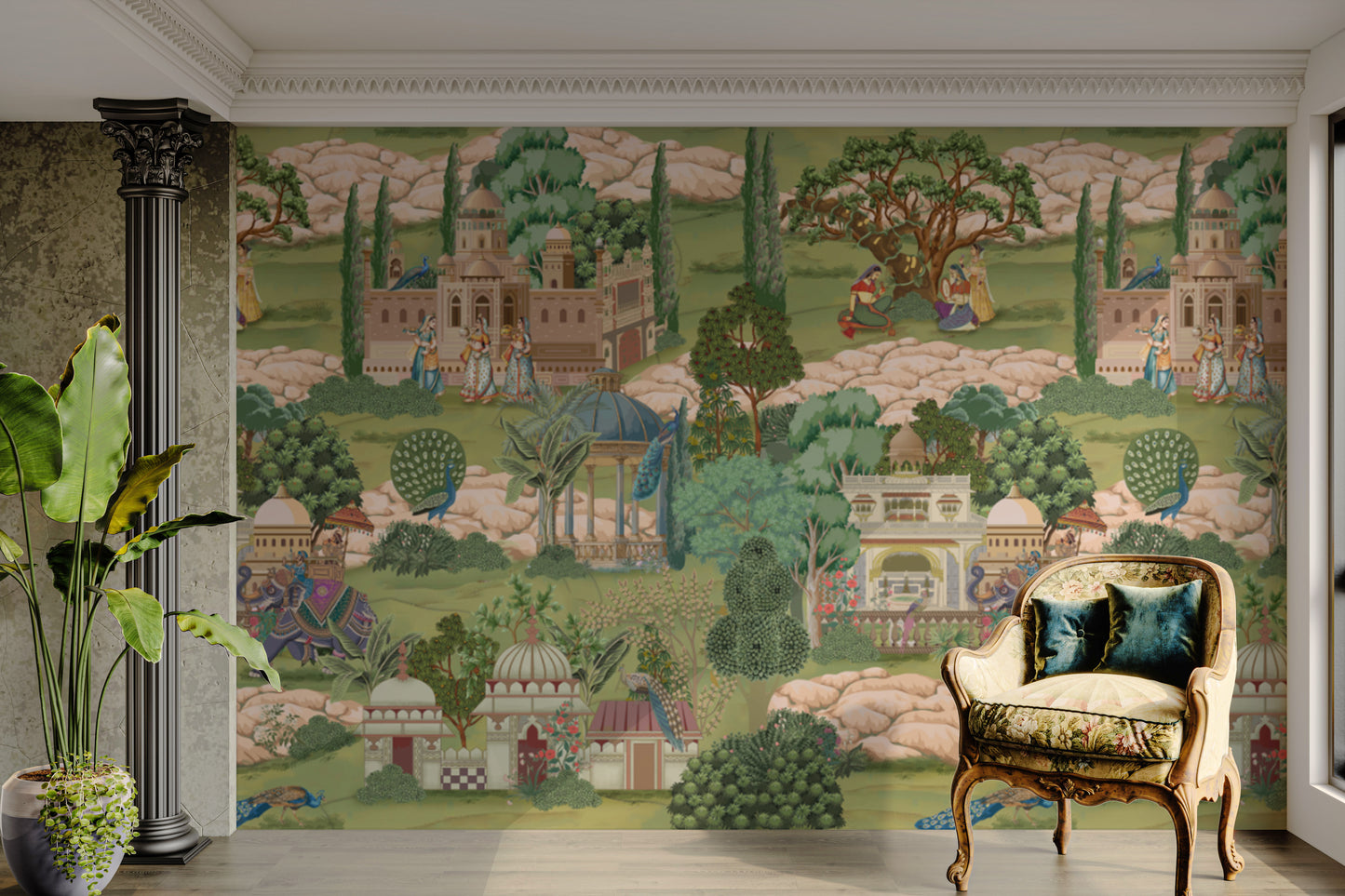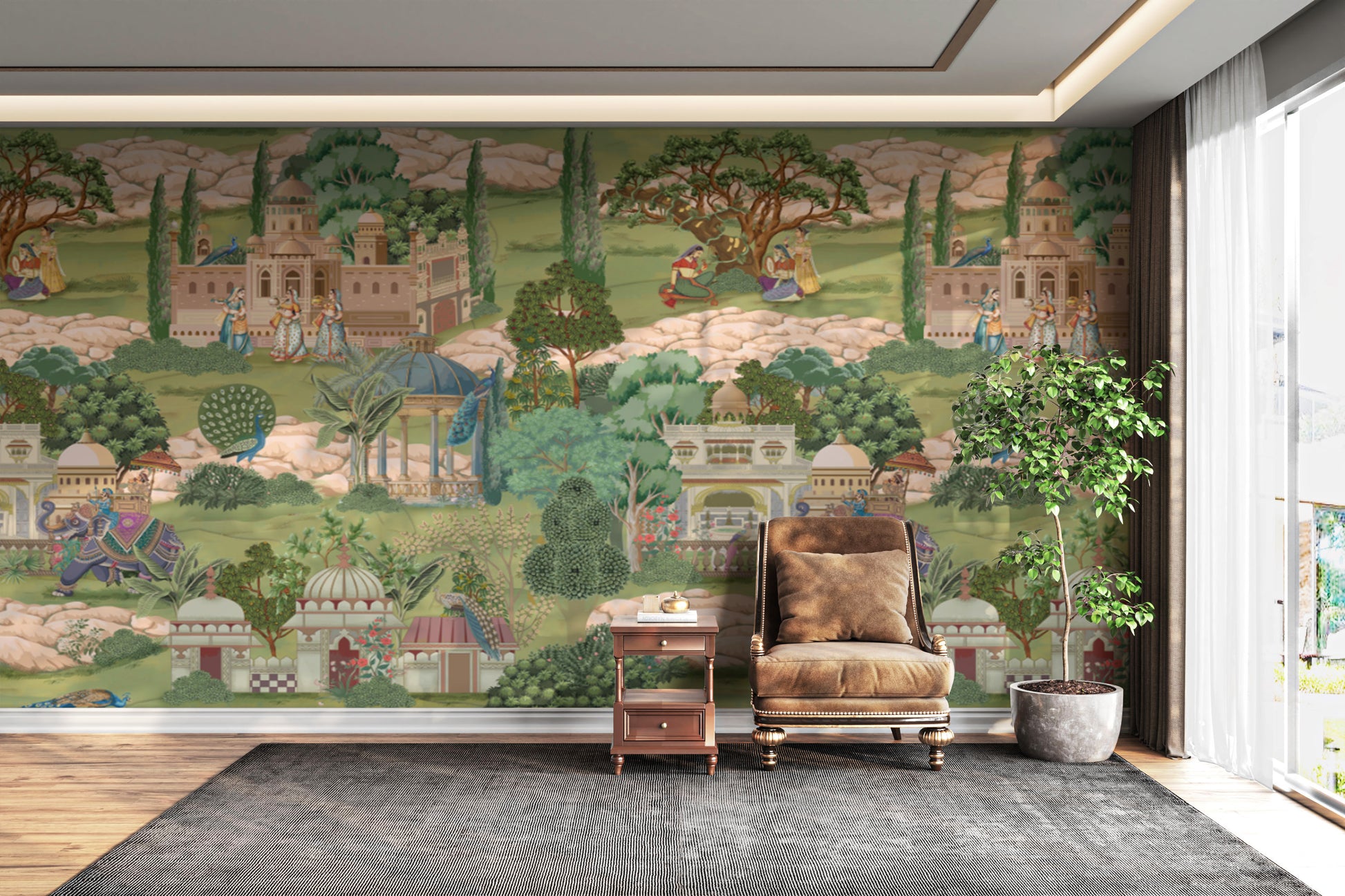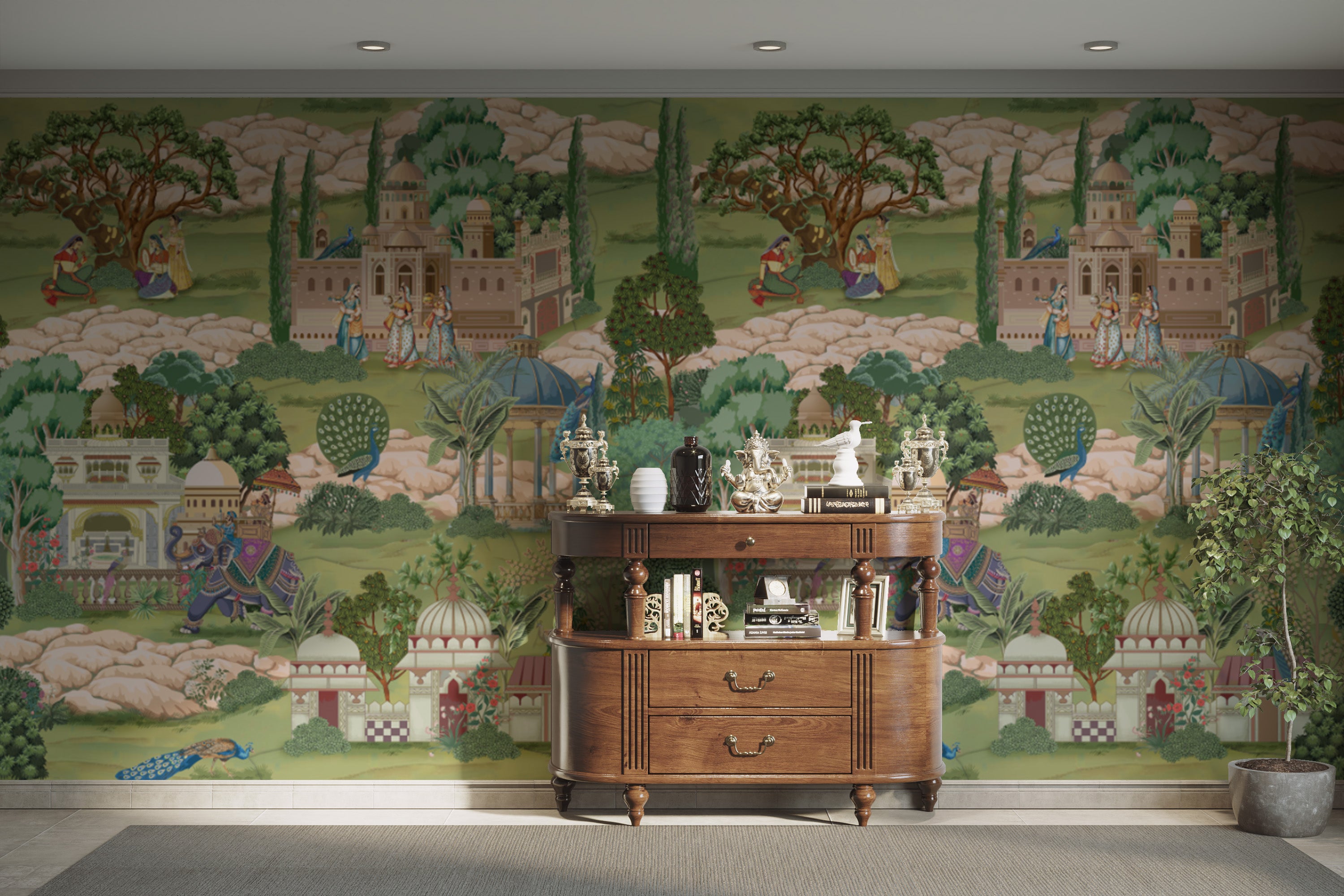Bring the grandeur of royal India to your walls with Royal Courtyard Tales Wallpaper. This scenic mural captures palace courtyards, royal processions, dancers, gazebos, elephants, peacocks, and lush gardens in soft pastel tones. Each element reflects life in regal times from ornate architecture to cultural traditions. Ideal for living rooms, lounges, and cultural cafés, it sets a storytelling tone filled with charm and detail. The design creates a heritage-inspired backdrop full of history and elegance.