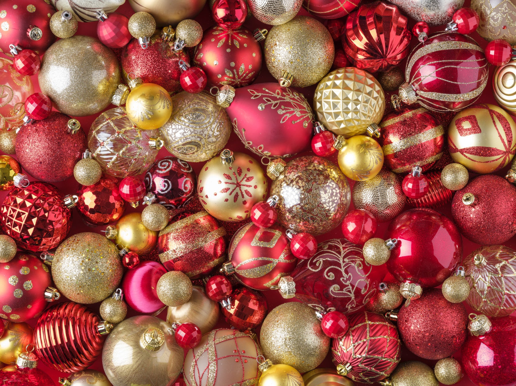 Infuse your space with radiant holiday splendor using this wallpaper for walls. This opulent pattern displays an array of gold and red Christmas ornaments. The combination of matte, shiny, and glittering finishes gives your wall a visual depth. Ideal for a dining room, it fosters an atmosphere of togetherness. The design complements a modern space or adds a bold twist to a classic design. This festive, shiny design is sure to create a memorable statement.