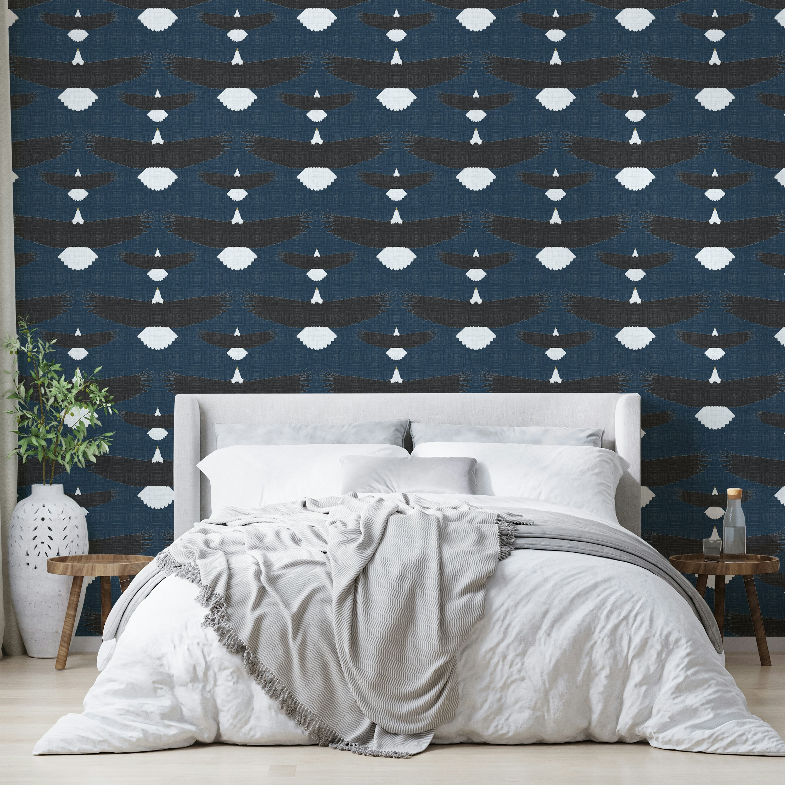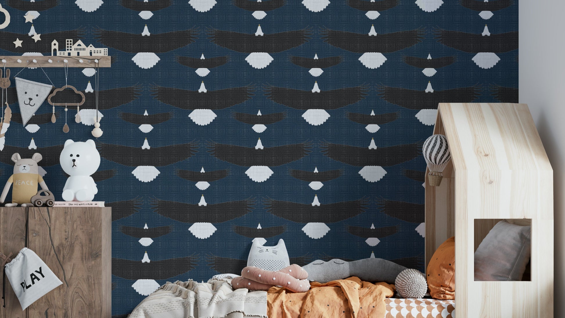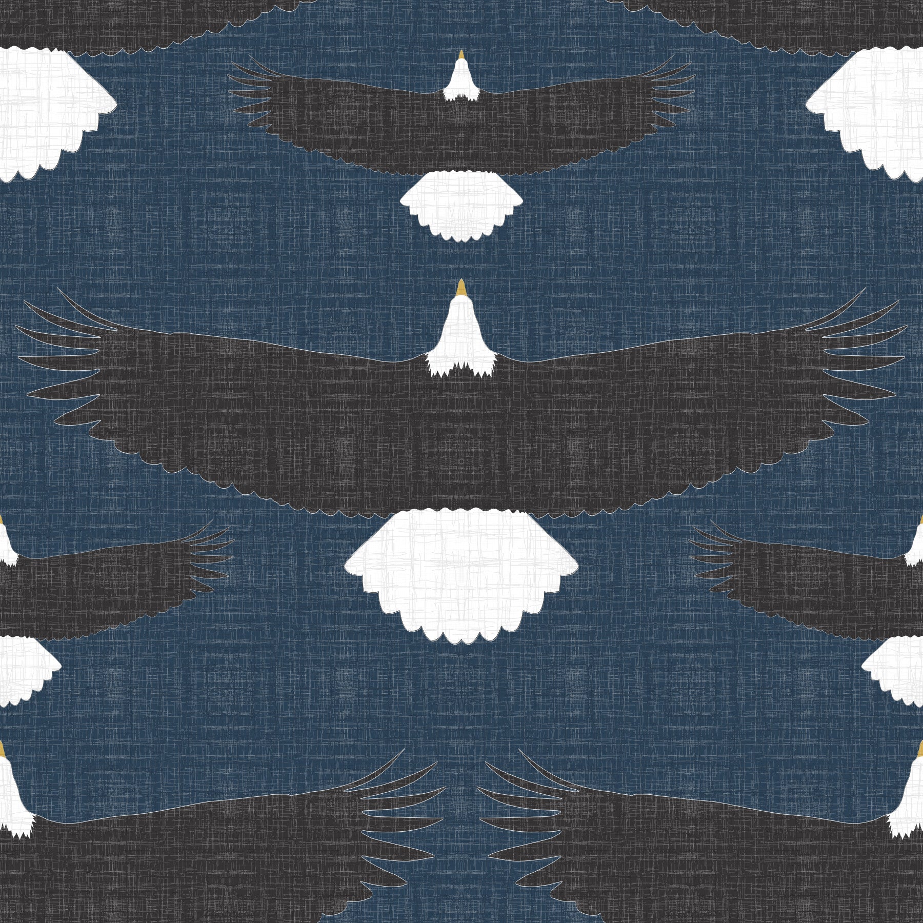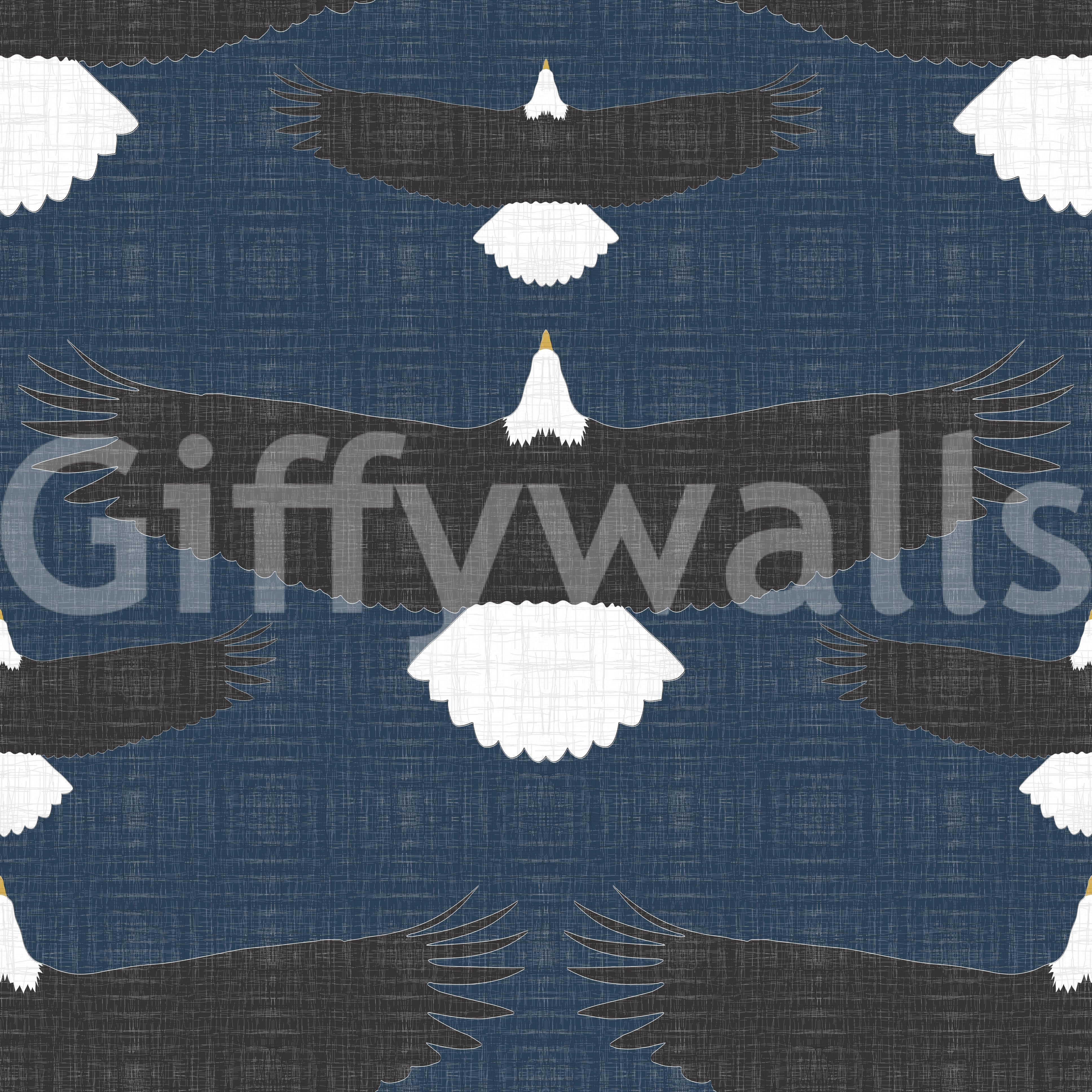 Rustic Bald Eagle Flock Blue Wallpaper features majestic bald eagles soaring across a textured deep blue background. The bold black, white, and golden yellow accents bring each eagle to life, creating a powerful and inspiring mural wallpaper. Ideal wallpaper for walls in offices, dens, or living rooms where a statement of strength and freedom is desired. Crafted from durable, easy-to-install materials, this wall mural maintains its rich colors and texture over time. Its rustic linen-like finish adds warmth and natural charm, making it a perfect choice for nature-inspired or patriotic interiors.