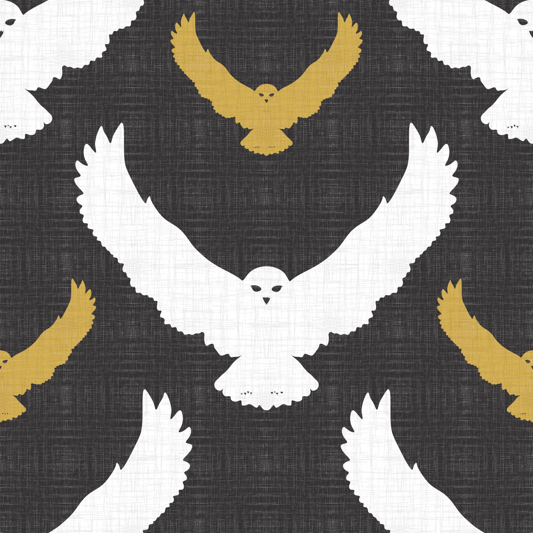 Rustic Owl Flock Gray Wallpaper showcases striking silhouettes of owls in white and golden ochre, soaring against a textured charcoal gray background. This mural wallpaper offers a bold yet sophisticated nature-inspired design, perfect wallpaper for walls in living rooms, dens, or creative spaces seeking a mix of rustic charm and modern style. The linen-like texture adds depth and warmth while the contrasting colors create visual interest. Made from durable, easy-to-install materials, this wall mural keeps its vibrant look and natural feel over time. Ideal for interiors embracing wildlife motifs and textured finishes.