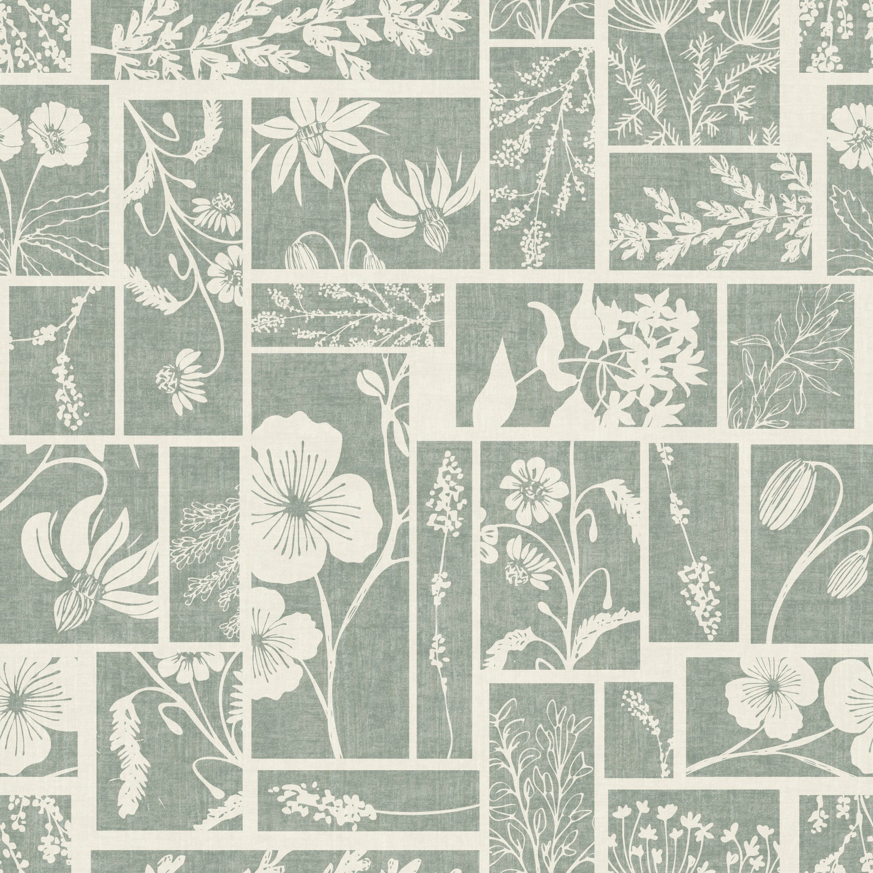 This charming botanical collage creates an inviting feature on any wall. Delicate white floral and leaf motifs arrange themselves within a textured sage green and off-white grid. The patchwork design offers a unique blend of rustic elegance and modern simplicity, bringing a serene, natural aesthetic indoors. This versatile wallpaper for walls enlivens living rooms, bedrooms, or hallways, infusing spaces with a calm, garden-inspired atmosphere. The muted sage green promotes tranquility, while the contrasting off-white illustrations add bright detail. Install this design to transform an entryway with organic charm or create a peaceful retreat in a bathroom. It complements both contemporary and farmhouse interiors beautifully, enhancing a sense of relaxed sophistication.