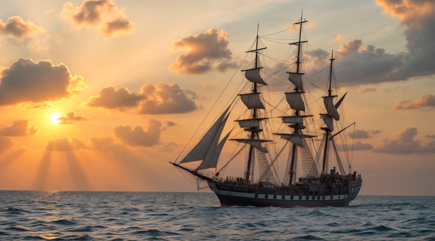 Experience the magic of twilight with this beautiful wallpaper for walls. A large ship cuts through the waves as the sun sets, creating a visually stunning scene. The warm, sunset-inspired colors and detailed depiction of the vessel offer a touch of elegance. Perfect for living rooms, bedrooms, or home offices, this wallpaper enhances your interior with the beauty of the sea. The combination of vivid colors and tranquil scenery evokes a soothing feel, ideal for adding a relaxing backdrop.
