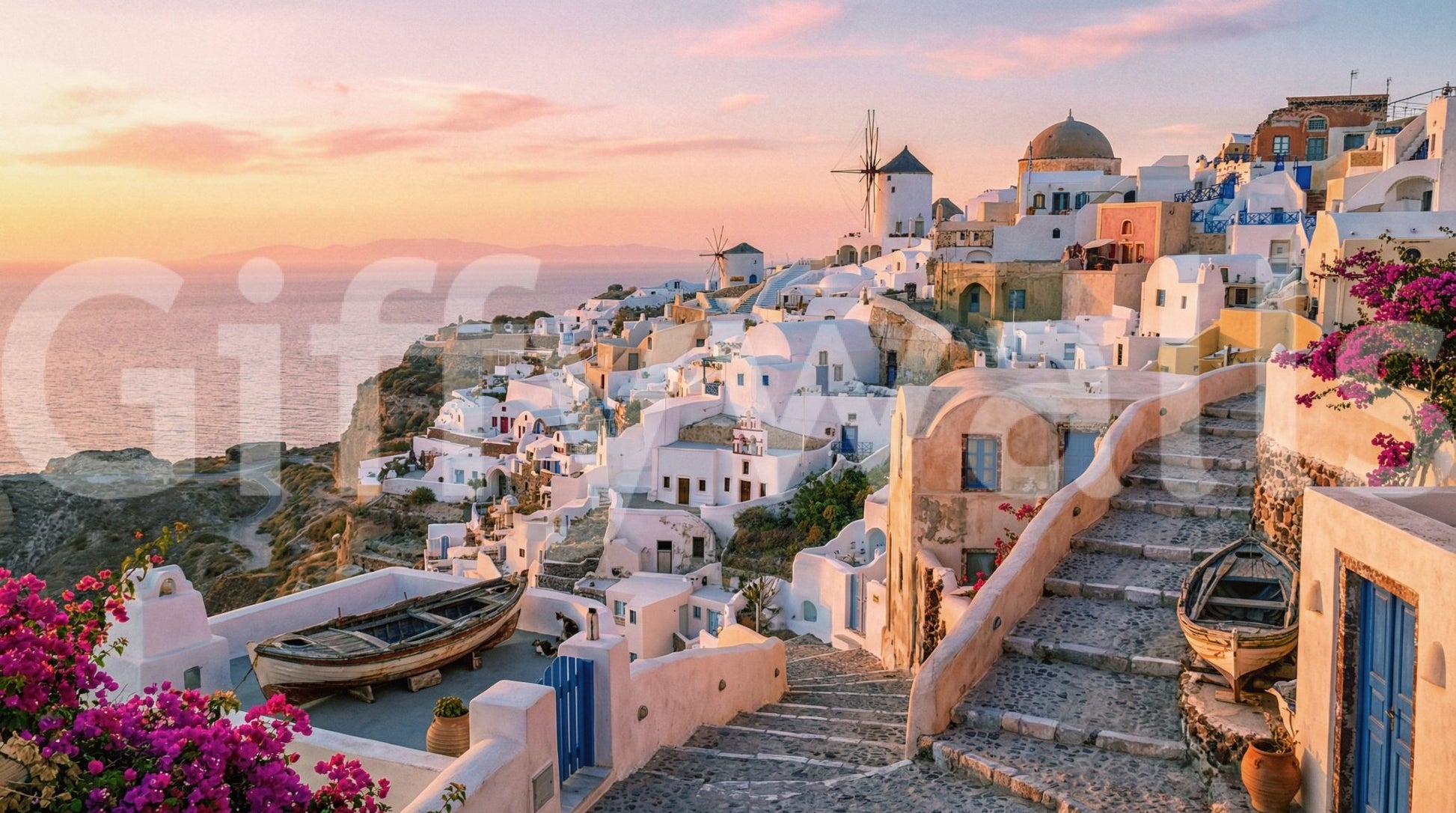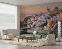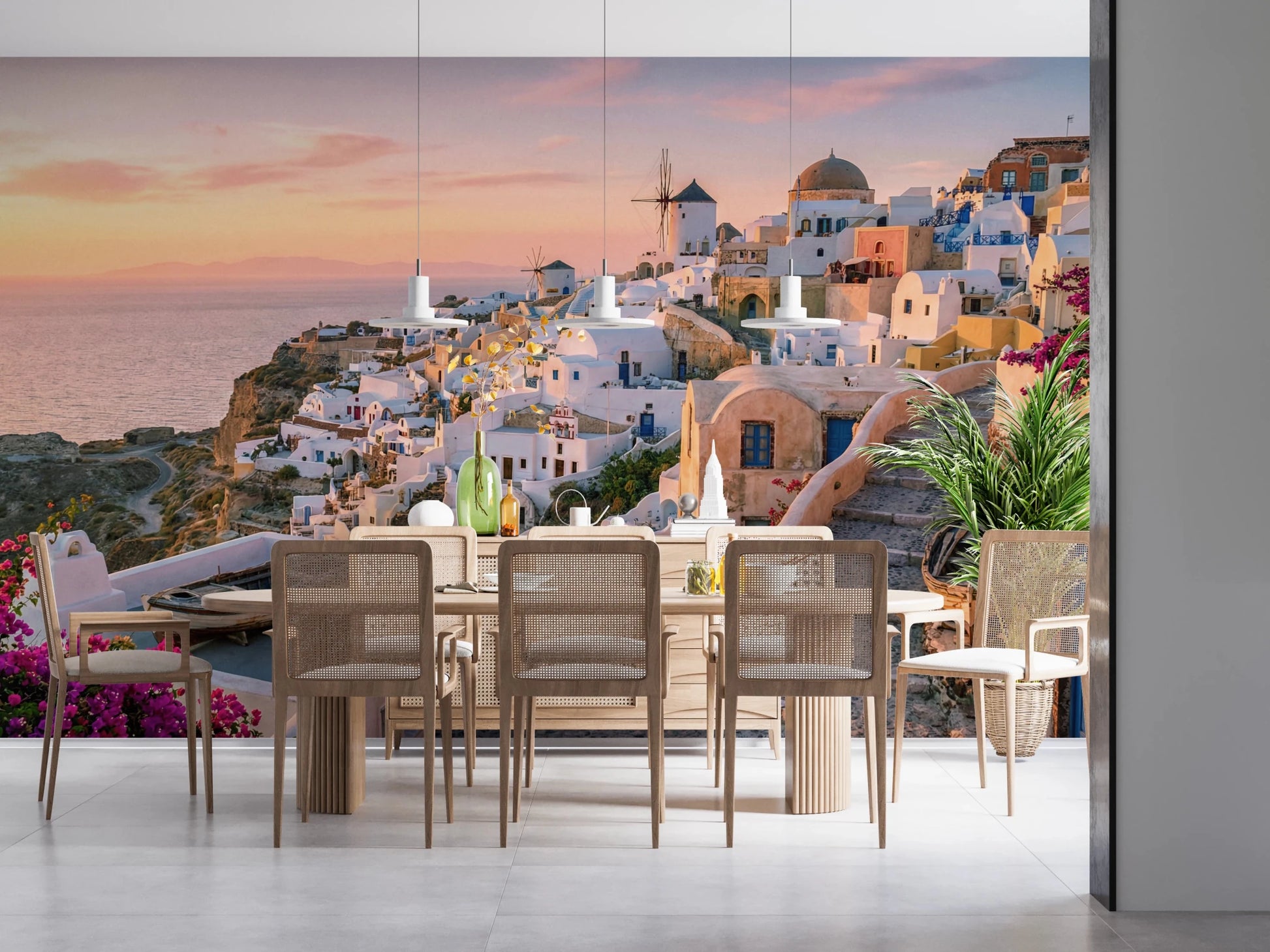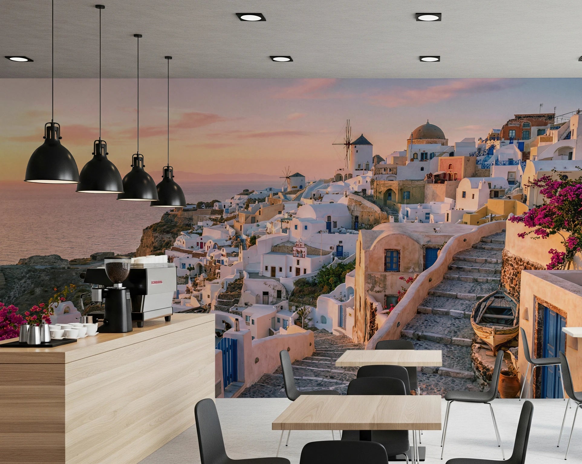 Transform your home with this breathtaking wallpaper for walls. It showcases the iconic whitewashed architecture of Santorini bathed in the soft glow of a sunset. Delicate pinks and oranges blend seamlessly with the deep blue of the Aegean Sea, creating a serene and calming atmosphere. The stone pathways and charming details bring a touch of Mediterranean charm to any space. This wallpaper works beautifully in living rooms, bedrooms, or even hallways, adding a touch of wanderlust and sophisticated style.