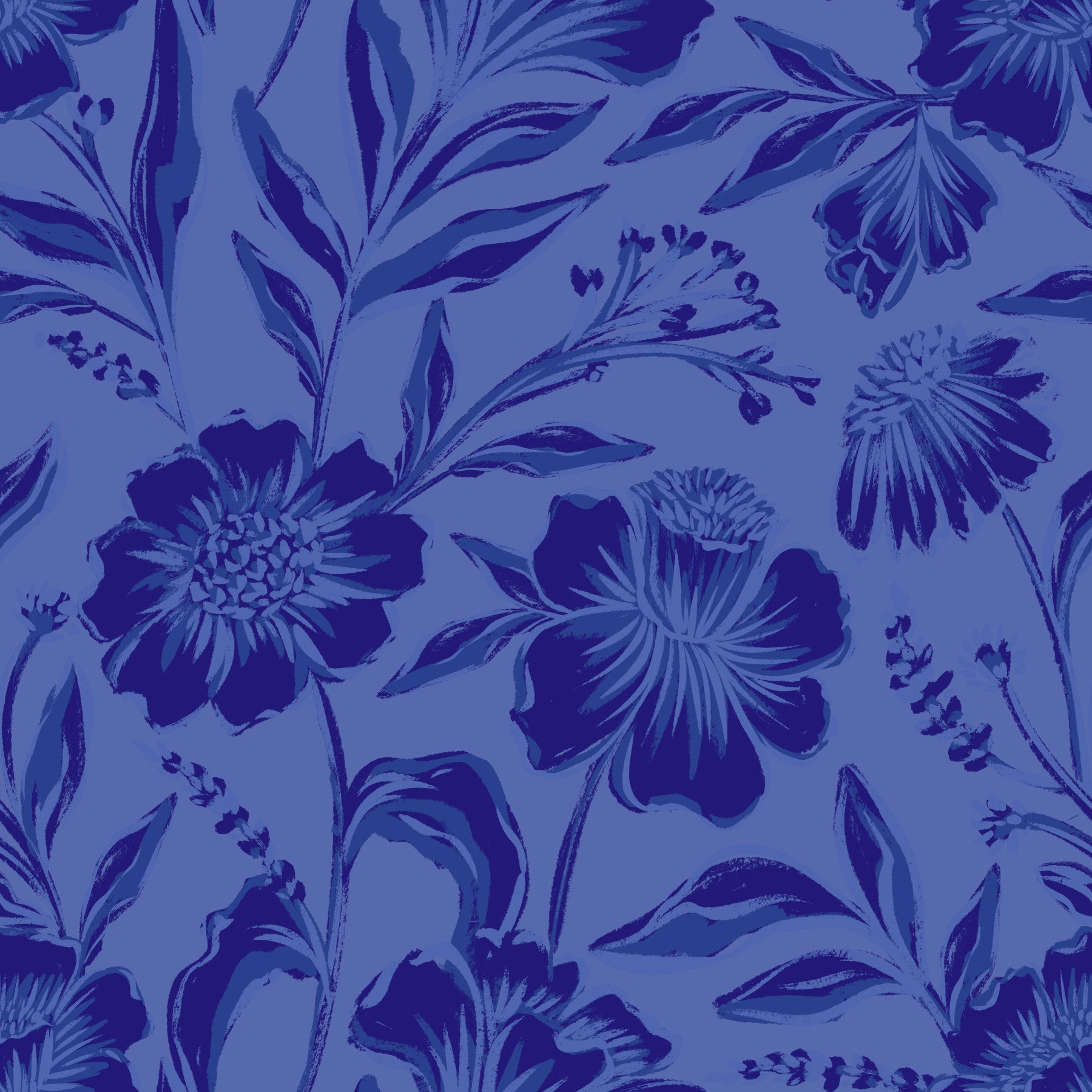The color palette is monochromatic, with different shades of deep sapphire blue.