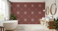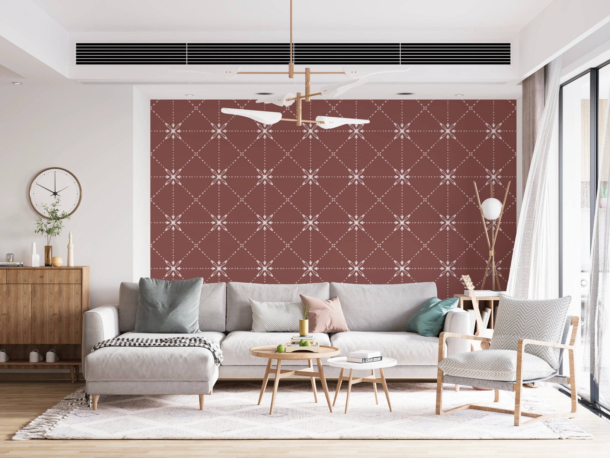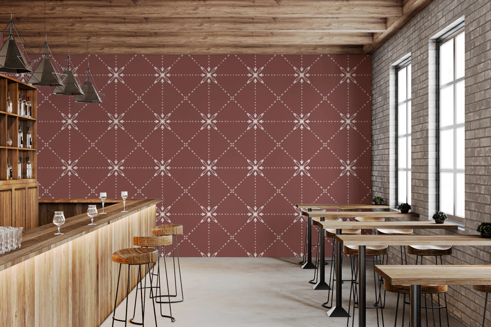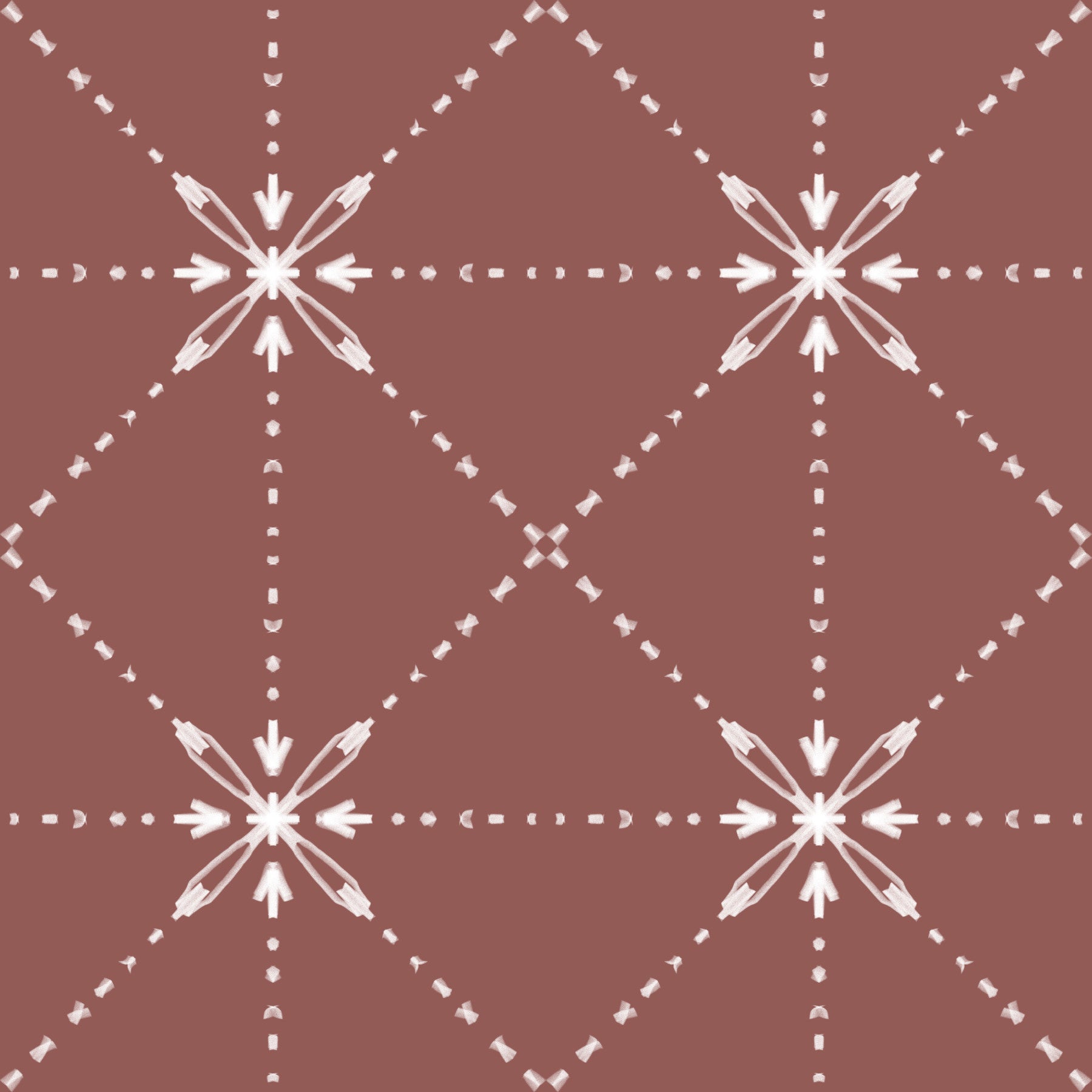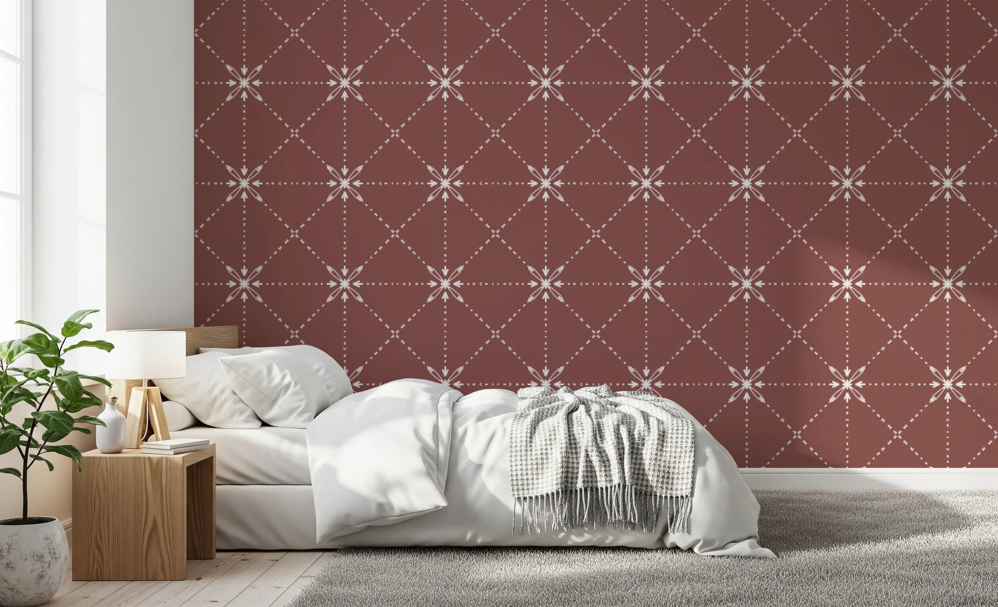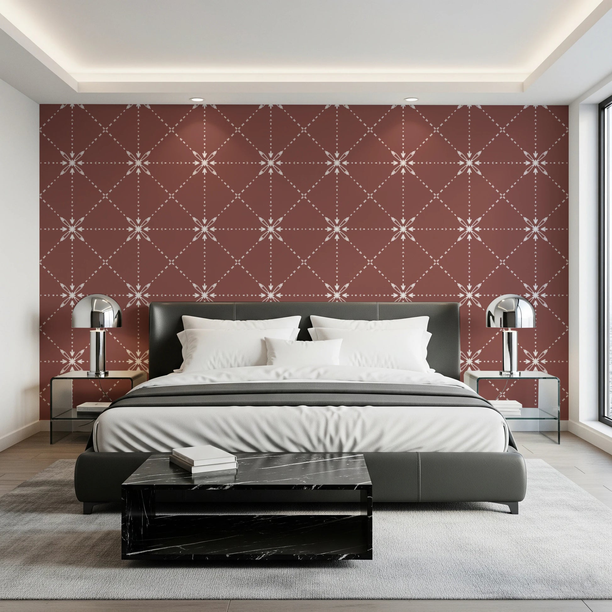 Evoke the warmth of sun-baked earth with 'Sashiko Hana-Goshi'. This design reimagines the ancient Japanese embroidery technique of Sashiko, featuring a delicate latticed flower stitch pattern against a rich terracotta backdrop. The subtle, textured lines create an impression of hand-stitched artistry, offering depth and visual interest. Each 'Hana-Goshi,' or flower motif, is interconnected by dotted lines, bringing a sense of rhythmic movement and understated elegance. This pattern adds a touch of rustic sophistication to any room, harmonizing tradition with modern sensibilities. Perfect for adding a touch of warmth and subtle texture to your walls.
