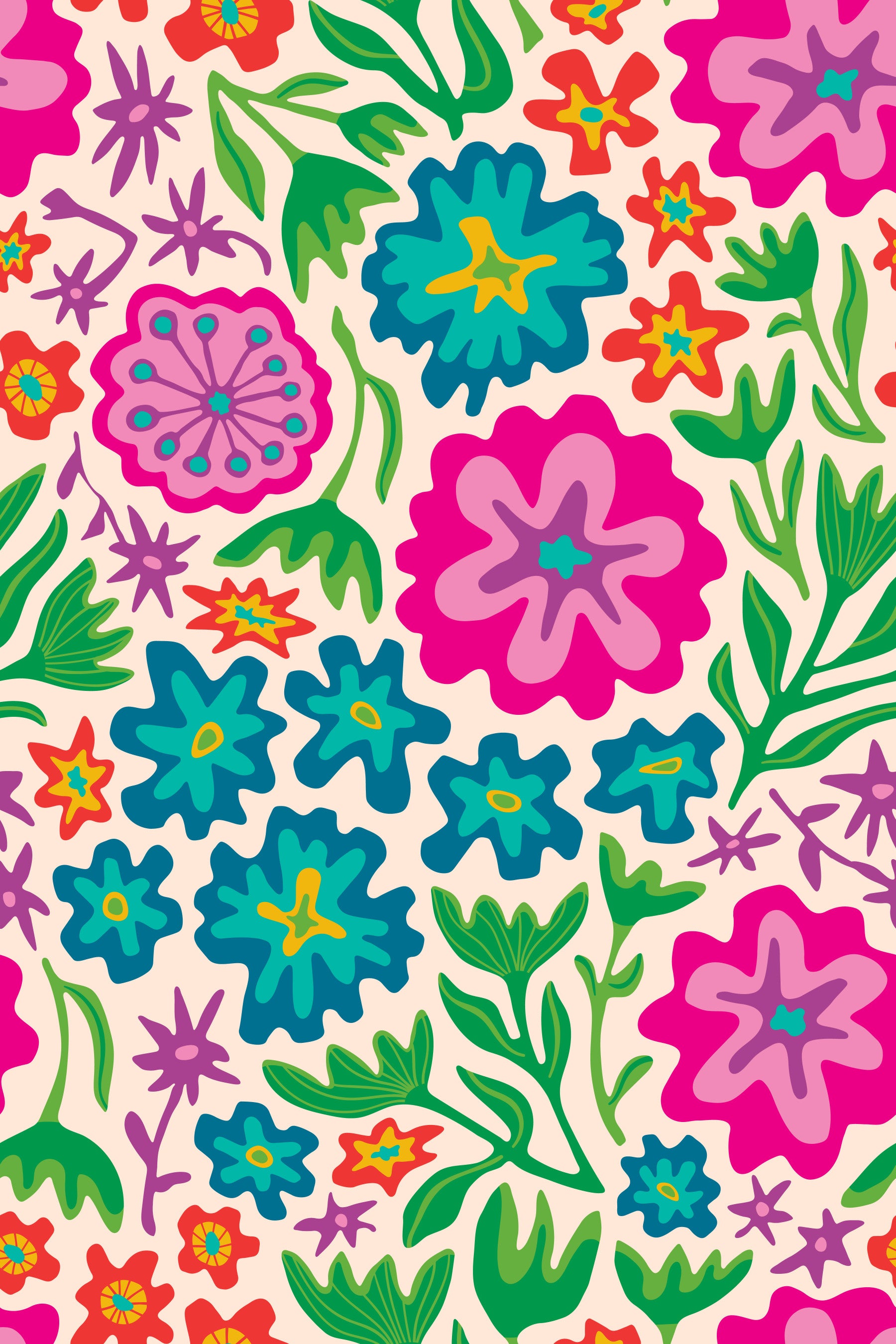 Infuse your walls with the free-spirited vibes of the Mexican surf town of Sayulita, where color reigns supreme and every day feels like a fiesta! Immerse yourself in the playful energy of flowers and leaves influenced by Mexican folk art, reimagined for the modern home. This design bursts with bold botanical life, featuring stylized florals and lush foliage in a kaleidoscope of rainbow brights: hot pink, turquoise, coral, kelly green, purple, yellow and bright blue, all dancing against a light fresh cream background that adds depth, sophistication and pop. The abstract style evokes a sense of carefree artistry and authentic charm, reminiscent of traditional Mexican crafts. This pattern design is also available in Other Colourways too! Original wallpaper pattern design by Jackie Tahara of UnBlink Studio.