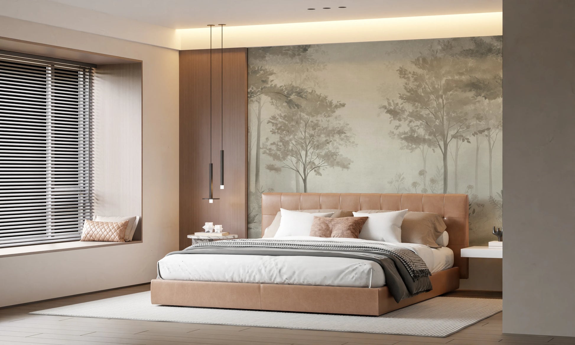 Transform your living space with the serene beauty of a Scandinavian forest, captured in a stunning dusty green palette. This wall covering evokes the tranquil atmosphere of a Nordic woodland, where slender trees rise amidst a soft, misty light. The muted tones create a calming and sophisticated ambiance, perfect for creating a sanctuary within your home. Delicate floral and foliage details add a touch of natural elegance, enhancing the overall sense of peace and tranquility. The subtle interplay of light and shadow brings depth and dimension to your walls, creating a captivating visual experience. Immerse yourself in the quiet beauty of nature and let this elegant design bring a touch of Scandinavian charm to your décor.