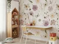 Scandinavian Watercolor Meadow Flowers with Bees and Butterflies Wall Mural