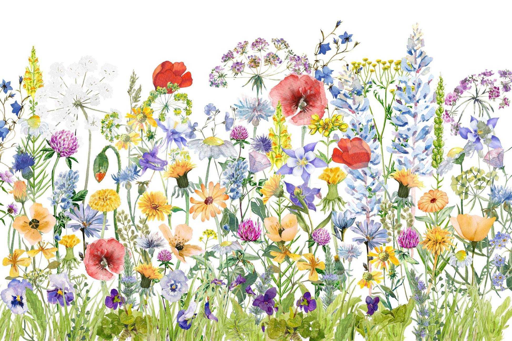 Scandinavian Watercolor Meadow Poppies with Colorful Wildflowers Wall Mural