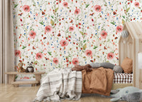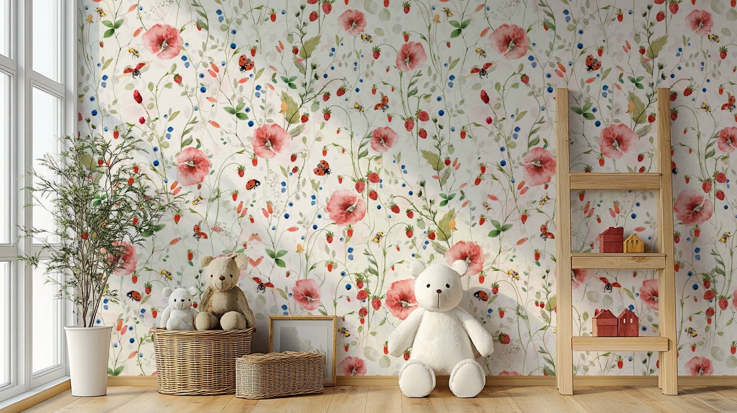 Scandinavian Watercolor Poppies Strawberries and Wild Berries Wall Mural