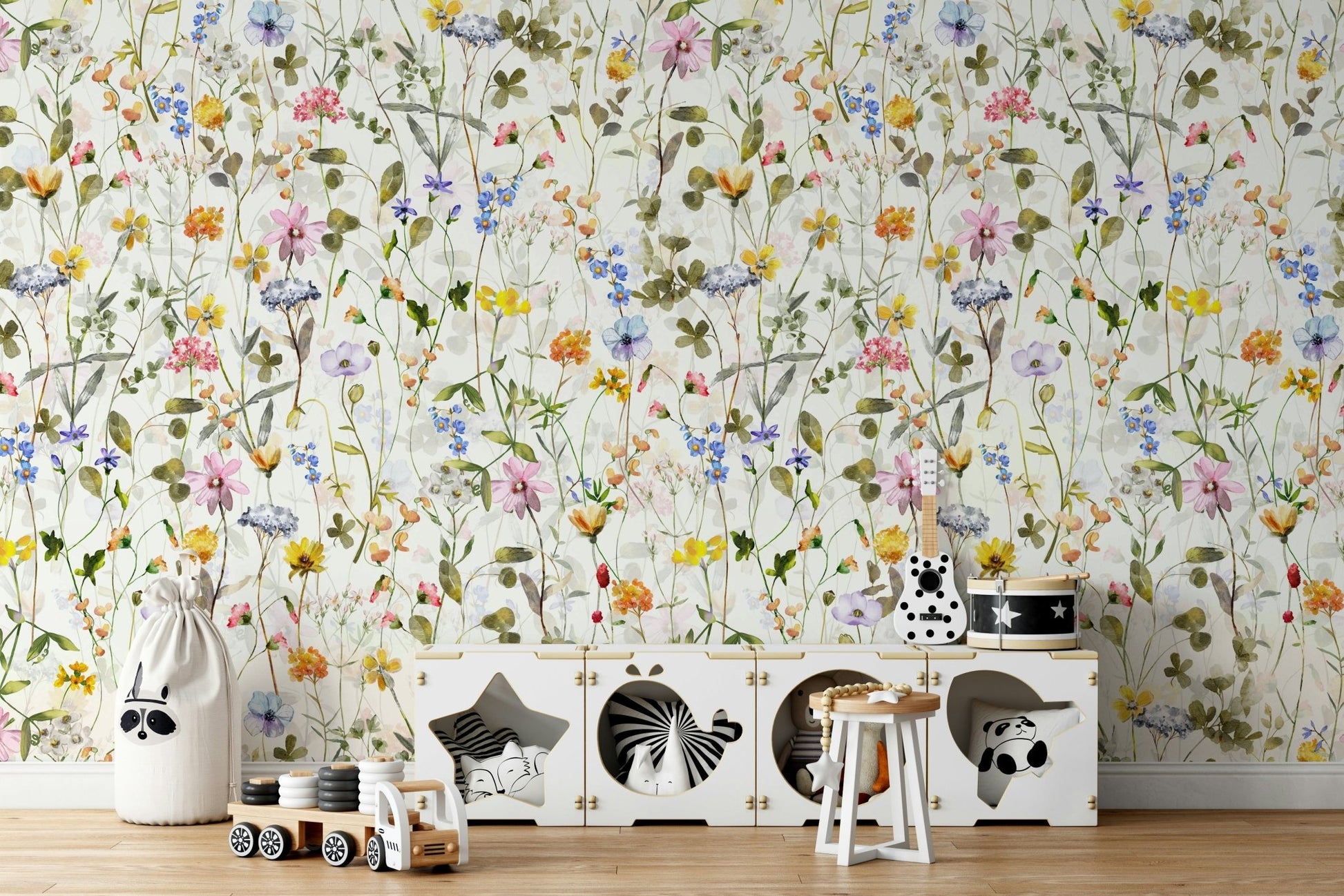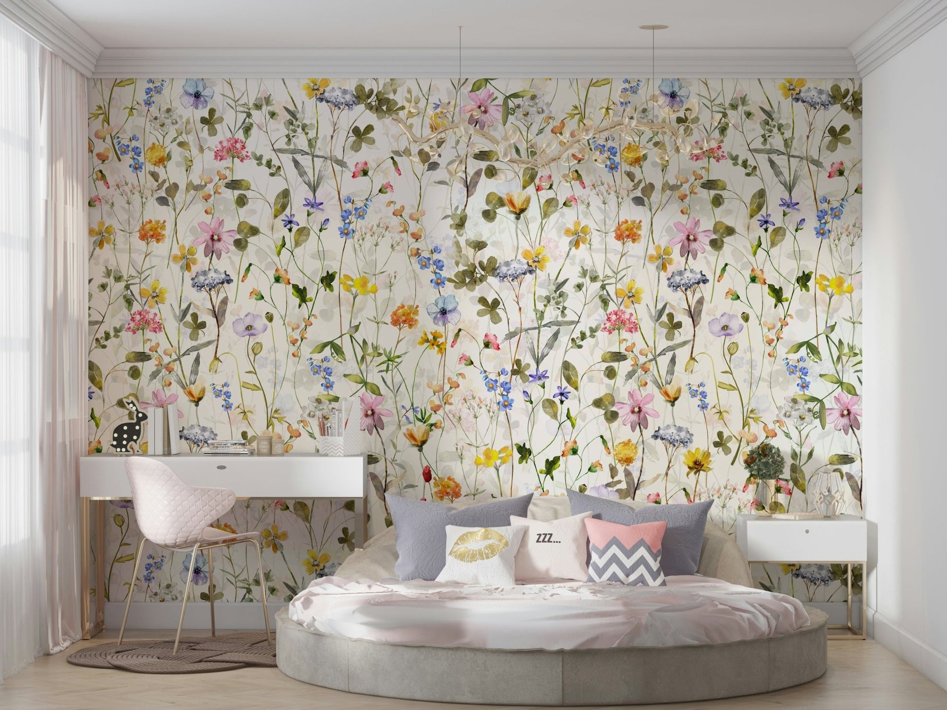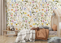Scandinavian Watercolor Wildflowers Meadow with Colorful Blooms Wall Mural