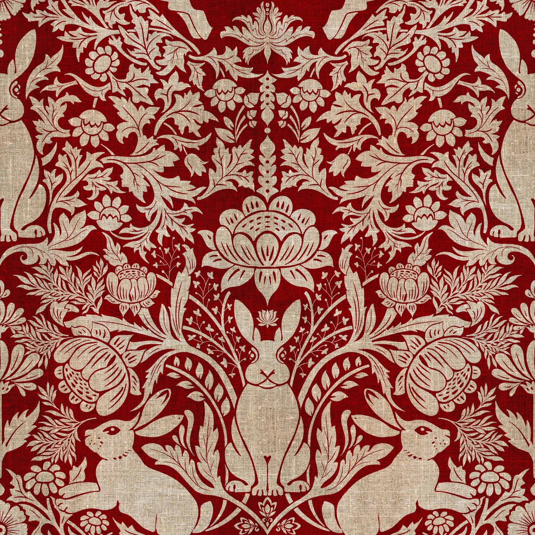 Elevate your home with this captivating wallpaper for walls that features a repeating pattern with stylized rabbits and elaborate floral arrangements in scarlet and beige. This design offers a blend of heritage and playful style. Picture this pattern enhancing bedrooms, living rooms, or dining rooms with a touch of timeless grace. Observe how its structure complements varied interiors, fostering a welcoming environment with character.