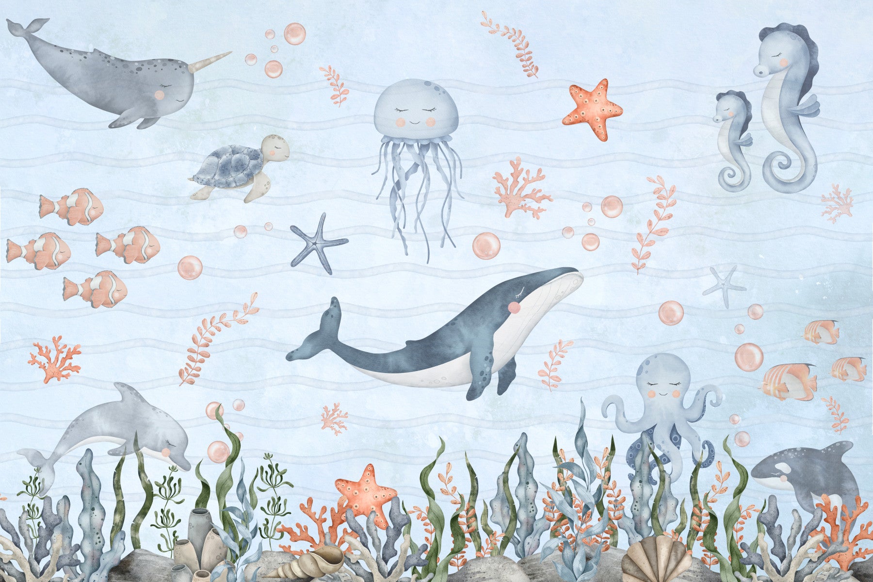 Invite the wonders of the sea into your home with this playful wallpaper for walls! This charming design presents an underwater scene featuring adorable marine animals. Gentle waves and soft, pastel shades of blue and peach create a tranquil mood. It's ideal for a nursery, playroom, or any space where you want to foster a sense of calm. The design beautifully complements interiors, adding a splash of childlike joy. This wallpaper is perfect for a unique feature wall!
