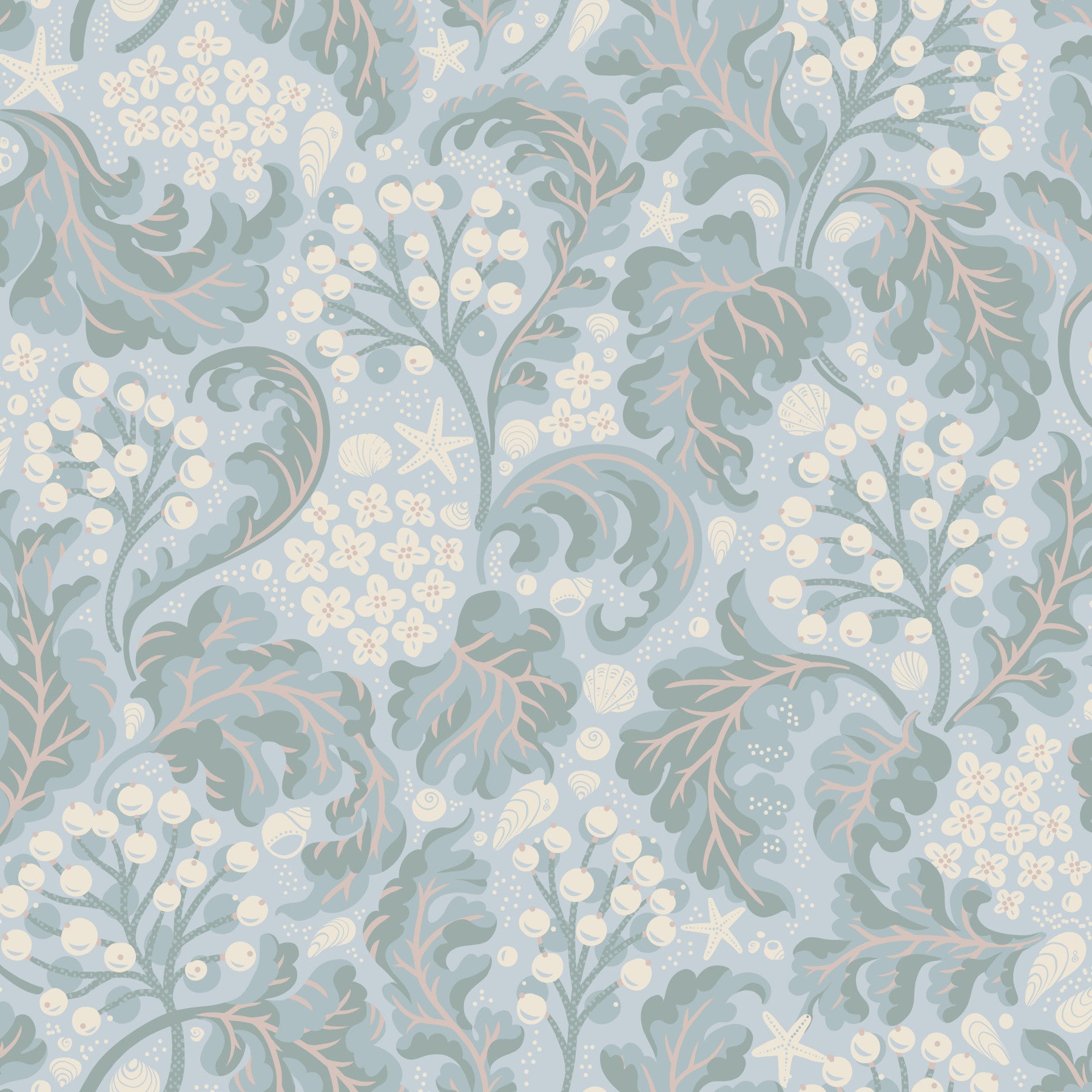 Dive into tranquility with 'Sea Kale - Baby Blue,' a serene wallpaper design. Delicate, stylized sea kale in calming shades of baby blue and creamy beige intertwine with whimsical seashells and starfish. The pattern evokes a peaceful underwater garden, where soft floral motifs dance amongst the ocean's treasures. This wallpaper creates a soothing atmosphere, perfect for bedrooms, bathrooms, or any space needing a touch of coastal charm and understated elegance. The gentle color palette and organic shapes promote relaxation and a sense of calm.