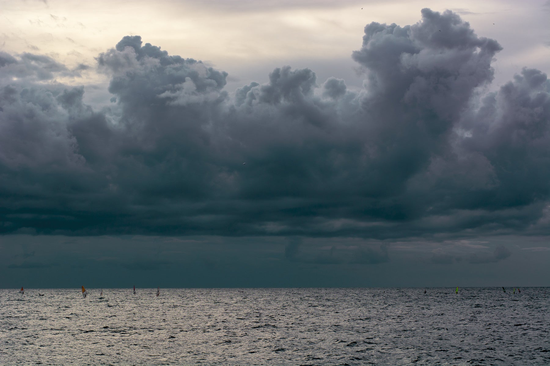 Seaside #8 captures the raw, untamed beauty of the ocean under a dramatic sky. Towering, charcoal-grey clouds dominate the scene, their textured forms reflecting in the restless, pewter-colored waters below. The mood is atmospheric, evoking a sense of tranquility amidst the elements' power. The horizon line is subtly punctuated by the colorful sails of windsurfers, tiny figures braving the conditions and adding a touch of human activity to the vast expanse. These vibrant pops of color provide a visual counterpoint to the otherwise somber palette, lending a sense of hope and energy. Perfect for those who appreciate the beauty of nature's dynamic displays, this wallpaper will bring a sophisticated and calming presence to any screen.