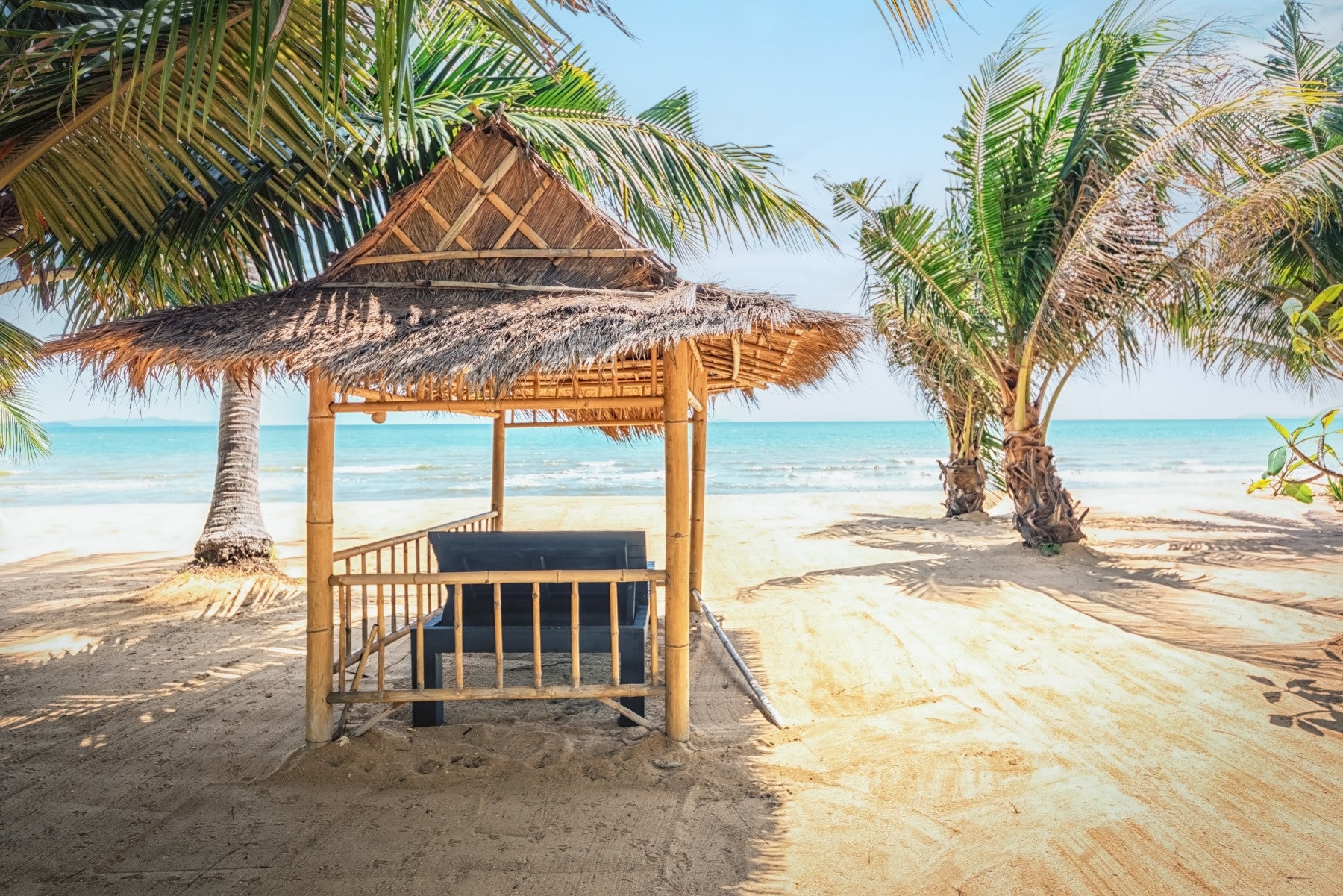 Transform your living space with this serene beach-themed wallpaper for walls. The tranquil scene features a charming bamboo shelter nestled among swaying palm trees, overlooking a calm, turquoise sea. The sandy hues blend seamlessly with the blues and greens, creating a relaxing ambiance. This design works wonderfully in bathrooms, bedrooms, or living rooms, bringing the peaceful essence of a tropical getaway into your home. The wallpaper complements natural wood furniture and adds a touch of coastal style, enhancing the overall decor with a sense of calm and vacation-like comfort. Install this to bring the beach inside!