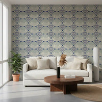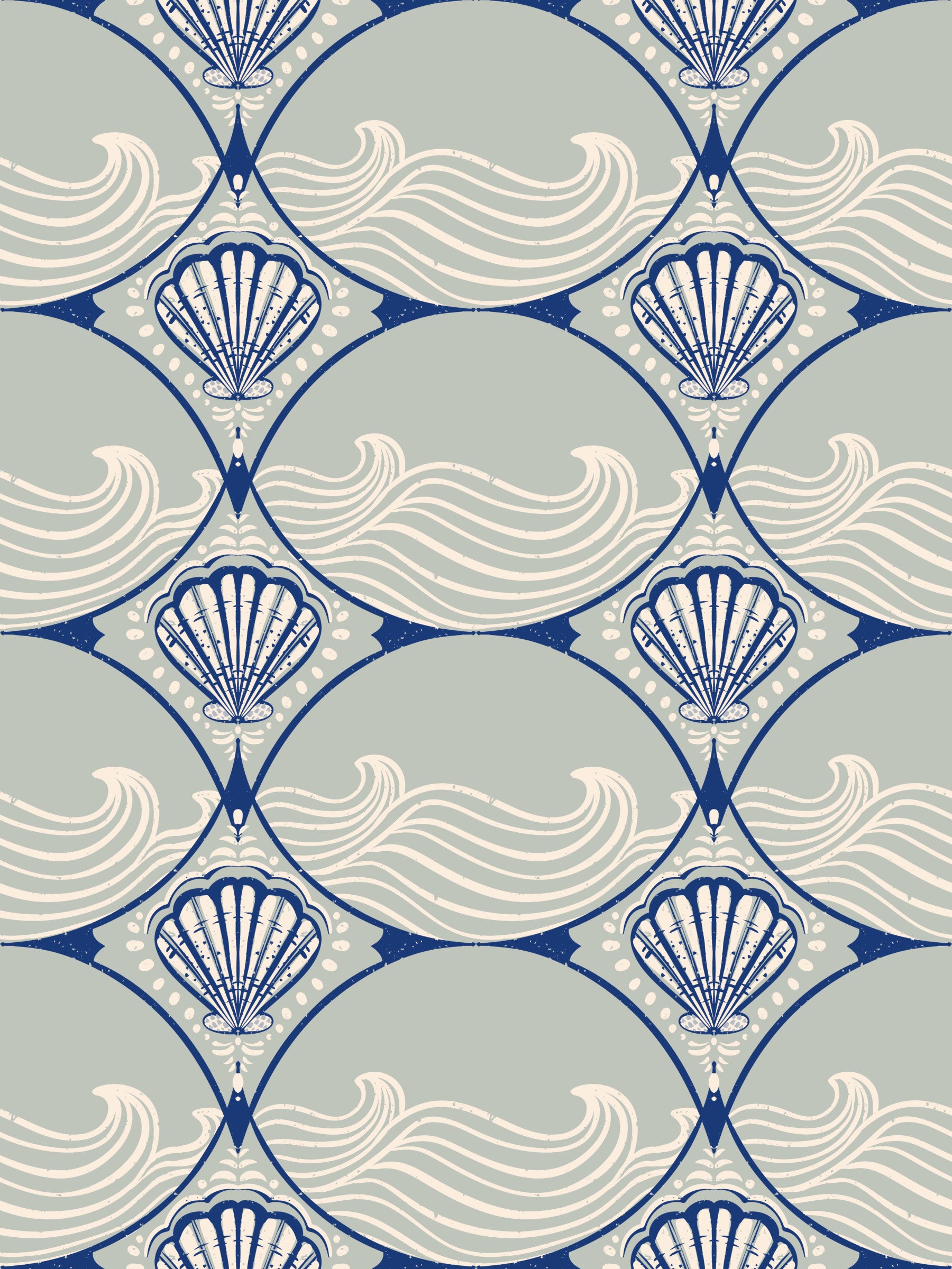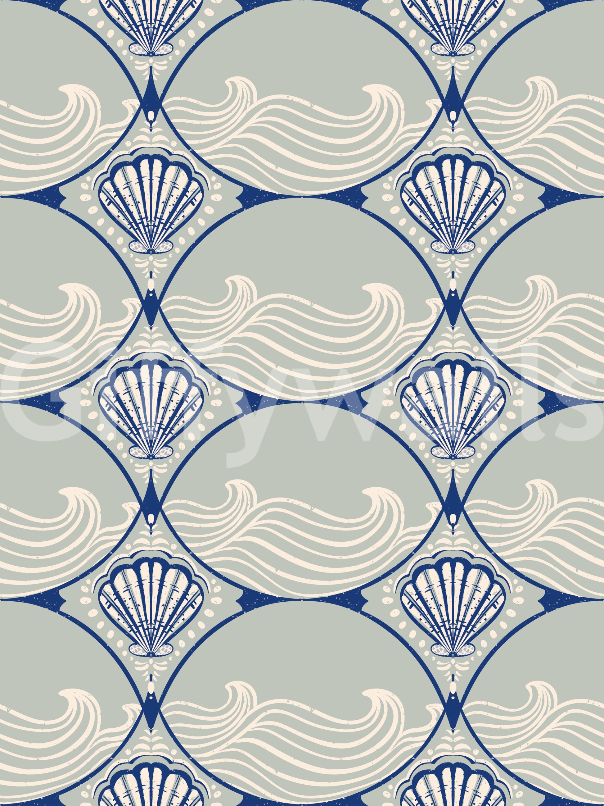 Transform your living space with this captivating Seashell Scallop wallpaper for walls. This elegant design features a repeating pattern of stylized scallop shells intricately framed by curvilinear shapes, evoking a sophisticated Art Deco aesthetic with a refreshing coastal theme. Gentle, flowing waves fill the background, adding dynamic movement to the serene composition. A muted color palette of deep marine blue, soft sage green, and creamy off-white creates a tranquil and inviting atmosphere. The subtle distressed texture lends a charming vintage appeal. Install this distinctive wallpaper in your bathroom, living room, dining room, or bedroom to introduce a timeless nautical elegance. It beautifully enhances interiors, offering a sense of calm and refined style that complements both modern and classic furnishings.