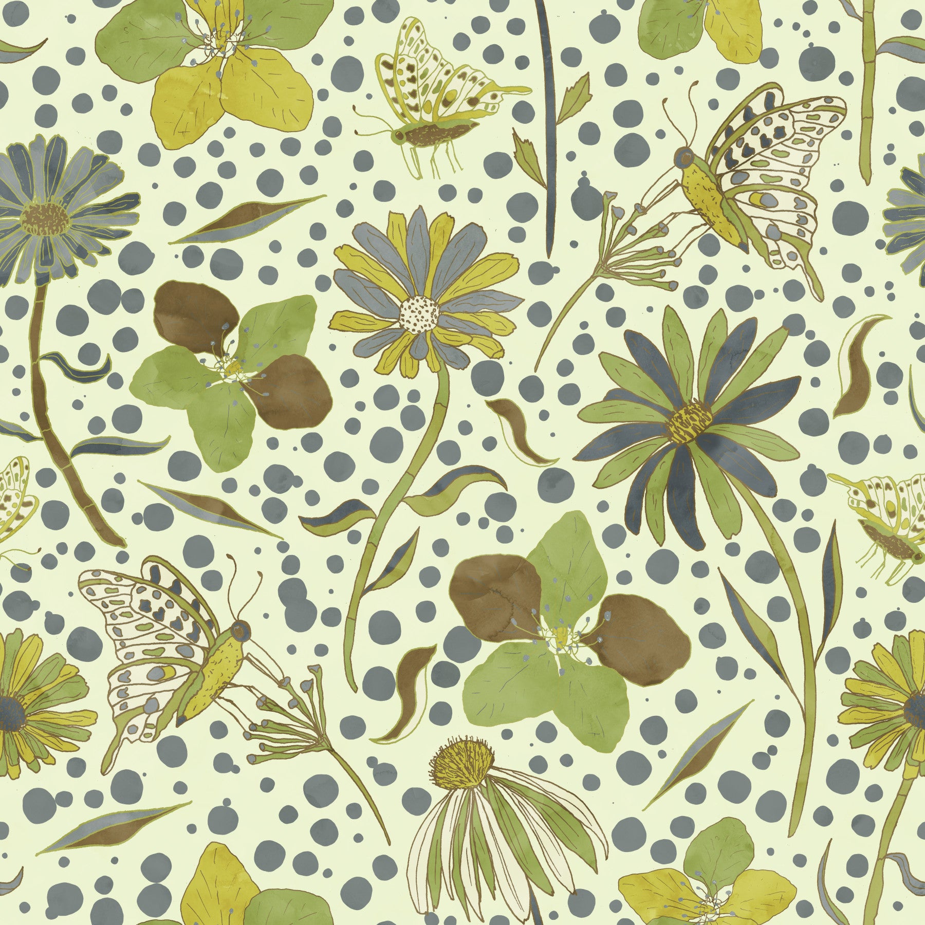 Design featuring butterflies, flowers, and scattered dots.