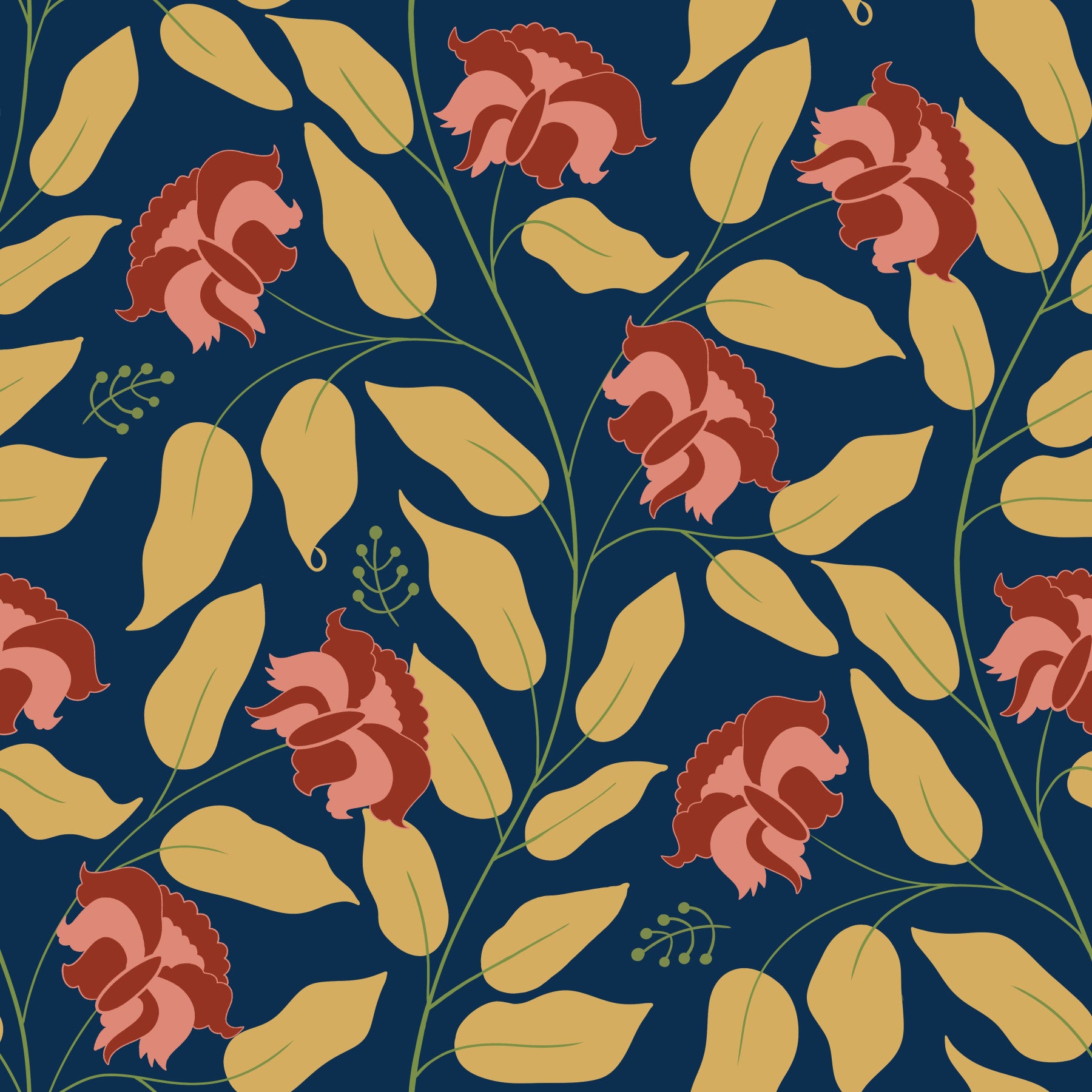 Immerse yourself in the calming embrace of 'Seraphyne - Earthy Floral,' a wallpaper that whispers tales of a tranquil garden bathed in twilight. The design features rich, earthy tones set against a deep navy backdrop, evoking a sense of sophisticated serenity. Large, stylized golden leaves create a harmonious rhythm, while delicate, abstract floral motifs in shades of terracotta and blush add a touch of understated elegance. This wallpaper brings the beauty of nature indoors, offering a grounding and restorative atmosphere to any space. The simplified forms and balanced composition make it an ideal choice for creating a sophisticated and inviting environment. Let Seraphyne infuse your walls with an organic touch and a quiet sense of peace.