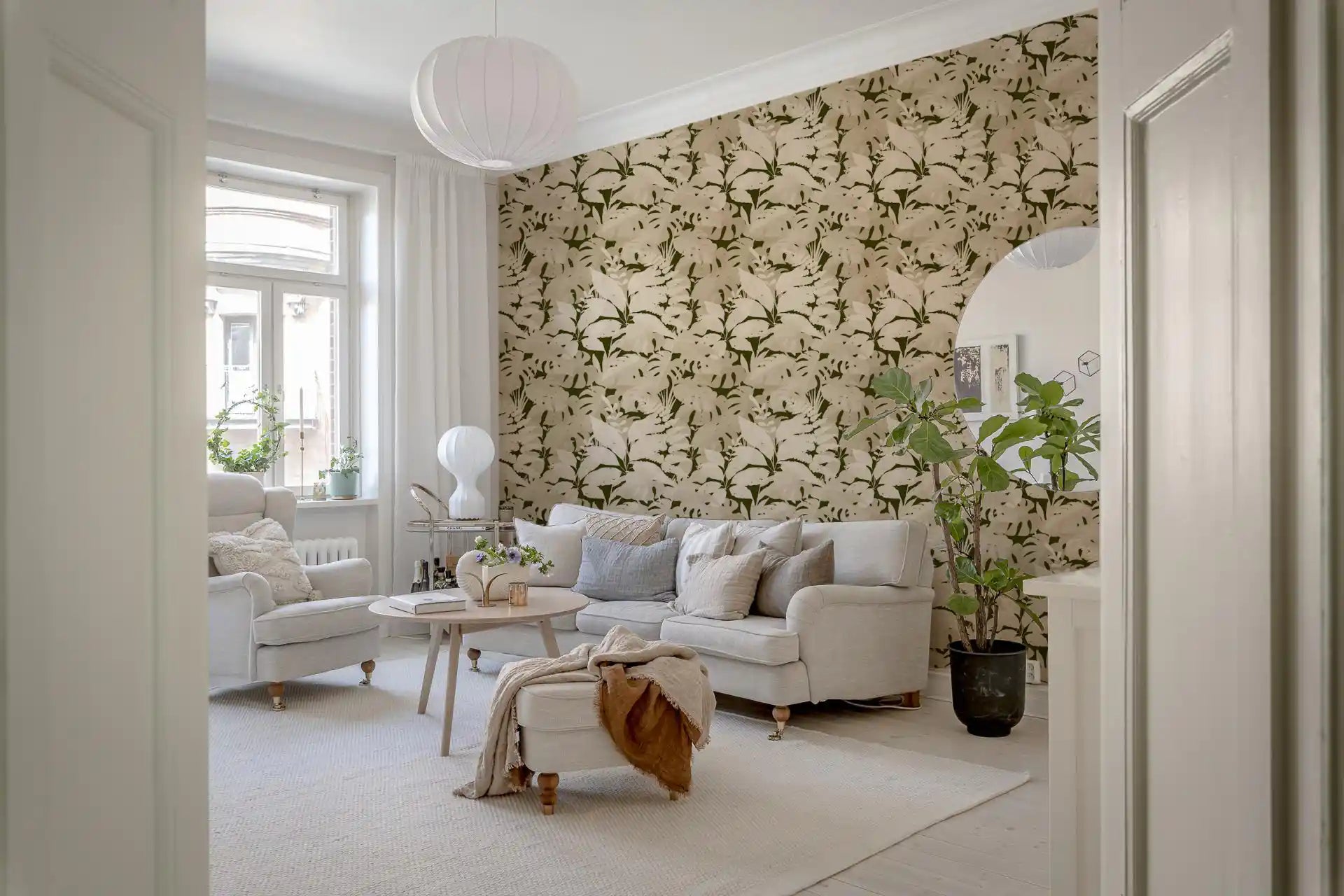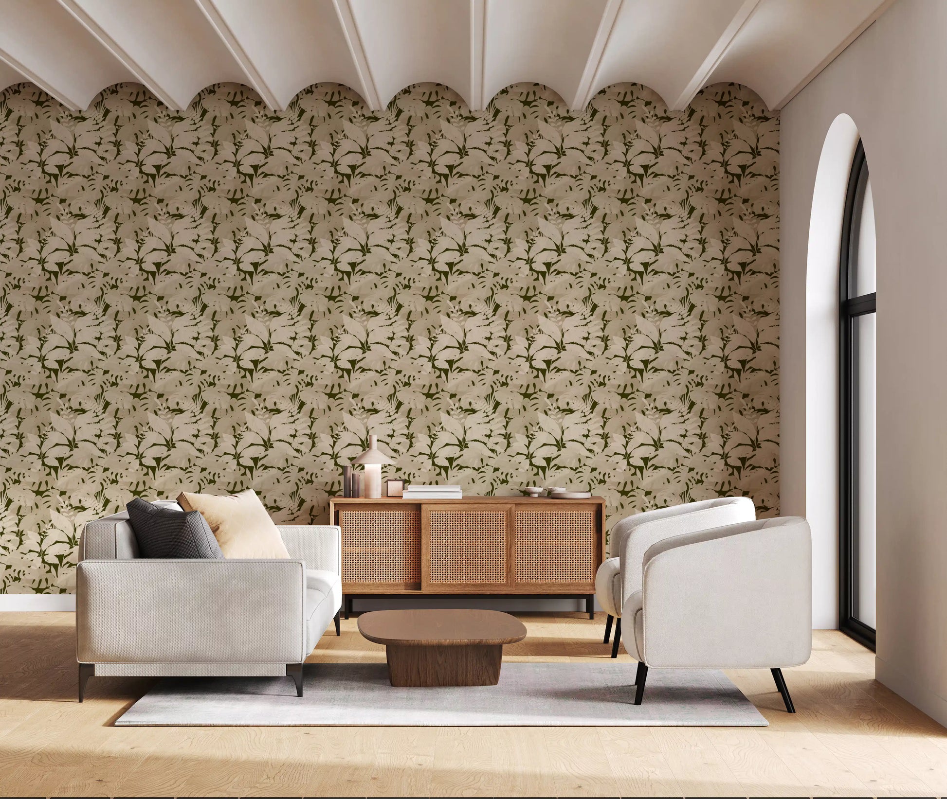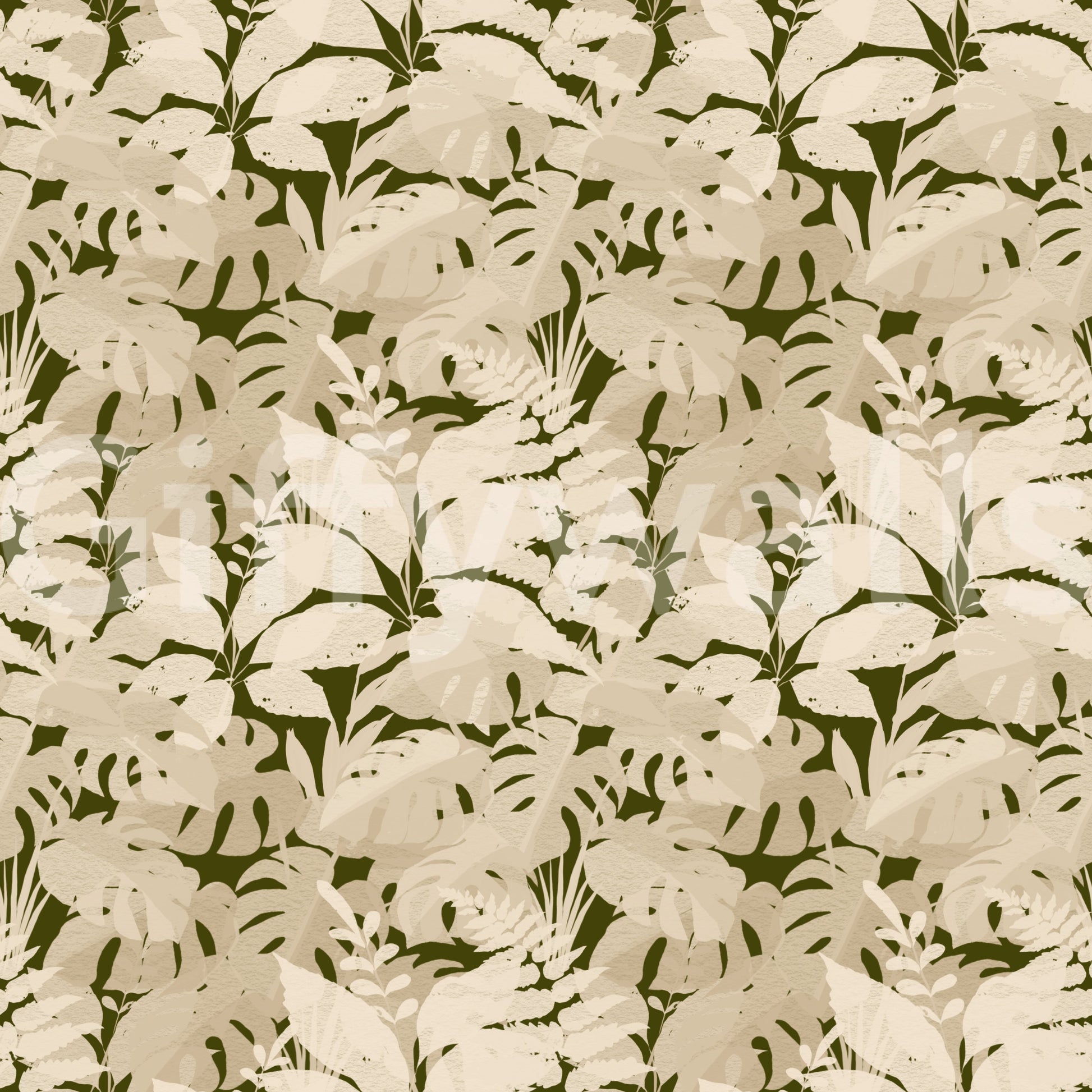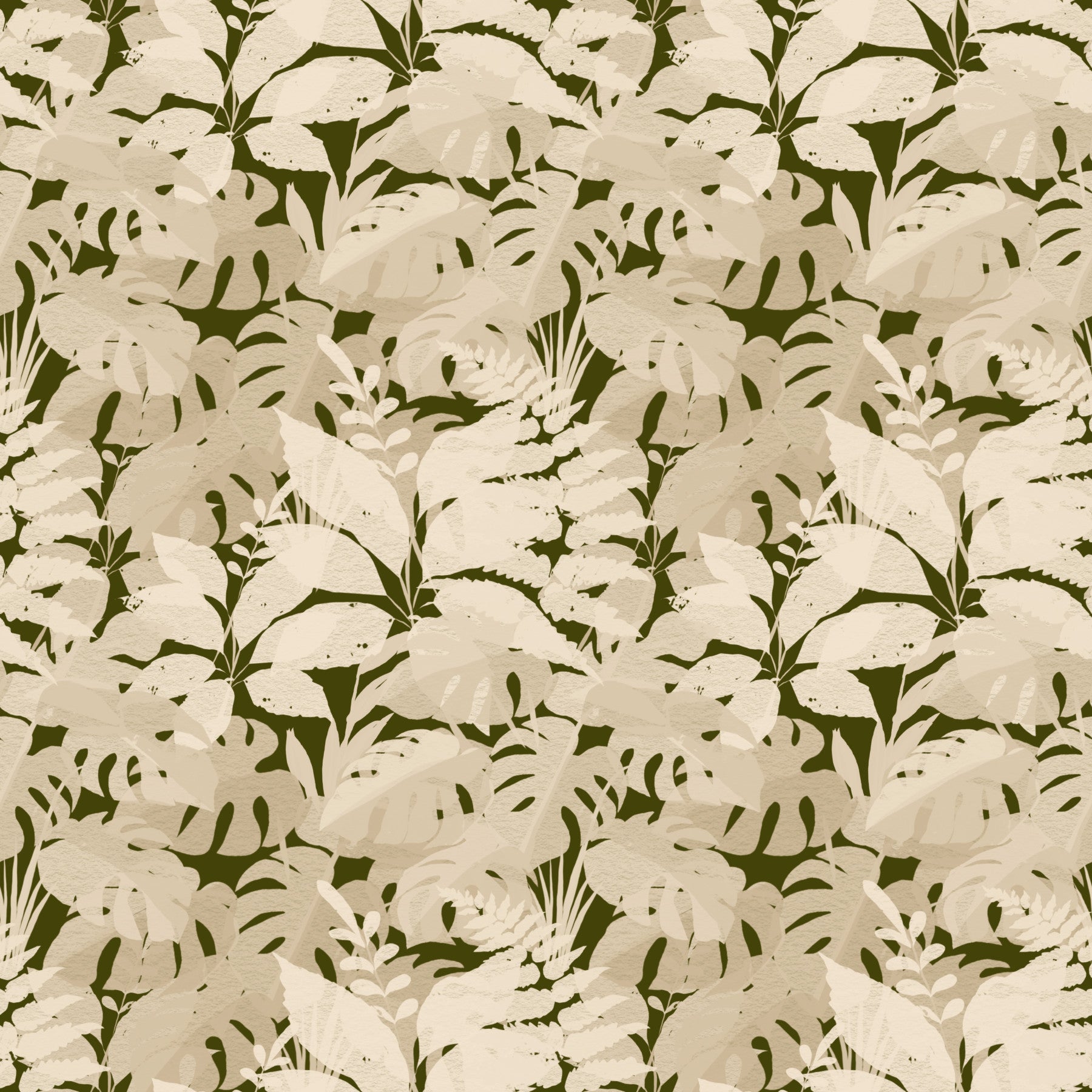This captivating wallpaper for walls transforms any room into a tranquil botanical retreat. A lush pattern of layered tropical leaves, including distinctive monstera and delicate ferns, creates an immersive natural design. The sophisticated color palette features a deep olive-green background, offering a striking contrast to the foreground's warm beige and cream foliage. This subtle, monochromatic scheme exudes an organic, serene elegance, perfectly complementing a modern or bohemian interior. Install this wallpaper in living rooms, bedrooms, dining areas, or even a serene home office to cultivate a calming atmosphere. Its intricate yet understated design adds depth and sophisticated texture, enhancing your space with timeless natural beauty.