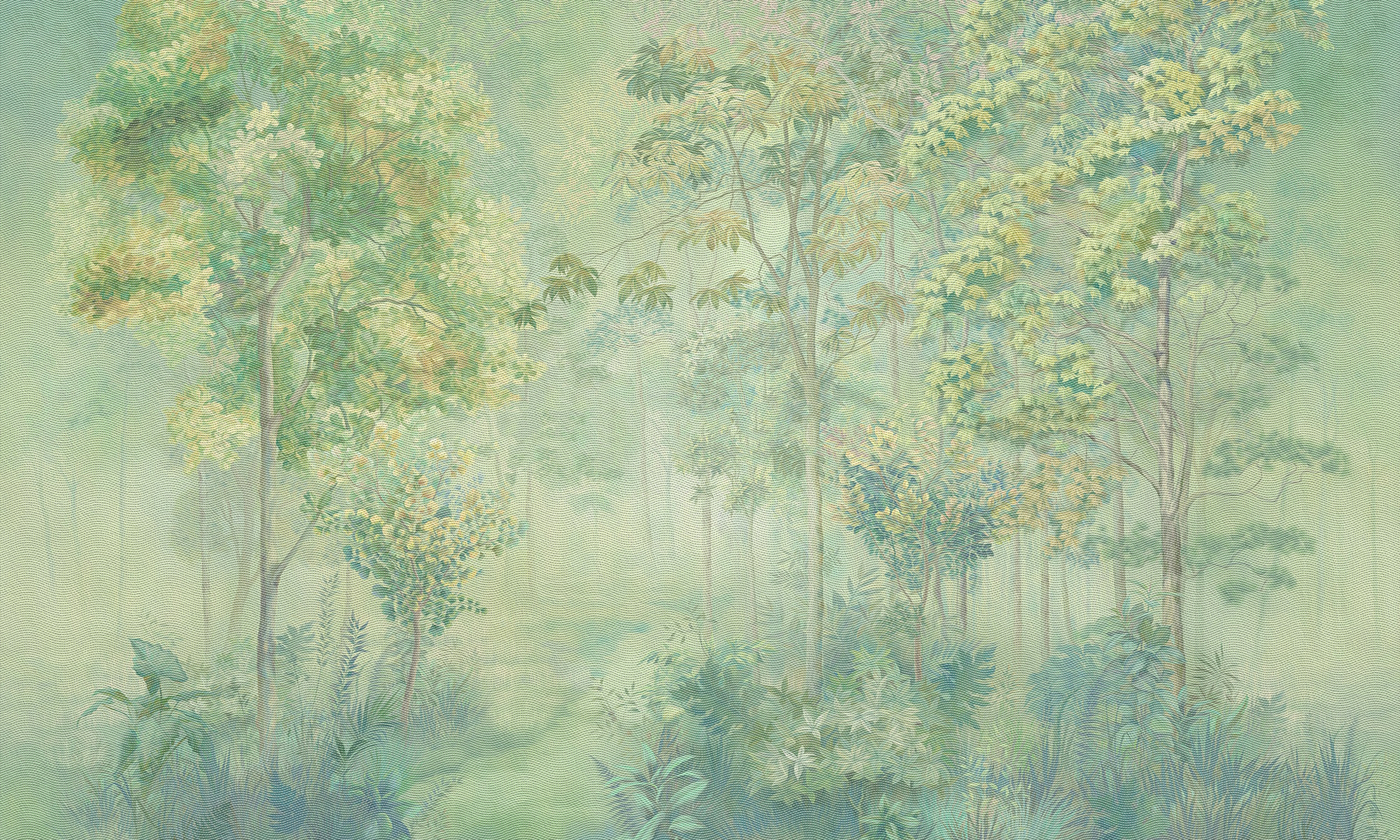 Serene Canopy Bliss by adding a wonderful wallpaper mural full of elegance along with nature. Elegant forest wallpaper featuring soft hues of luscious greens and delicacies of enormous towering trees plus subtle foliage detailing creates a magical and dreamy background that defines it as best for creating a calm ambiance in your living rooms or bedrooms or your offices. No matter whether modern interior design or old-fashioned furniture adorns it, this forest wallpaper turns any wall into a really interesting accent wall. Live in harmony with the soothing beauty of nature each day with this charming mural design.