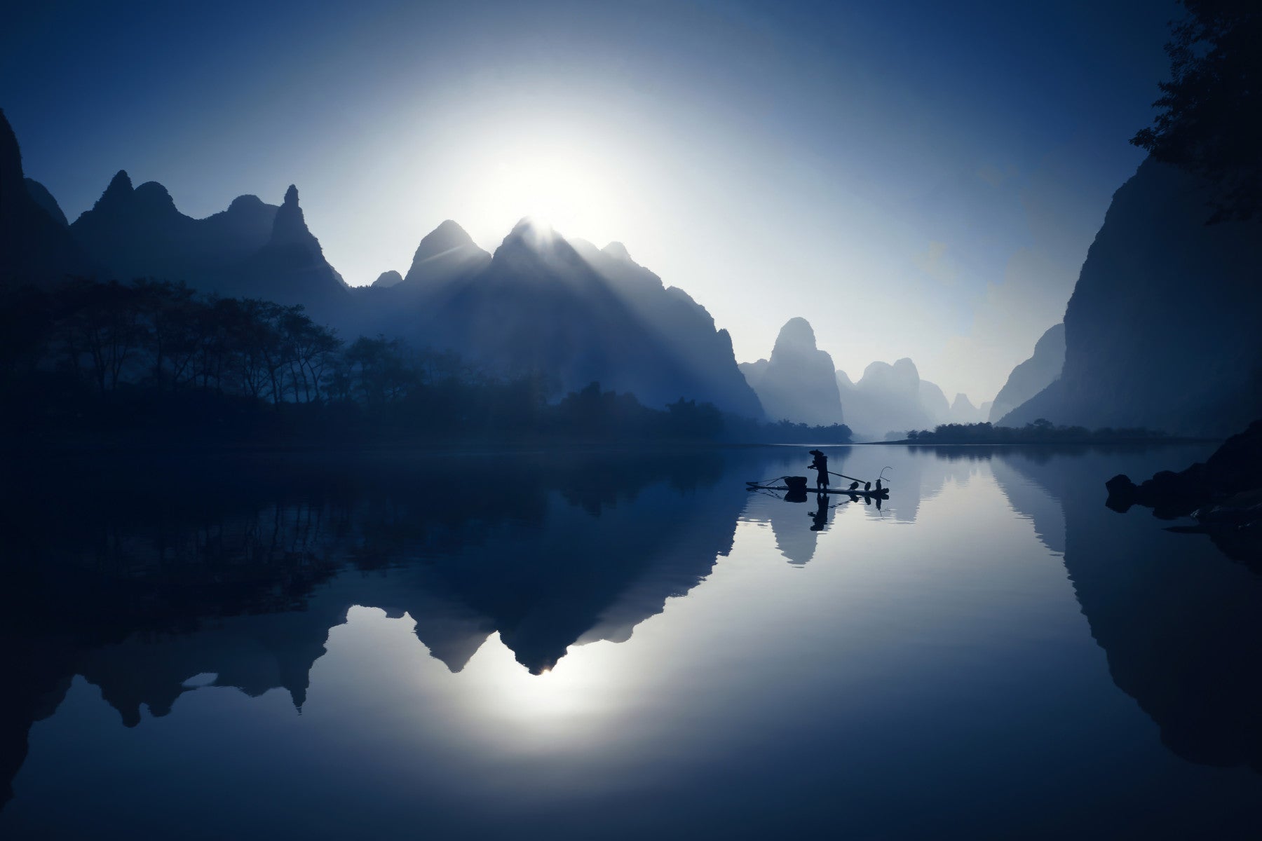 Serene Dawn: Yangshuo's Whisper Wall Mural in a sophisticated guest suite wallpaper.