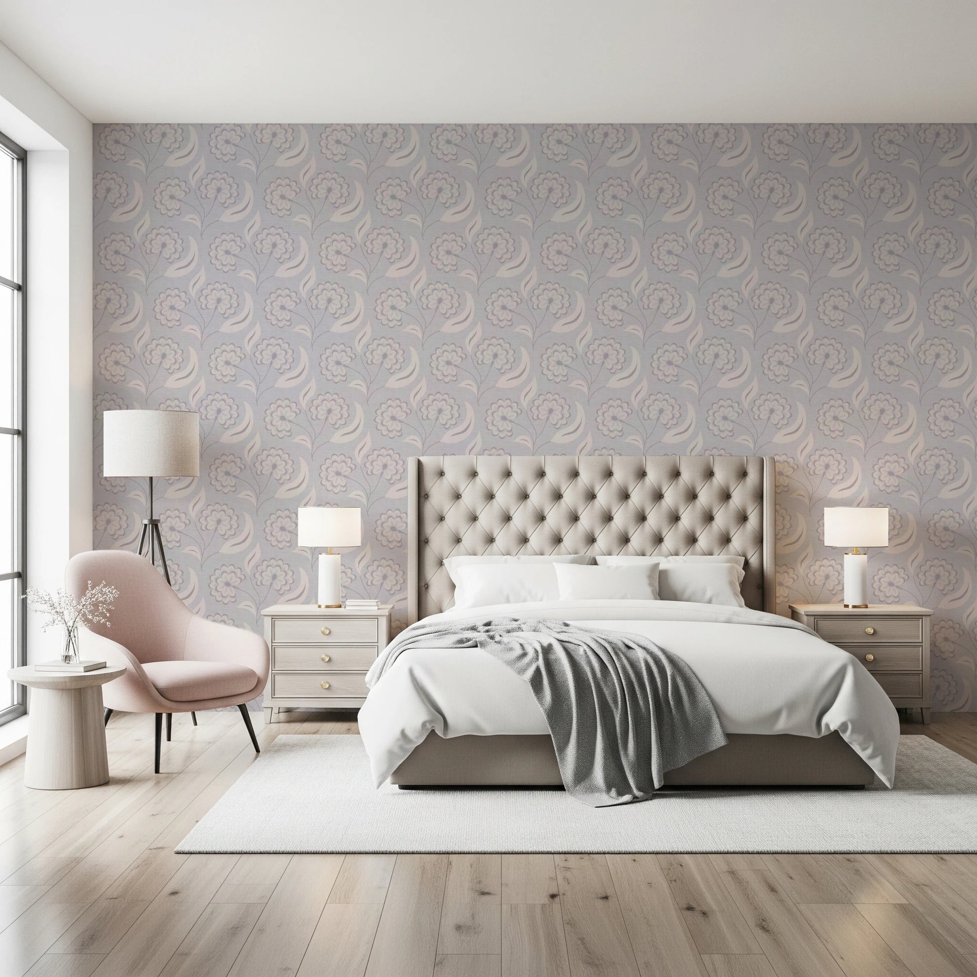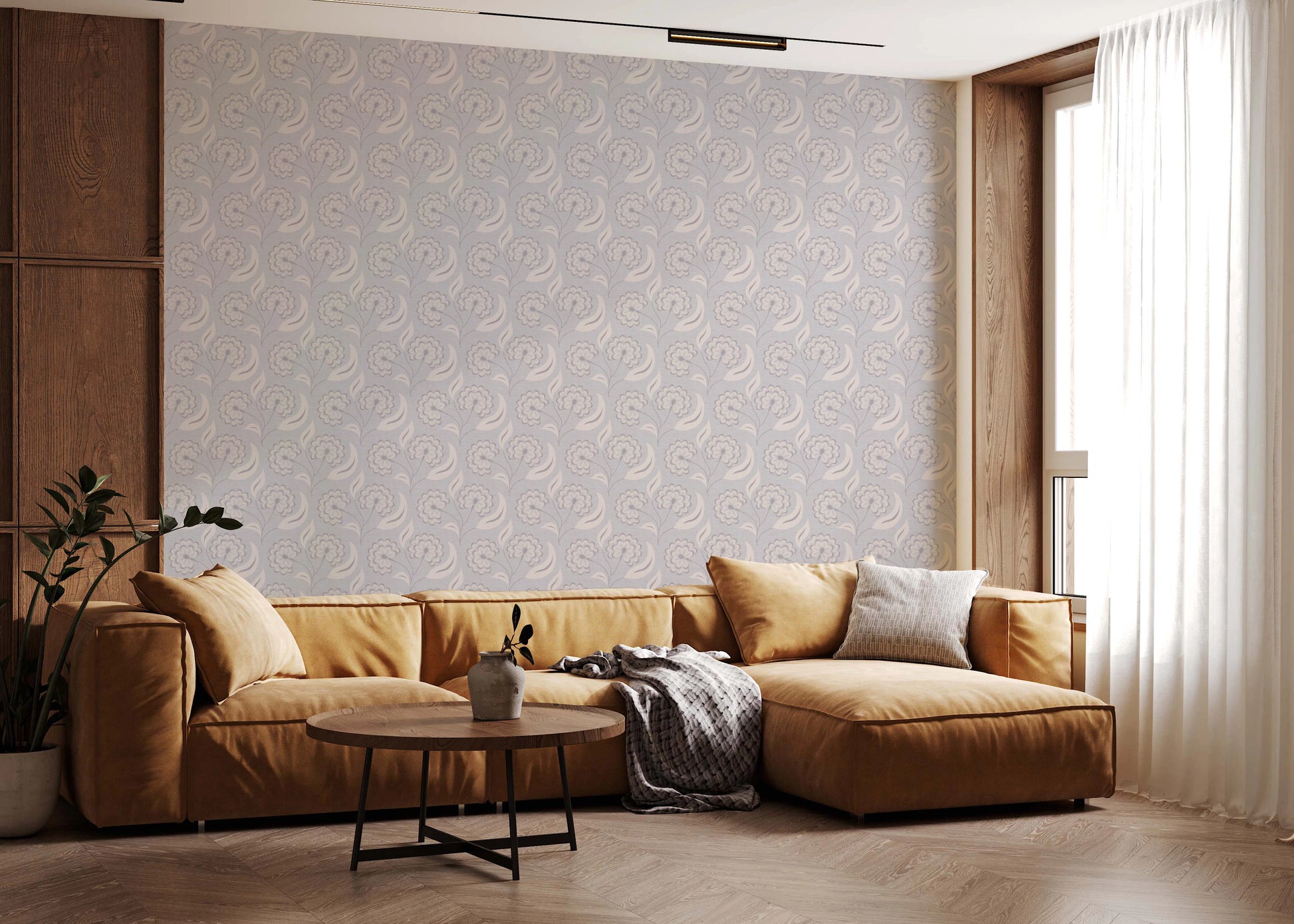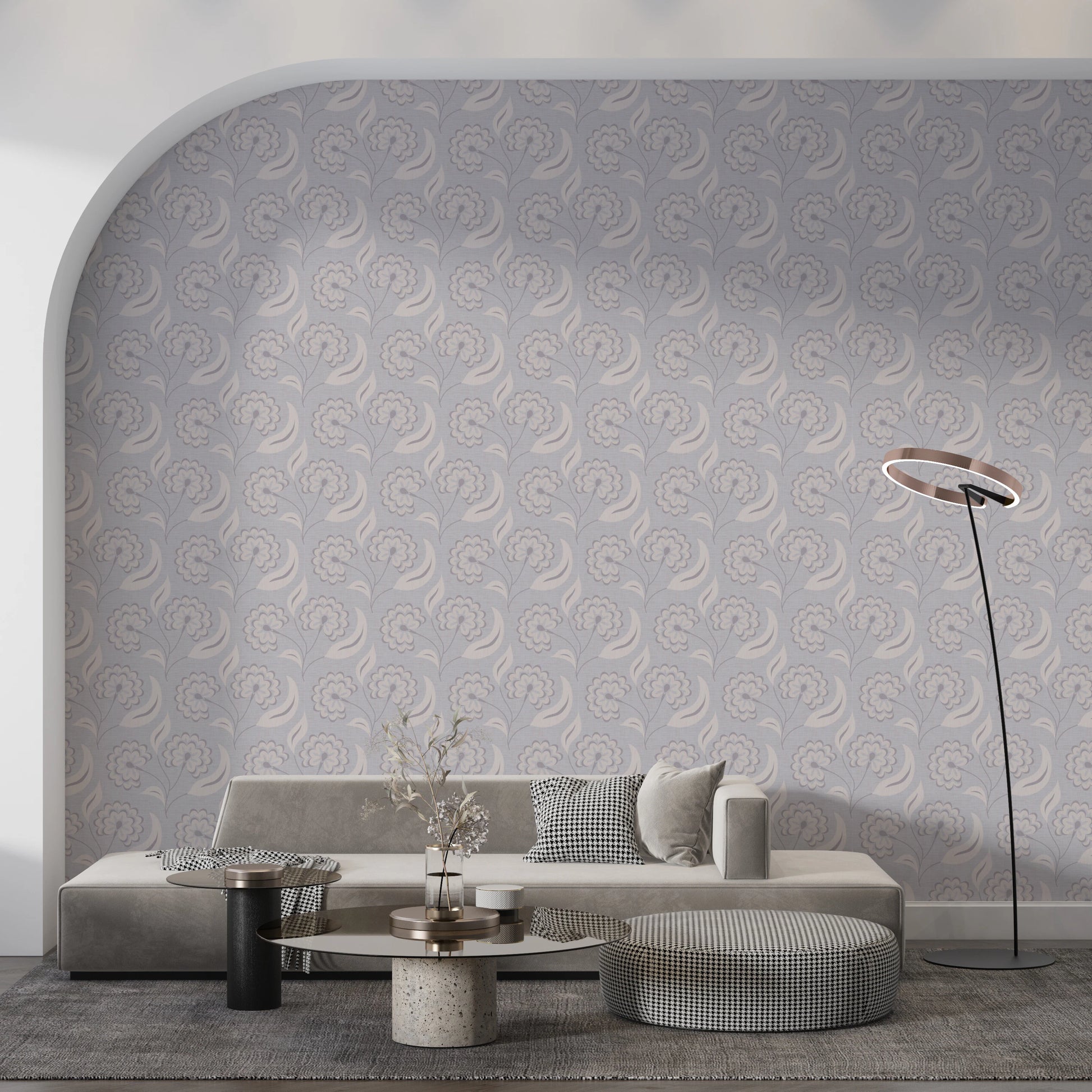Enhance your home's ambiance with this calming floral design. Gentle gray and beige hues create a peaceful backdrop for stylized flowers and leaves. This wallpaper for walls suits various spaces, including bedrooms, dining rooms, and hallways. The intricate floral pattern adds depth and a touch of vintage charm. Its soothing palette creates a relaxed environment, perfect for unwinding. The design complements both modern and traditional interiors, offering a balanced and refined aesthetic to your living space.