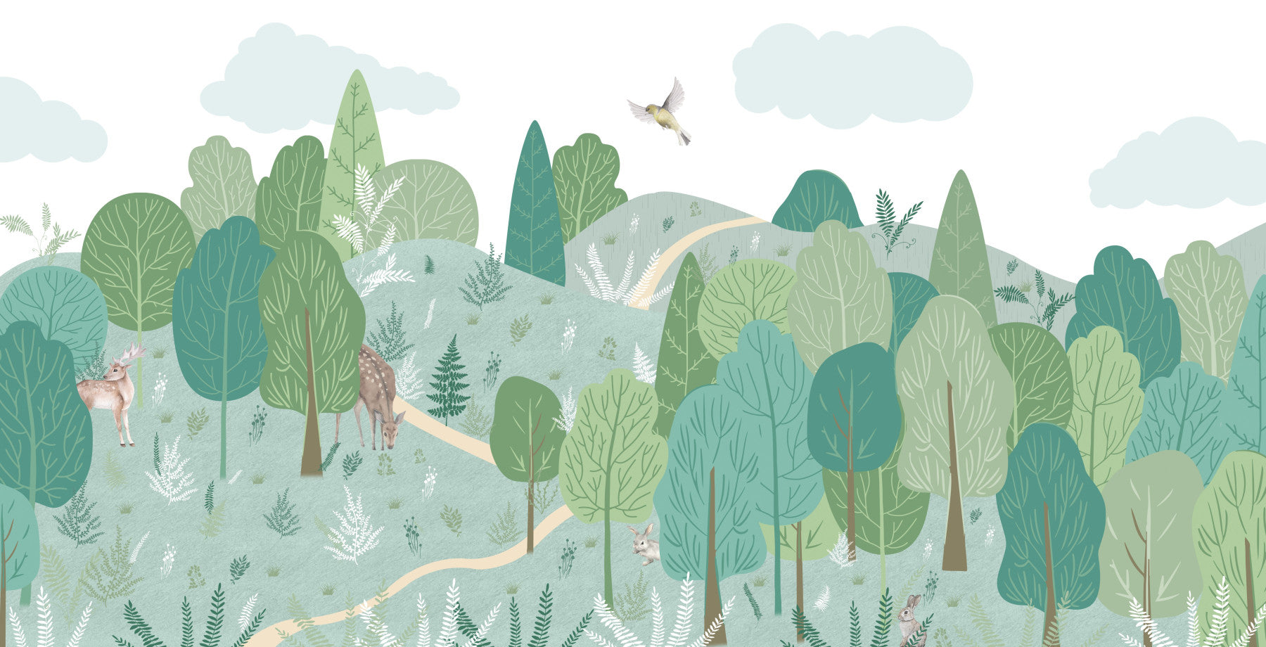 Bring the outdoors in with this tranquil wallpaper for walls. This nature-inspired design features a stylized forest landscape with playful animals such as deer and rabbits. The soft color palette with its shades of greens offers a calming effect. This wallpaper would transform any room into a peaceful retreat. Enliven your nursery, living room or bedroom. Its timeless design promises to integrate with various interior aesthetics.