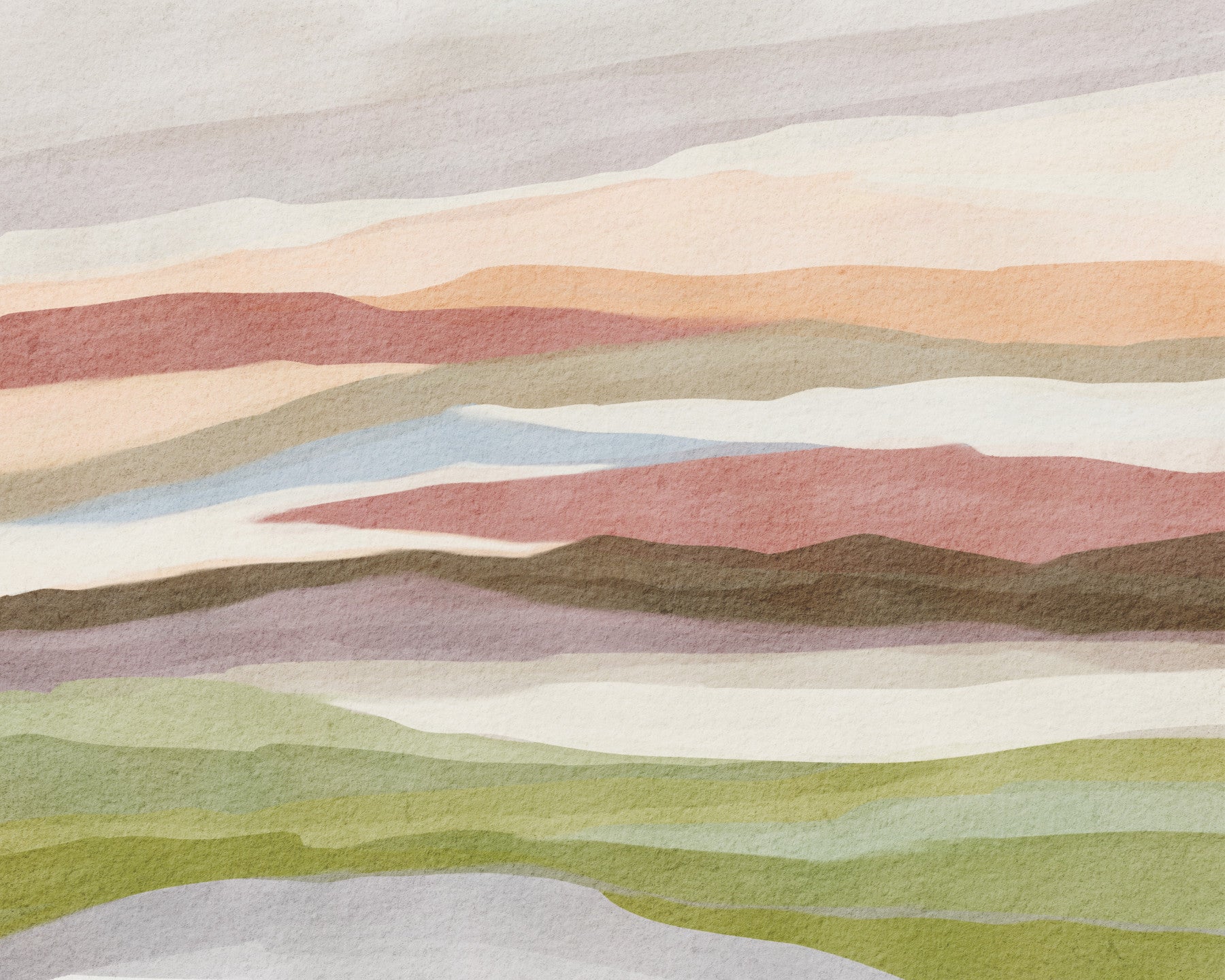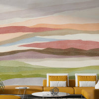 This wallpaper evokes a sense of calm and tranquility with its soft, muted color palette and gently undulating landscape. The watercolor-like texture adds depth and warmth, creating a soothing visual experience. The horizontal layers of color mimic rolling hills under a soft sky, promoting a feeling of peaceful contemplation. Perfect for bedrooms, living rooms, or any space where a relaxing and aesthetically pleasing atmosphere is desired. The muted tones blend seamlessly with various interior design styles, adding a touch of understated elegance to your home.