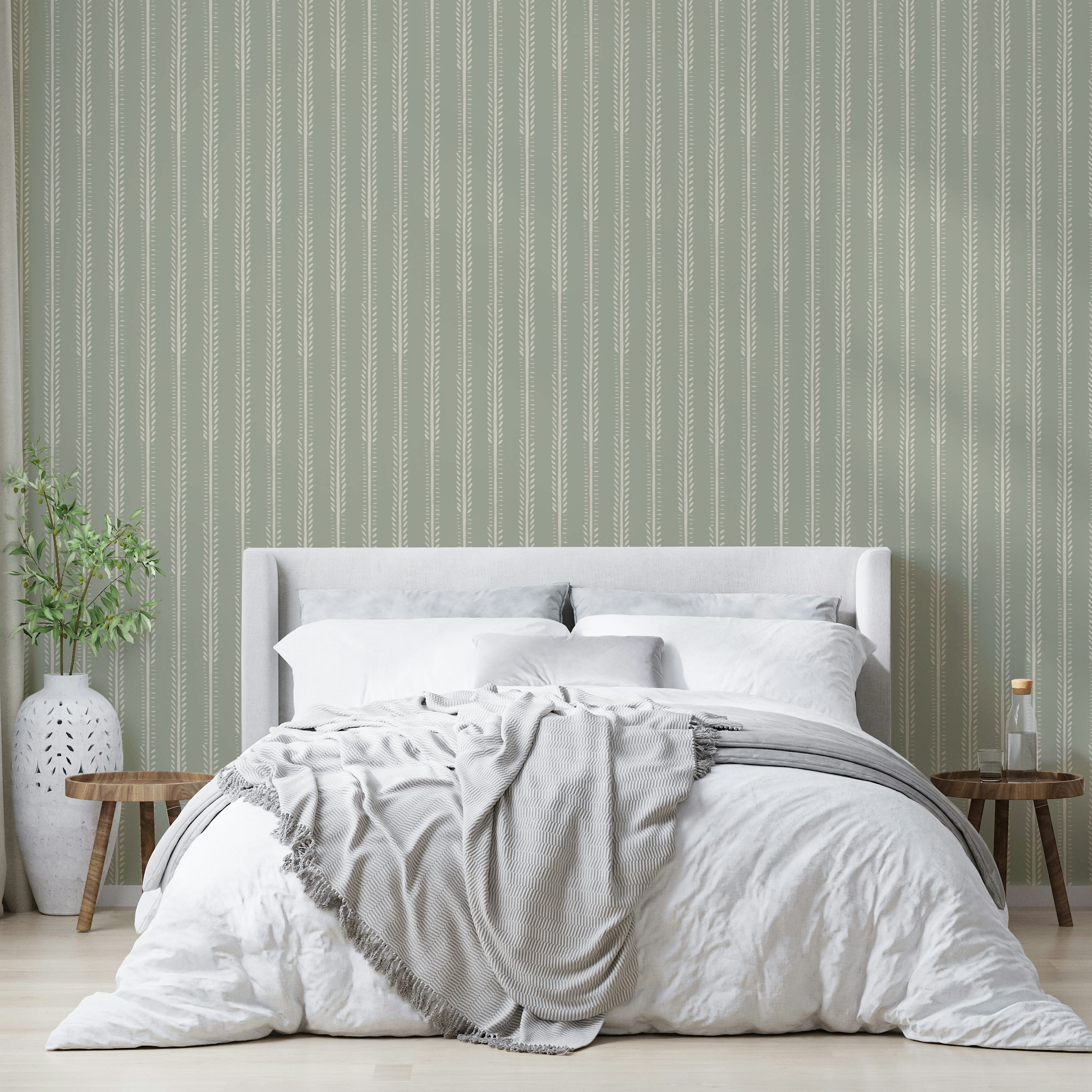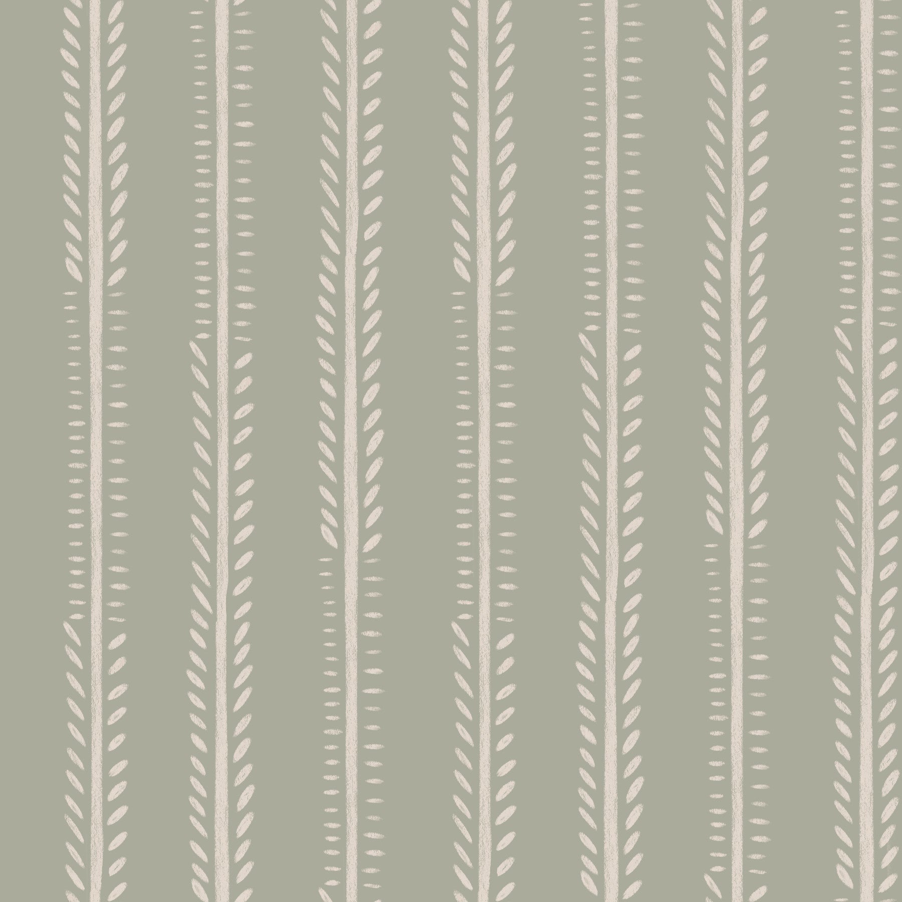 This wallpaper design features a calming and sophisticated pattern of vertical stripes in sage green and a soft off-white. The off-white stripes are adorned with a delicate, hand-drawn leaf motif, creating a subtle yet visually engaging texture. The color palette evokes a sense of tranquility and understated elegance, making it perfect for creating a serene atmosphere in any room. The seamless repeat pattern ensures a cohesive and harmonious look across walls, ideal for living rooms, bedrooms, or hallways. The minimalist design allows for versatility, complementing both modern and classic interior styles.