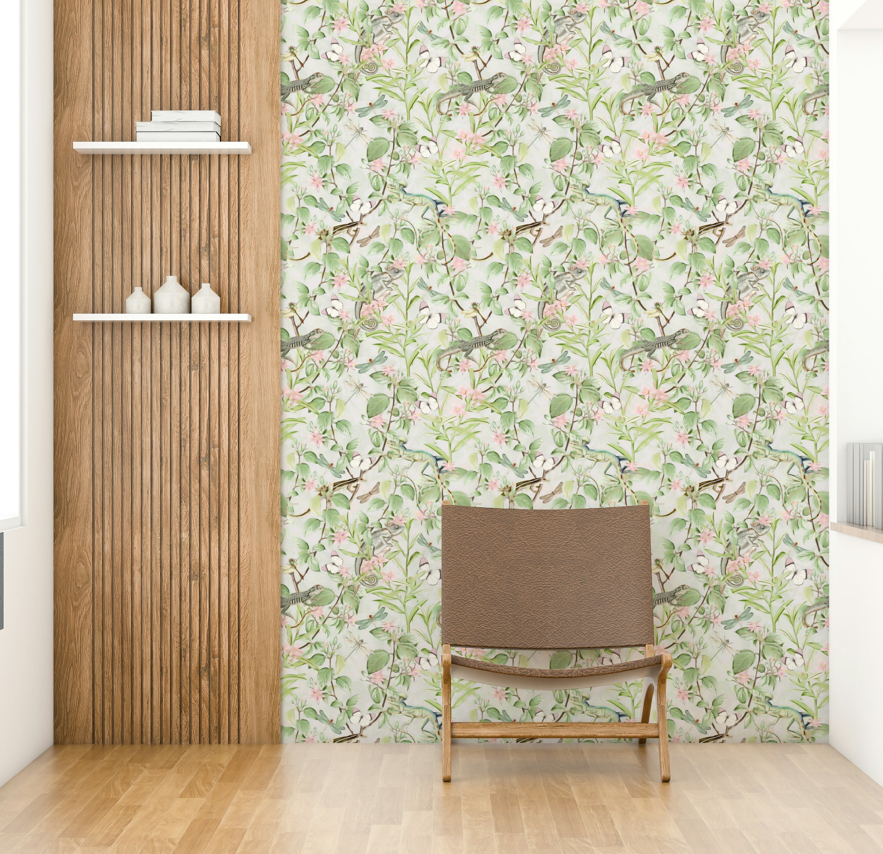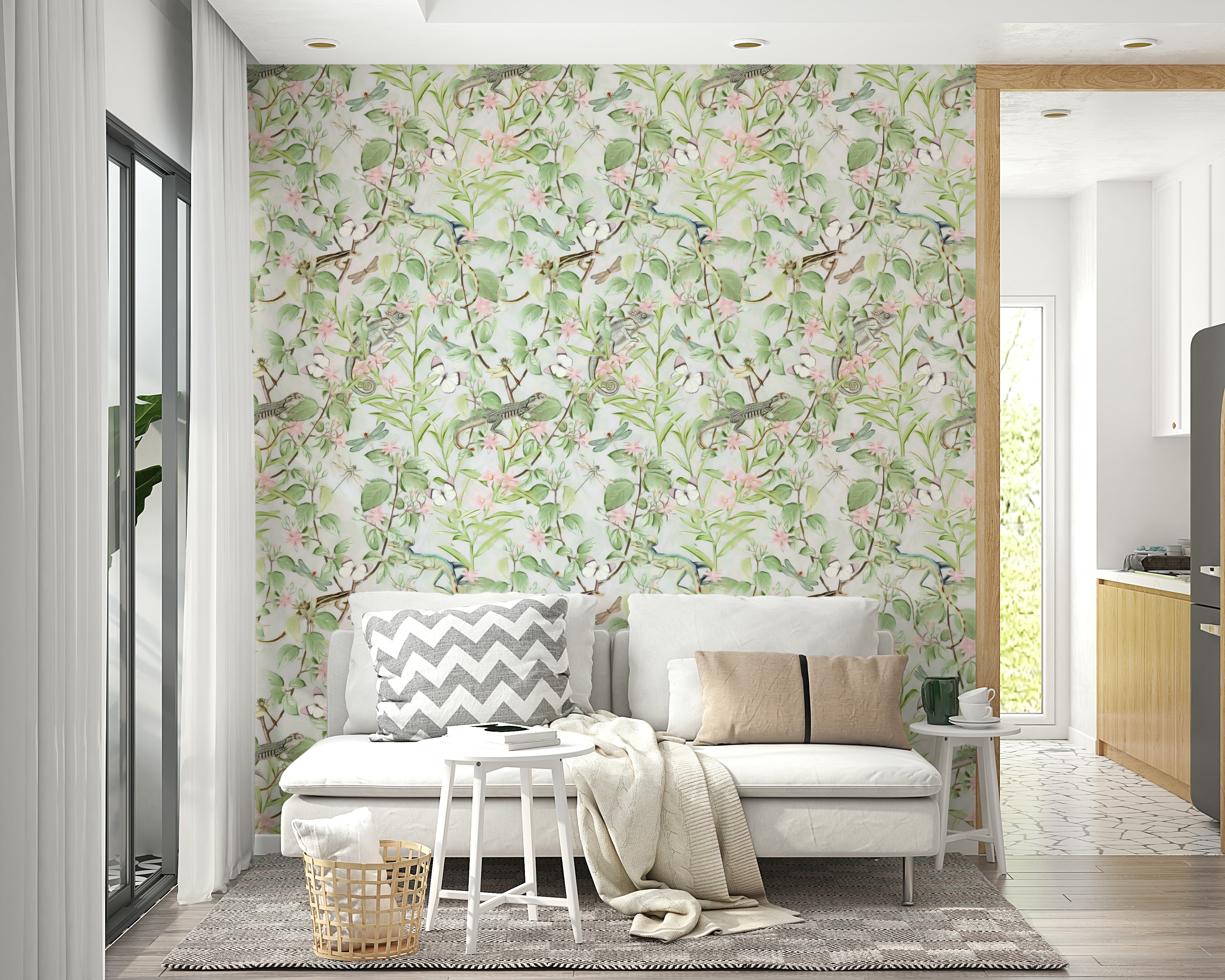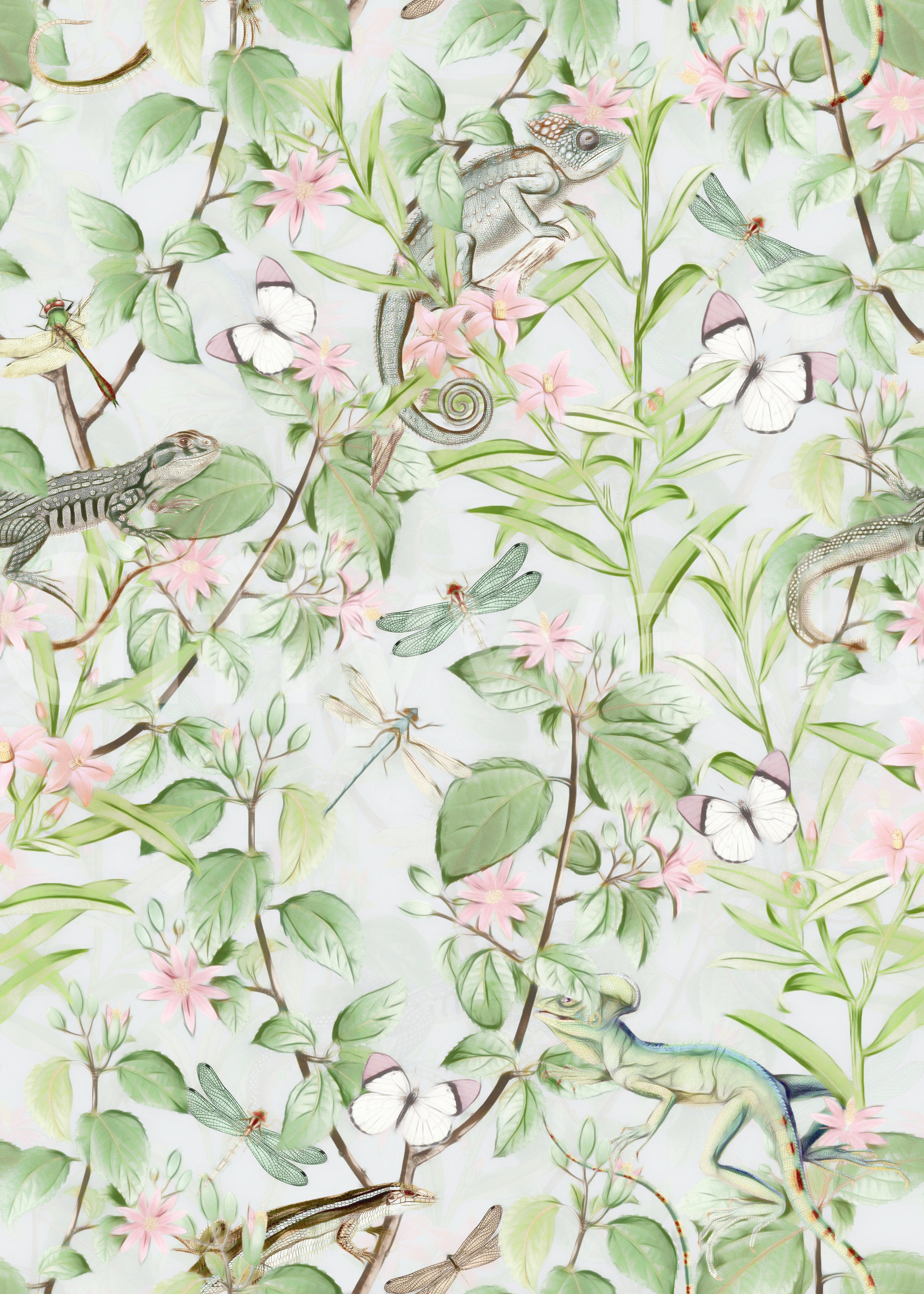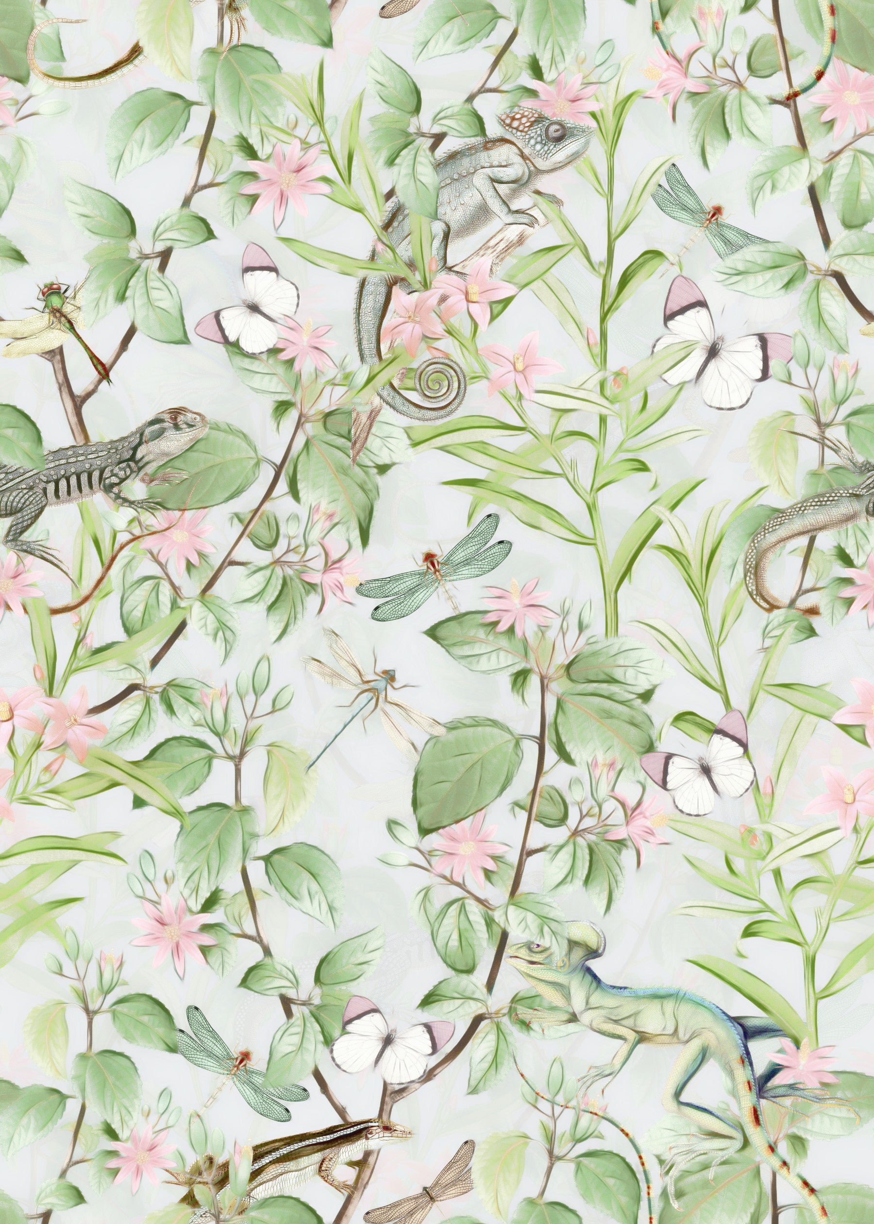 Escape into a tranquil oasis with this dreamy wallpaper. Delicate pink blossoms intertwine with lush green foliage, creating a serene backdrop for a collection of meticulously rendered chameleons, lizards, butterflies, and dragonflies. The soft pastel palette and detailed illustrations evoke a sense of calm and wonder, perfect for transforming any space into a peaceful retreat. The subtle interplay of light and shadow adds depth and dimension, while the seamless pattern ensures a cohesive and elegant aesthetic.