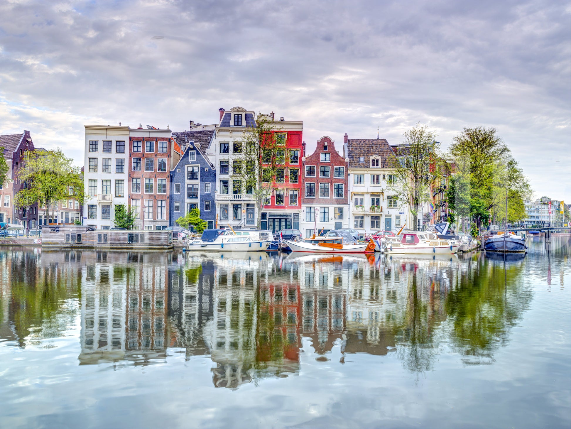 Amsterdam canal view with soft water reflections.