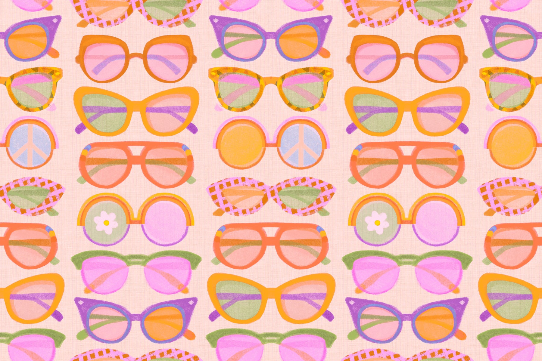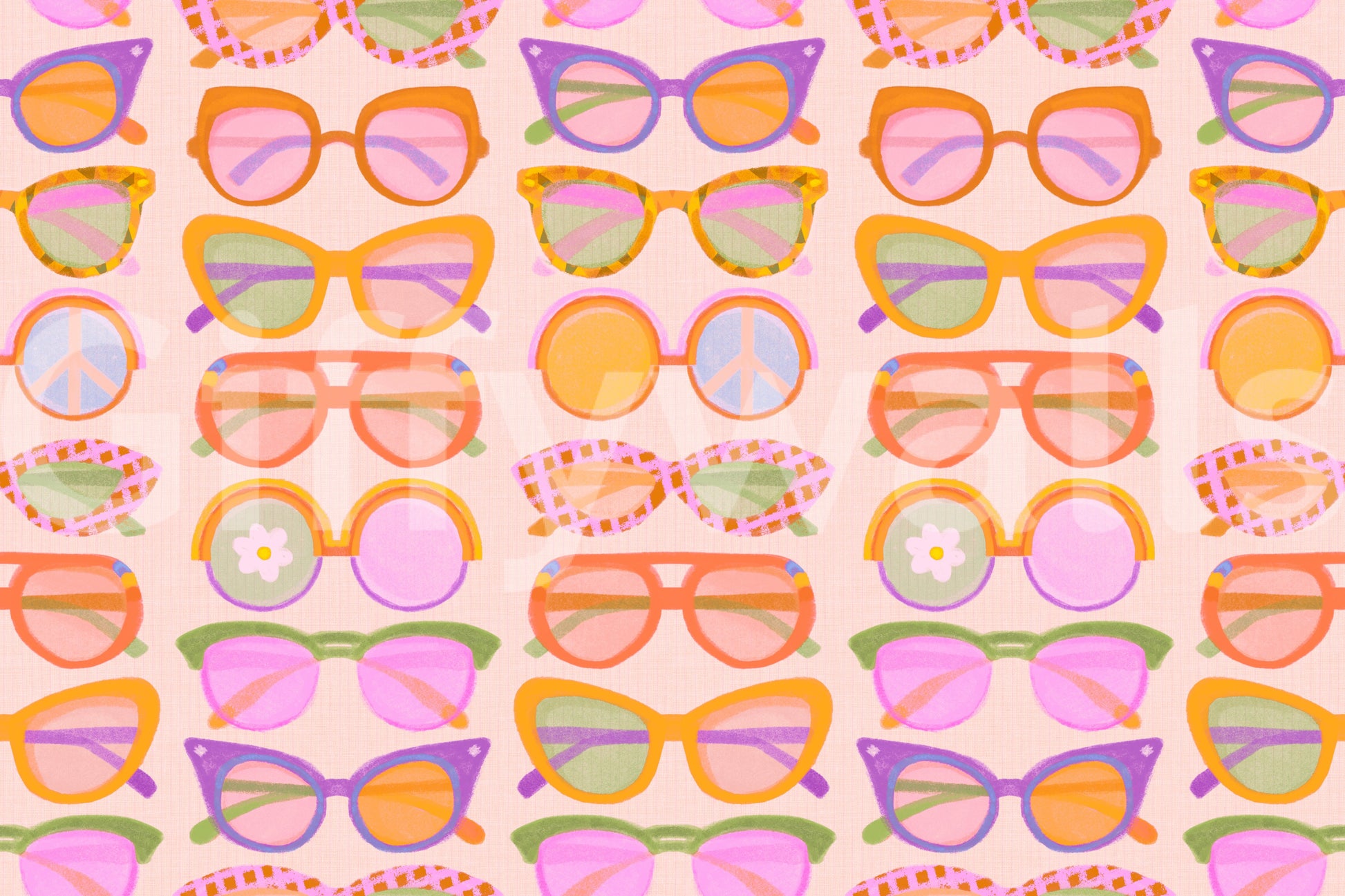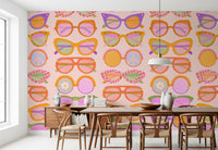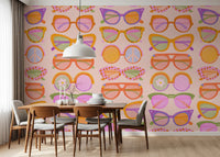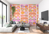 Bring a playful, sunny vibe to your walls with this “Shades of Cool” retro sunglasses pattern. Cat-eye, round, and oversized frames float across a soft peach background with subtle linen texture and delicate vertical stripes. Lenses glow in pastel pink, mint, lavender, and warm orange, with fun details like checkered rims, stripes, peace icons, and tiny flowers. Fresh, nostalgic, and full of personality, this design is perfect for girls’ and teens’ bedrooms, dressing areas, hallways, or creative studios. A bold and joyful statement for anyone who loves fashion-forward details, bright colour, and walls that make you smile every day.