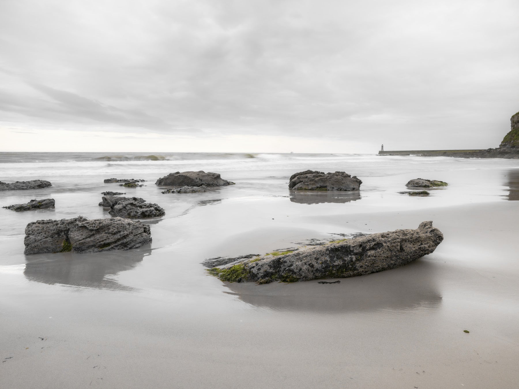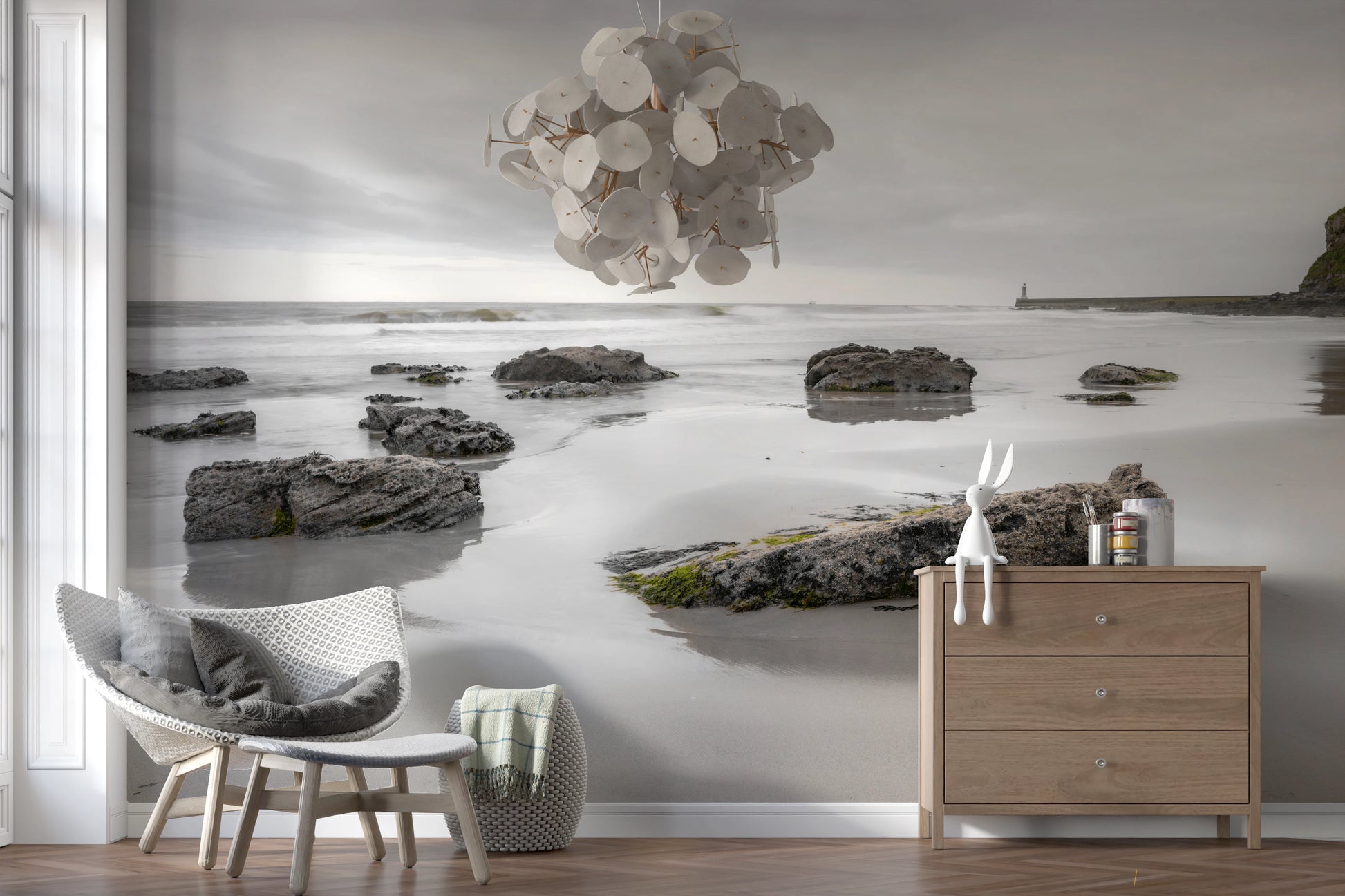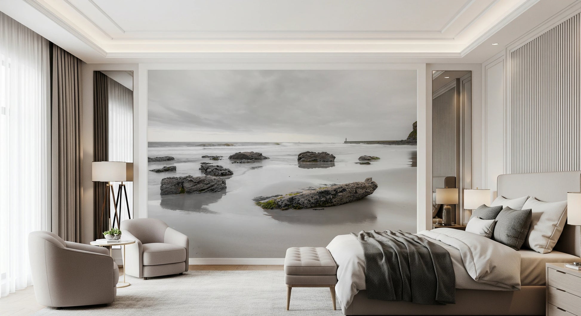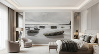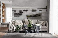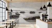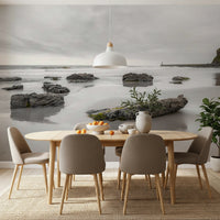 Bring the calming presence of the ocean into your home with this tranquil shoreline wallpaper for walls. The soft, neutral color palette, with its blend of misty grays and gentle creams, creates a soothing ambiance. The scene of rocks on the beach under a cloudy sky offers a sophisticated, natural aesthetic. This wallpaper is ideal for a master bedroom, a home office, or any space where a relaxed and reflective mood is desired. Elevate your interior design with this peaceful and elegant addition, which brings the serenity of the coast to your space.