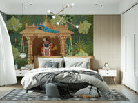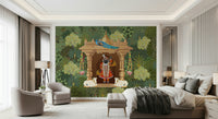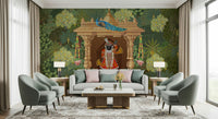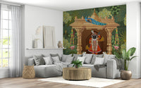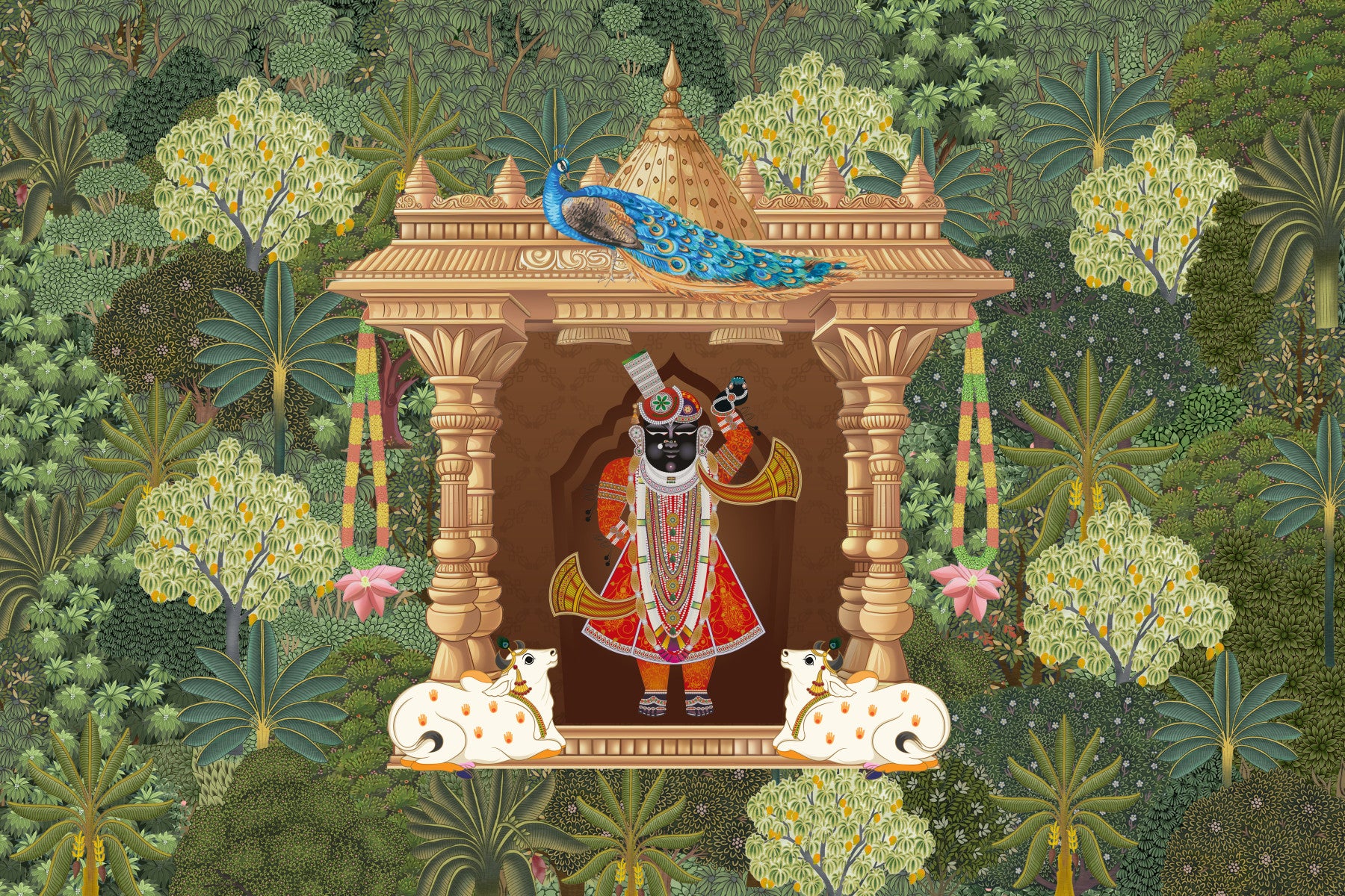 Transform your space into a haven of serenity with this exquisite wall décor inspired by the Shrinathji Sanctuary. Immerse yourself in a lush tapestry of verdant foliage, where intricate details evoke a sense of peace and devotion. At the heart of this piece, a beautifully rendered Shrinathji stands within a detailed golden temple, a symbol of divine grace and spiritual refuge. A magnificent peacock, perched atop the temple, adds a touch of regal splendor, while gentle cows rest peacefully below. The vibrant colors and meticulous artistry capture the essence of traditional Indian artistry, creating a sophisticated and soul-stirring ambiance. Allow this work to invite a sense of tranquility and timeless beauty to any room, creating a sanctuary of reflection and serenity within your home. Each element has been thoughtfully crafted to bring warmth, peace, and a touch of the divine to your space.